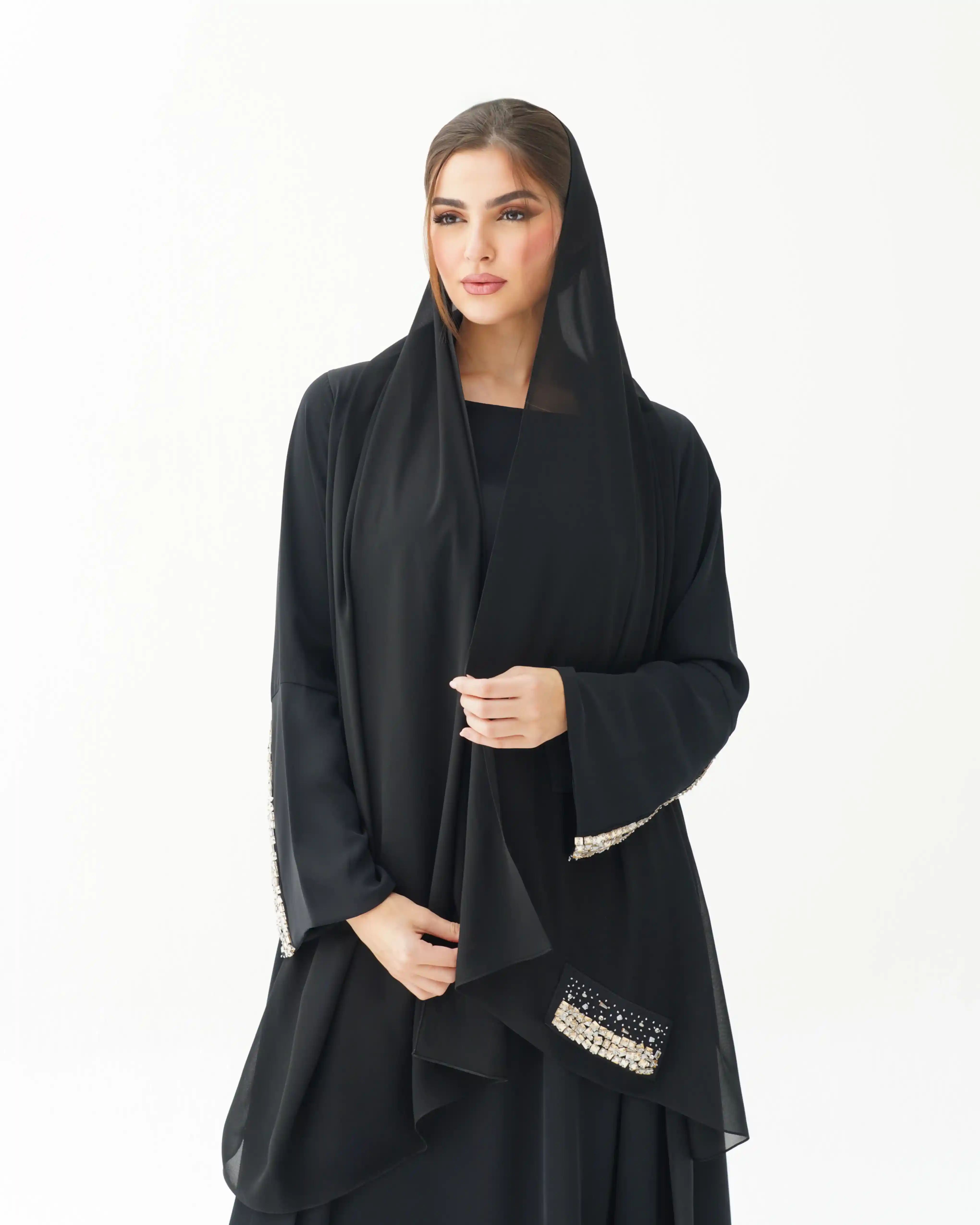 • طرحة مع العباية مطرزة بالكريستال والخزر بطرف الطرحة.
