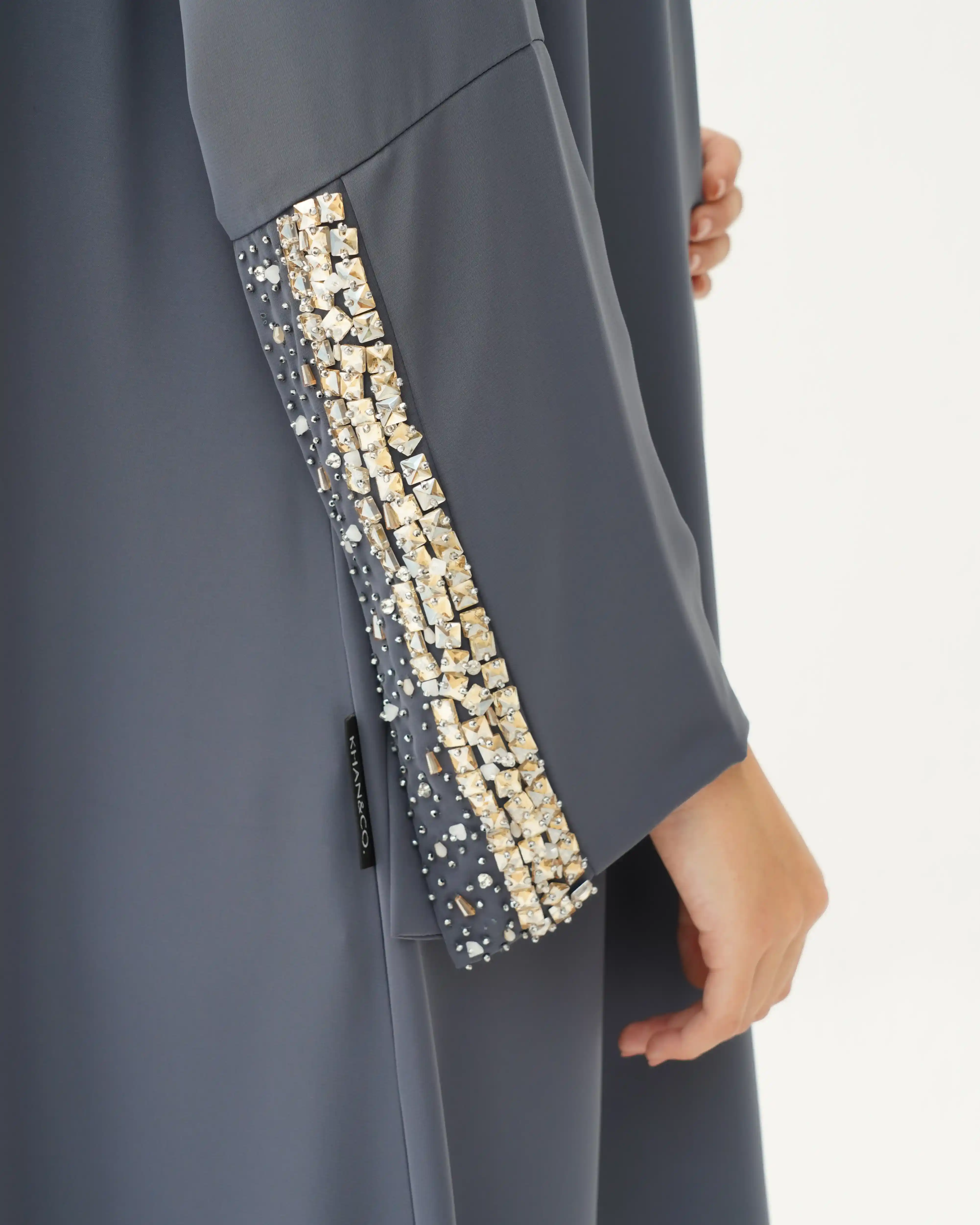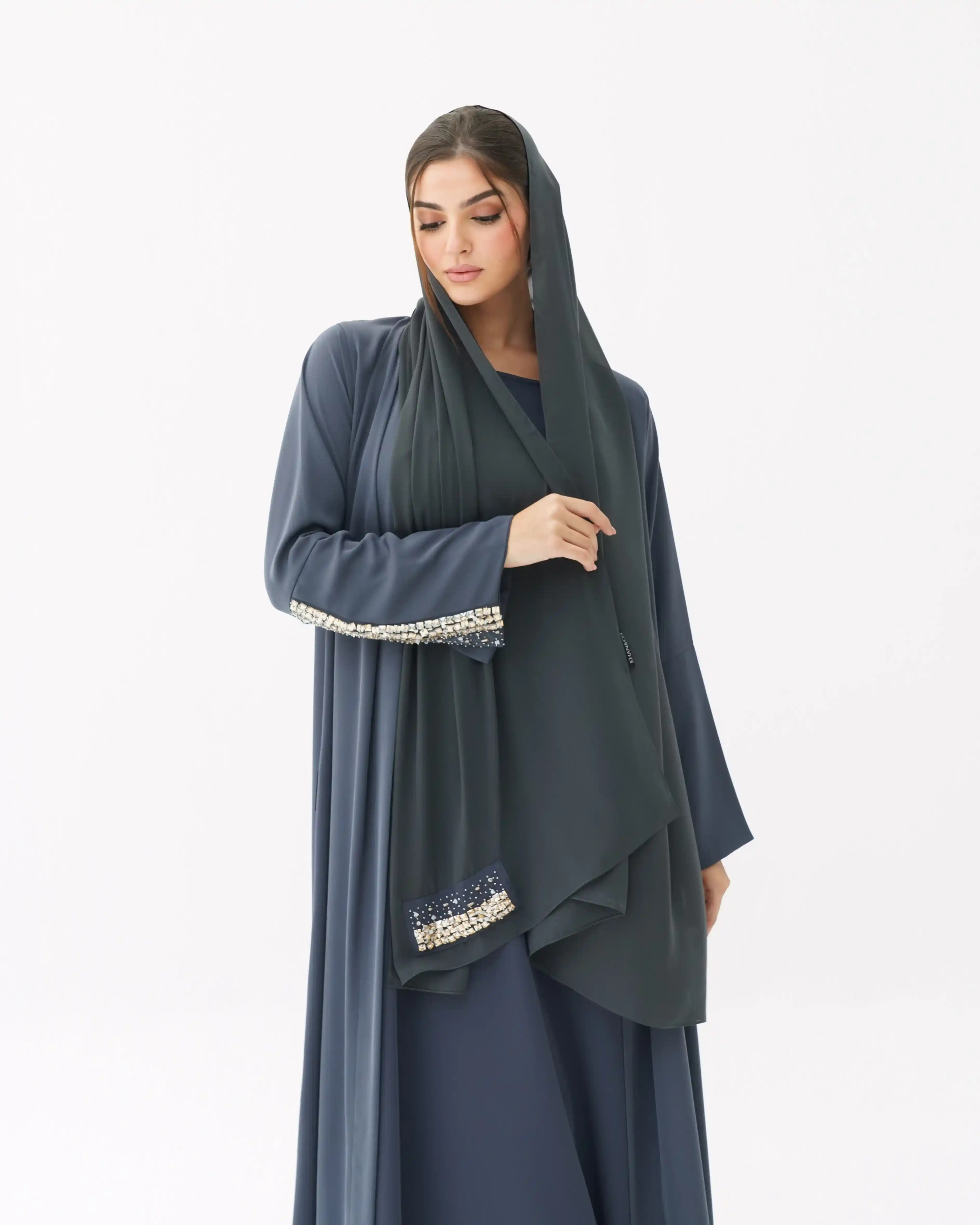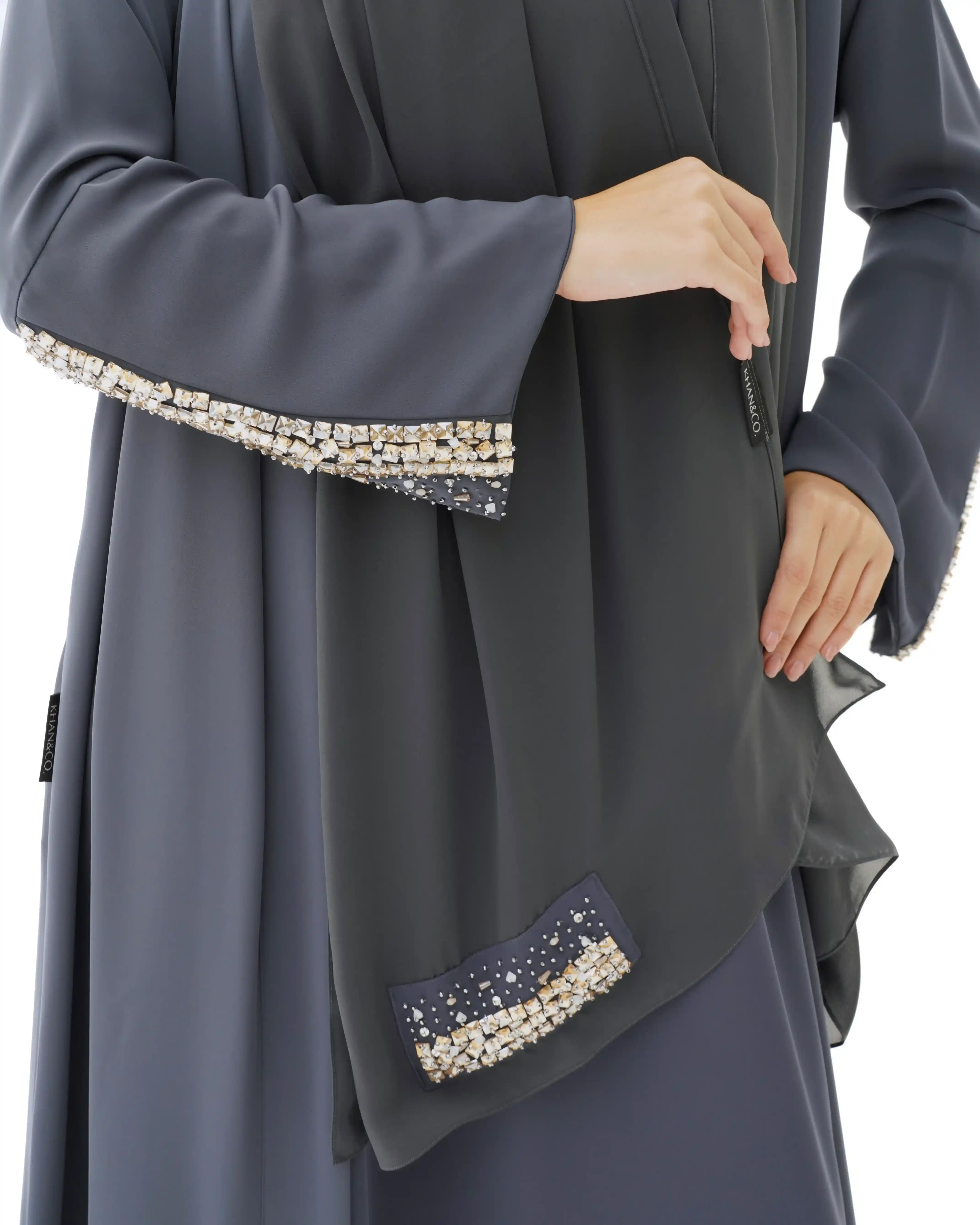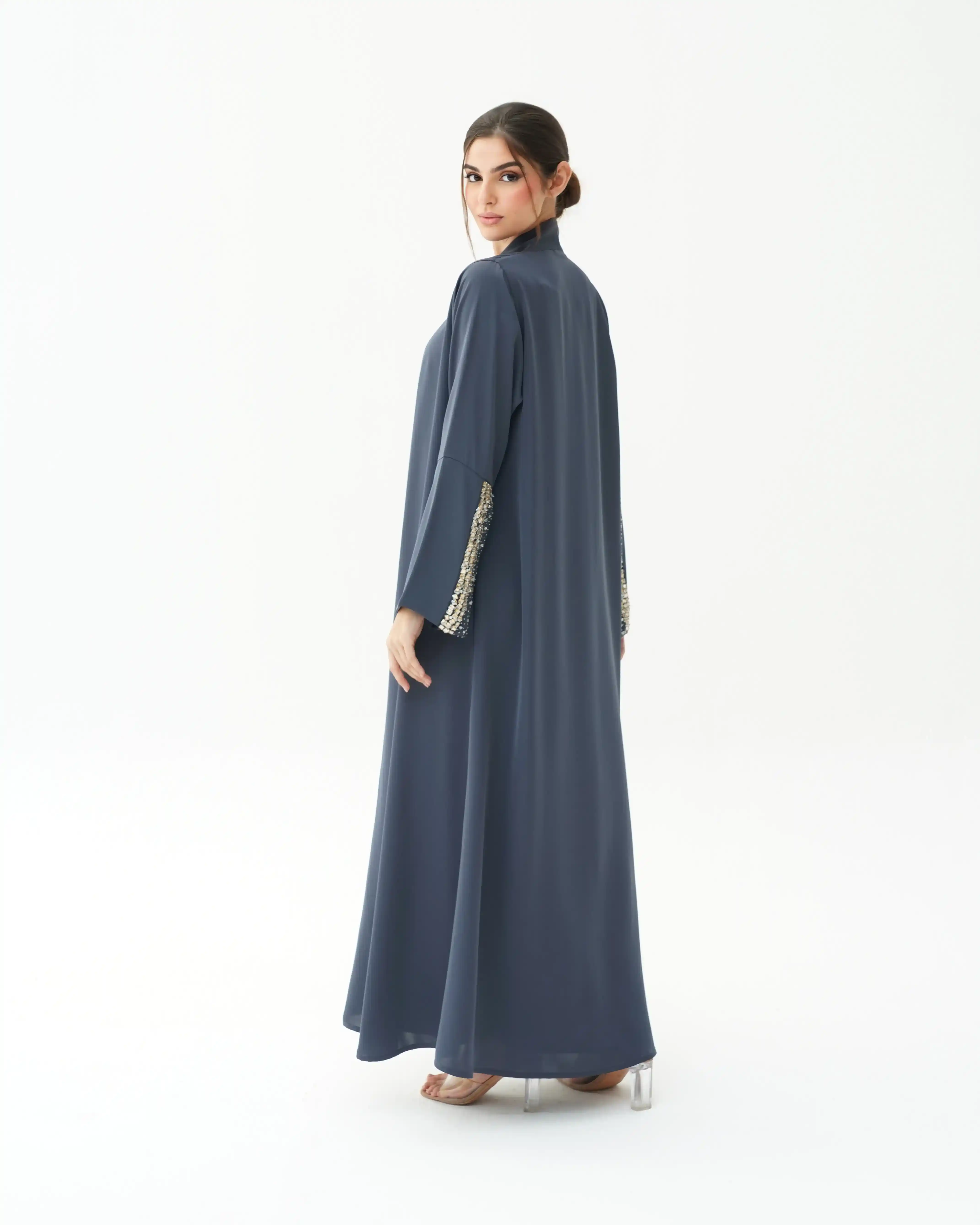 اطلالة انيقة بدون عناء لوجود قطعة فستان داخلي معها، فهذه العباية بالقصة اللف المبتكرة تأتي بنمط متداخل على شكل حرف x تلتف من خلف الرقبة بشريط ياقة الى اخر ذيل العباية وتزدان الاكمام بكريستال بلون الذهبي مشتغلة يدويا ومدموجدة مع خرز لتضفي لمسة اهتمامنا بالتفاصيل الدقيقة التي من خلالها اكتسبت العلامة شهرتها الواسعة في المملكة العربية السعودية كما تتميز العباية بقماش خفيف الوزن منسدل يضفي الانسيابية المطلوبة للتصميم. ويمكن ارتداؤها مفتوحة مع الفستان الداخلي او بطريقة اللف.