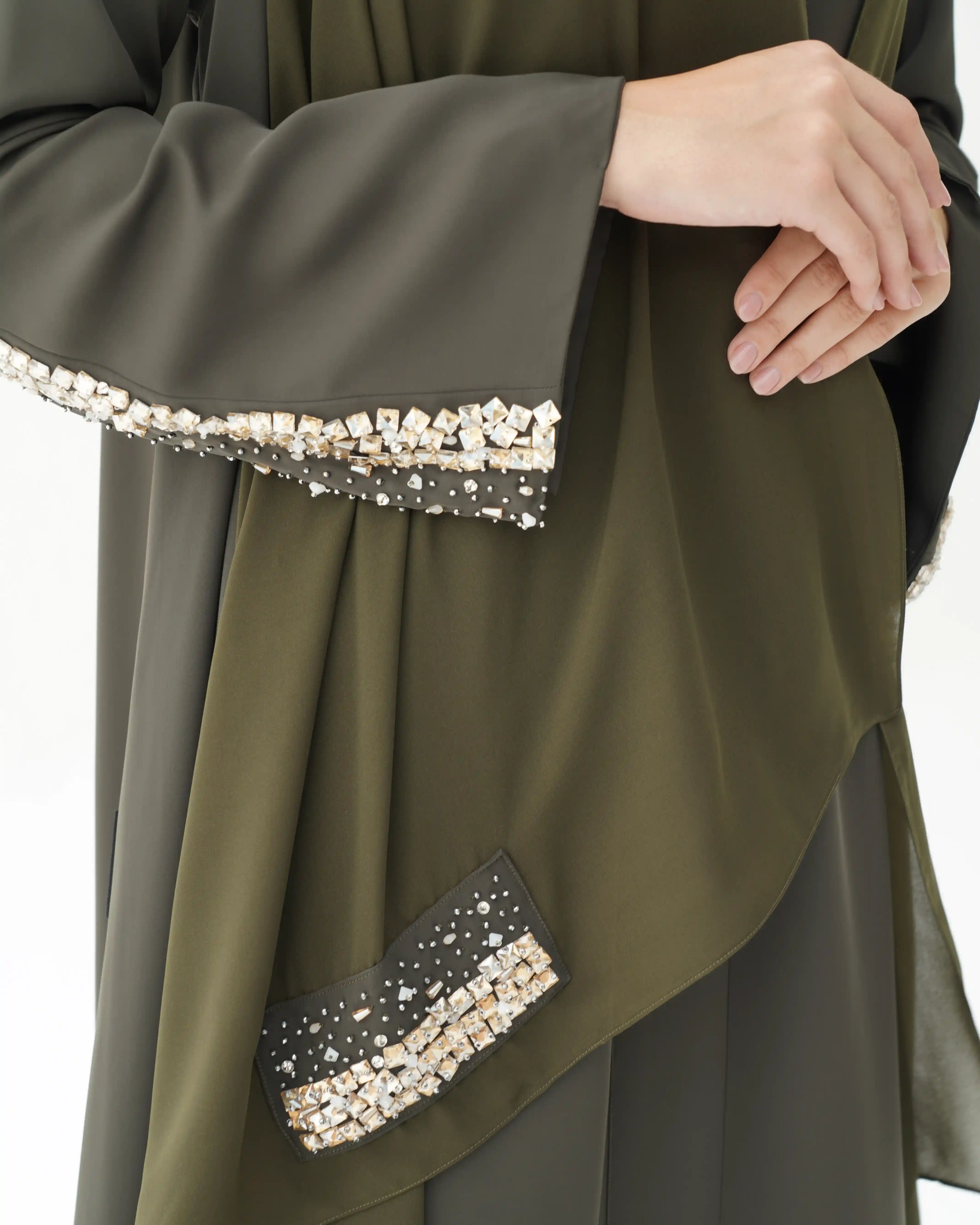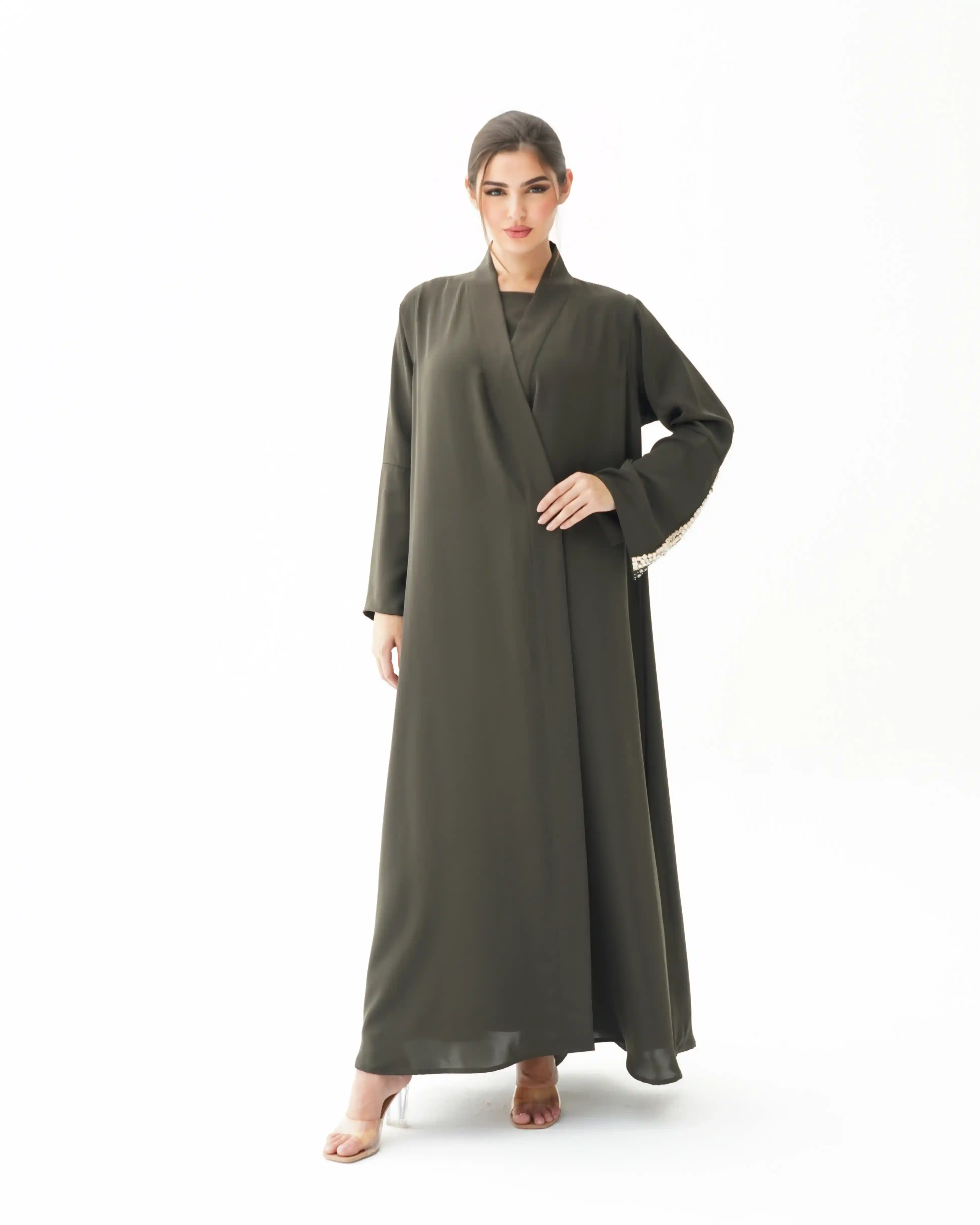 اطلالة انيقة بدون عناء لوجود قطعة فستان داخلي معها، فهذه العباية بالقصة اللف المبتكرة تأتي بنمط متداخل على شكل حرف x تلتف من خلف الرقبة بشريط ياقة الى اخر ذيل العباية وتزدان الاكمام بكريستال بلون الذهبي مشتغلة يدويا ومدموجدة مع خرز لتضفي لمسة اهتمامنا بالتفاصيل الدقيقة التي من خلالها اكتسبت العلامة شهرتها الواسعة في المملكة العربية السعودية كما تتميز العباية بقماش خفيف الوزن منسدل يضفي الانسيابية المطلوبة للتصميم. ويمكن ارتداؤها مفتوحة مع الفستان الداخلي او بطريقة اللف.