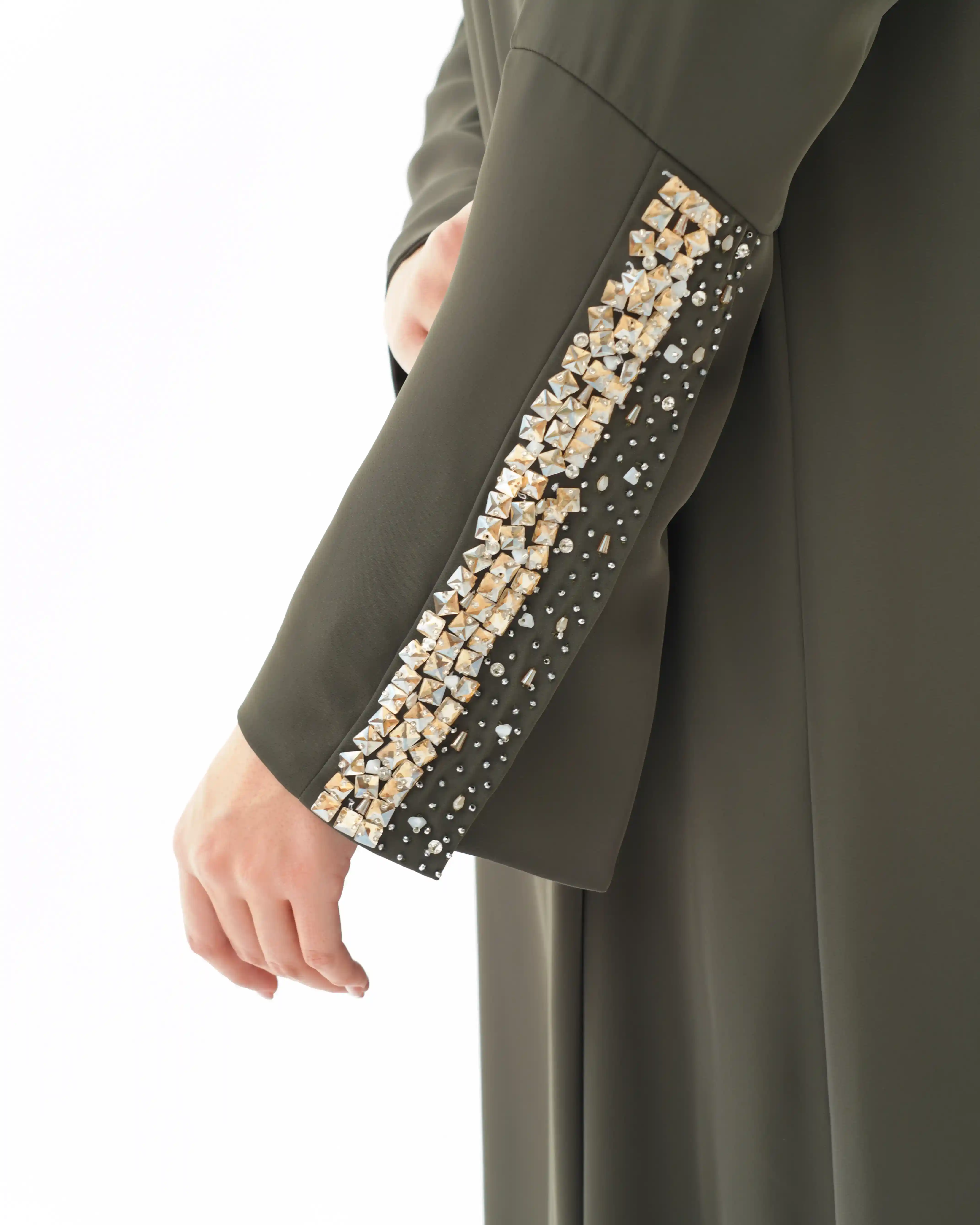 • تطريز بالكريستال بلون الذهبي مدموج بالخرز بشكل يبدأ مصفوف ويتناثر تدريجيا في طرف الكم.