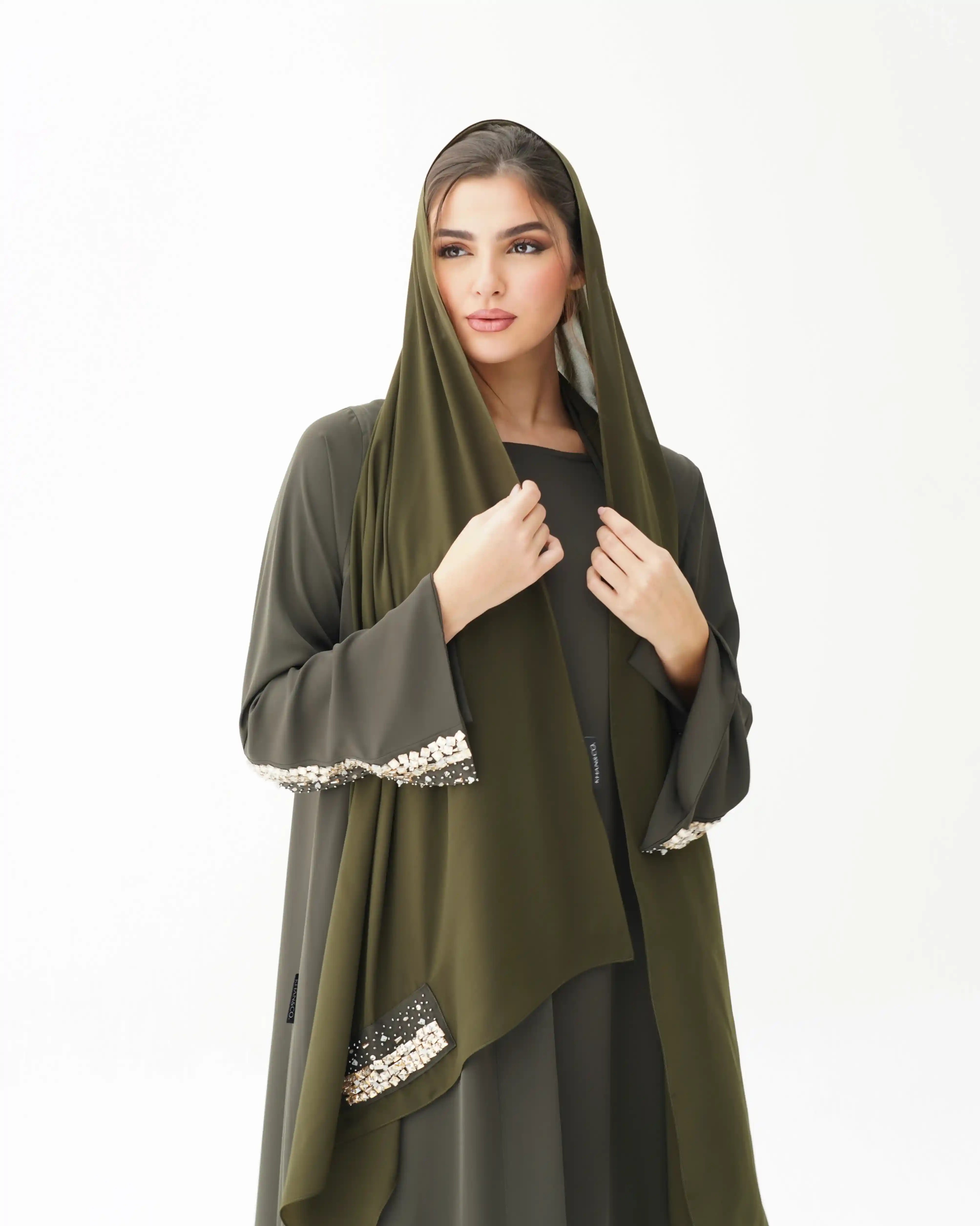 • طرحة مع العباية مطرزة بالكريستال والخزر بطرف الطرحة.