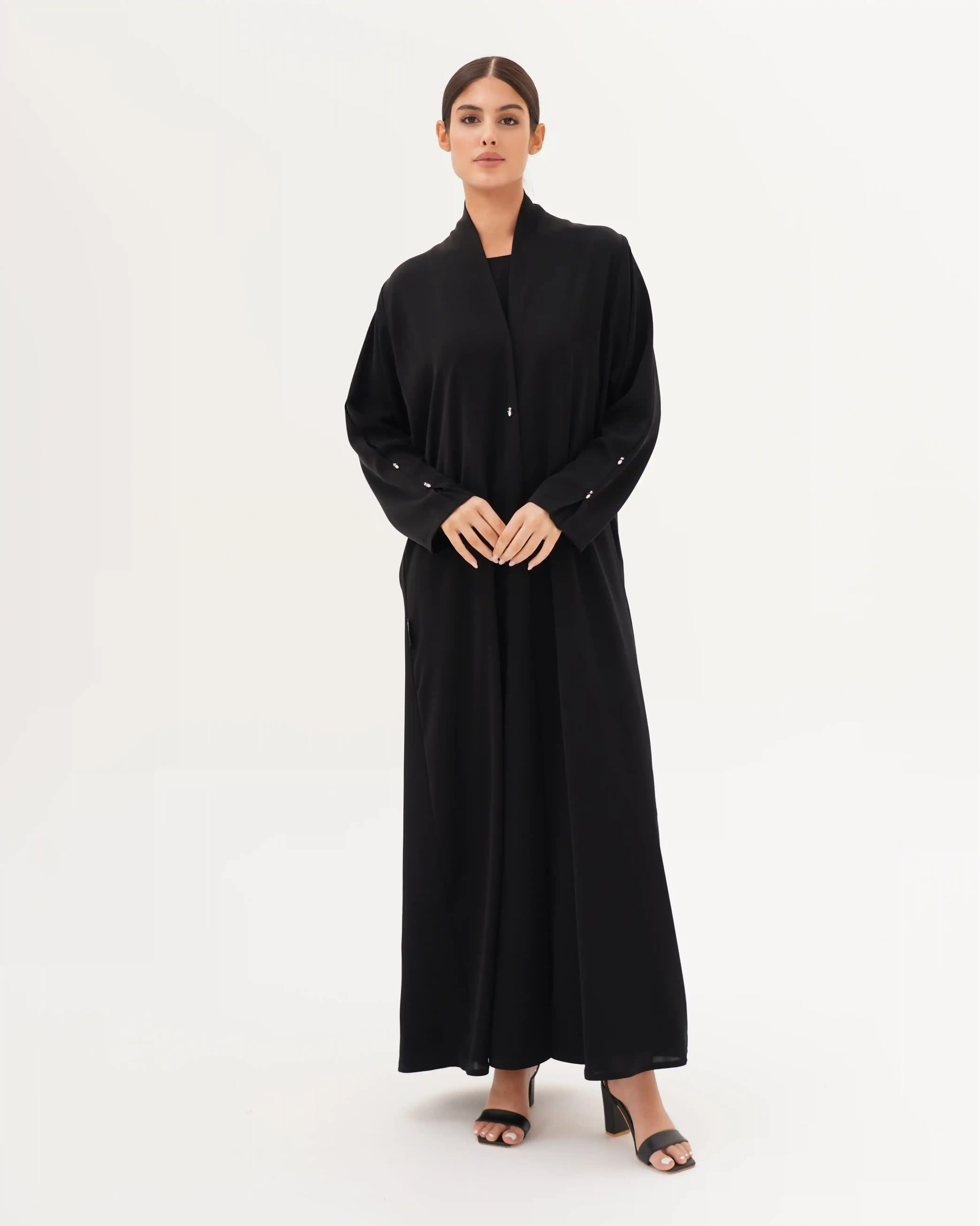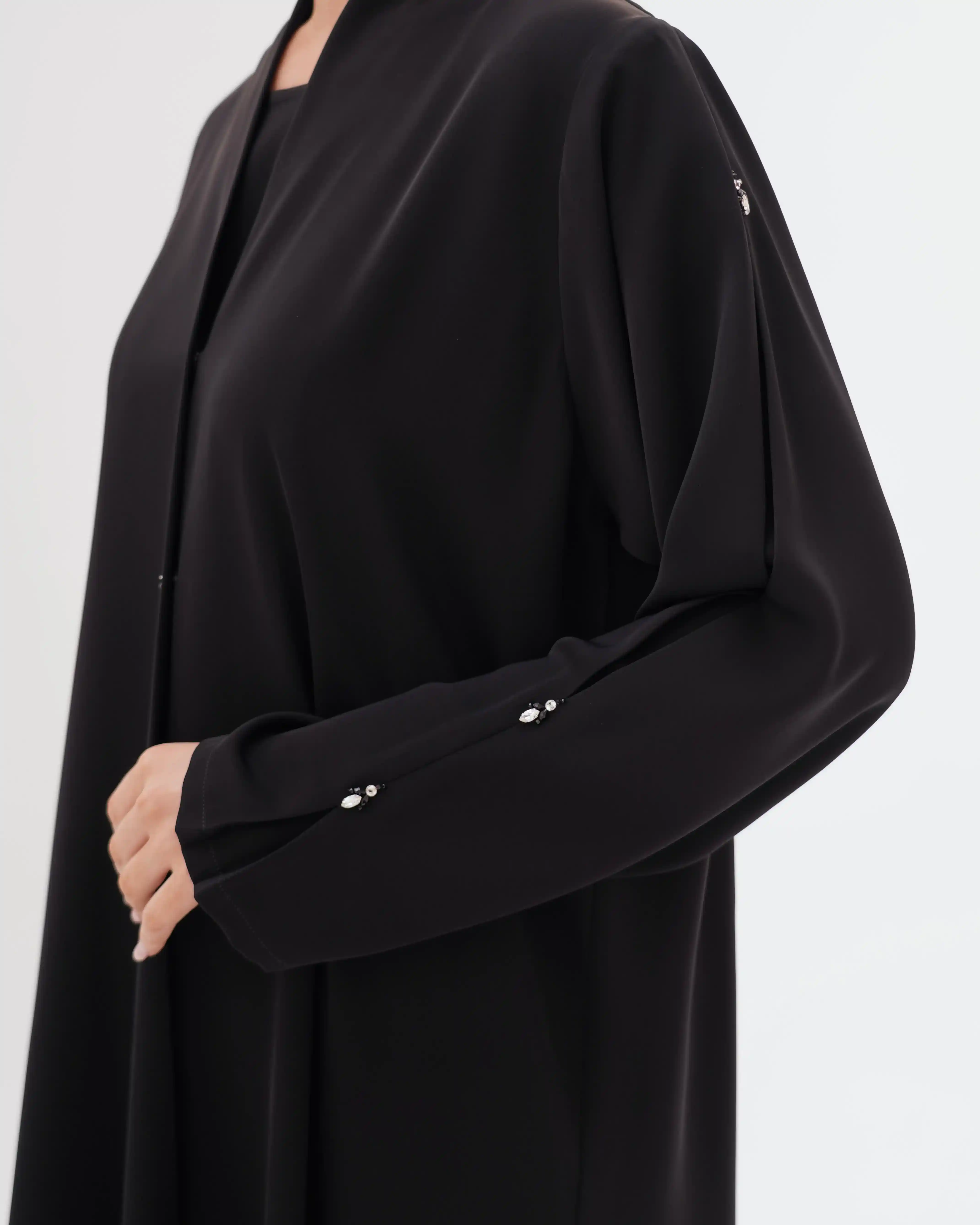 عباية تعكس الفخامة الهادئة بقصّة مستقيمة تنسدل بانسيابية نقية من الكتفين حتى الذيل، مع إغلاق مخفي يحافظ على صفاء الخطوط. صُنعت من قماش البريميوم كريب بملمس ناعم وانسدال خفيف، ومزيّنة بحبات حجر ماركيز مستوحاة من شكل النحلة، موزعة بتوازن مدروس على الأكمام ذات الثنية الناعمة في منتصف الكم، وعلى الصدر والطرحة, لتكتمل معها الإطلالة بتناغم وأناقة هادئة.