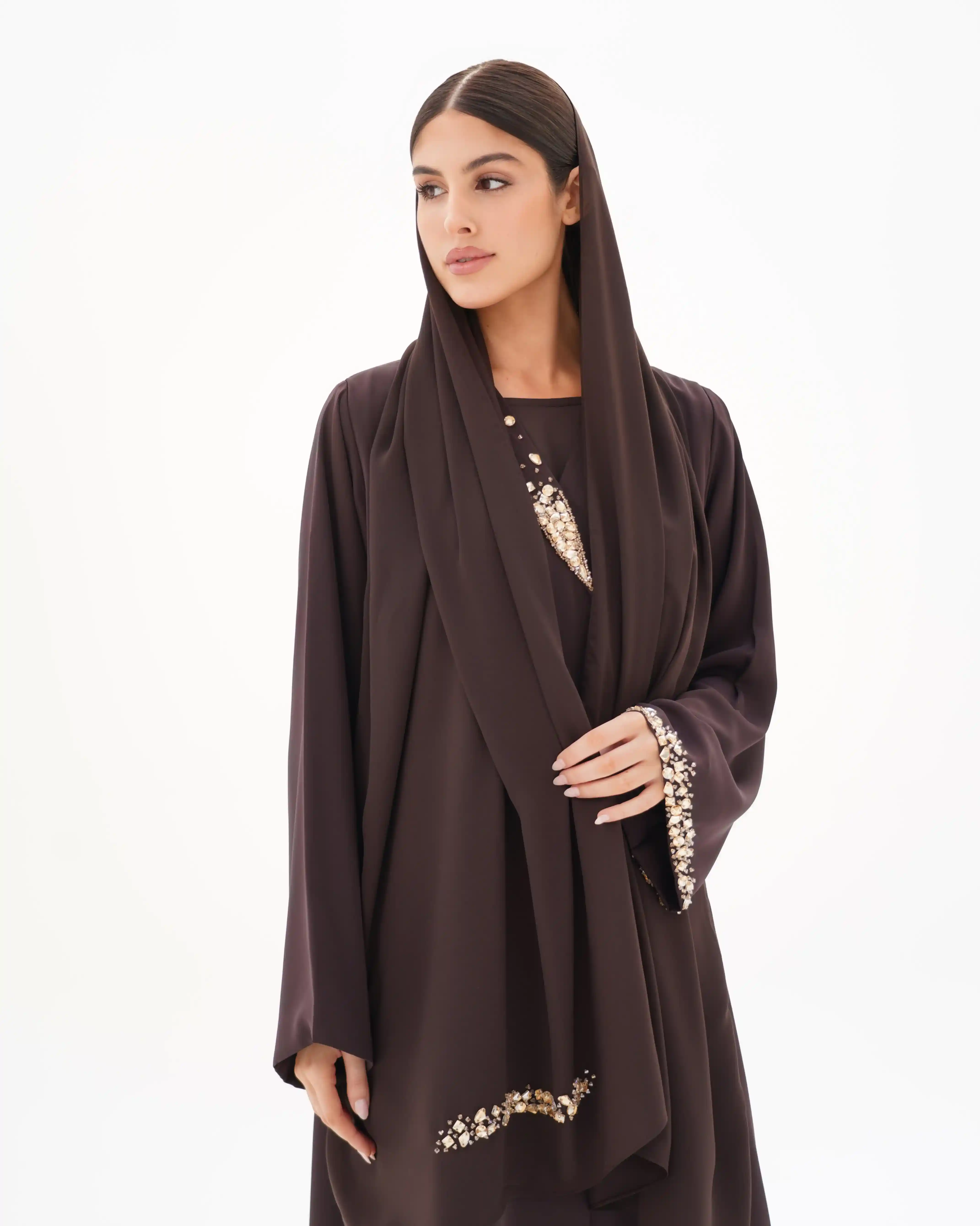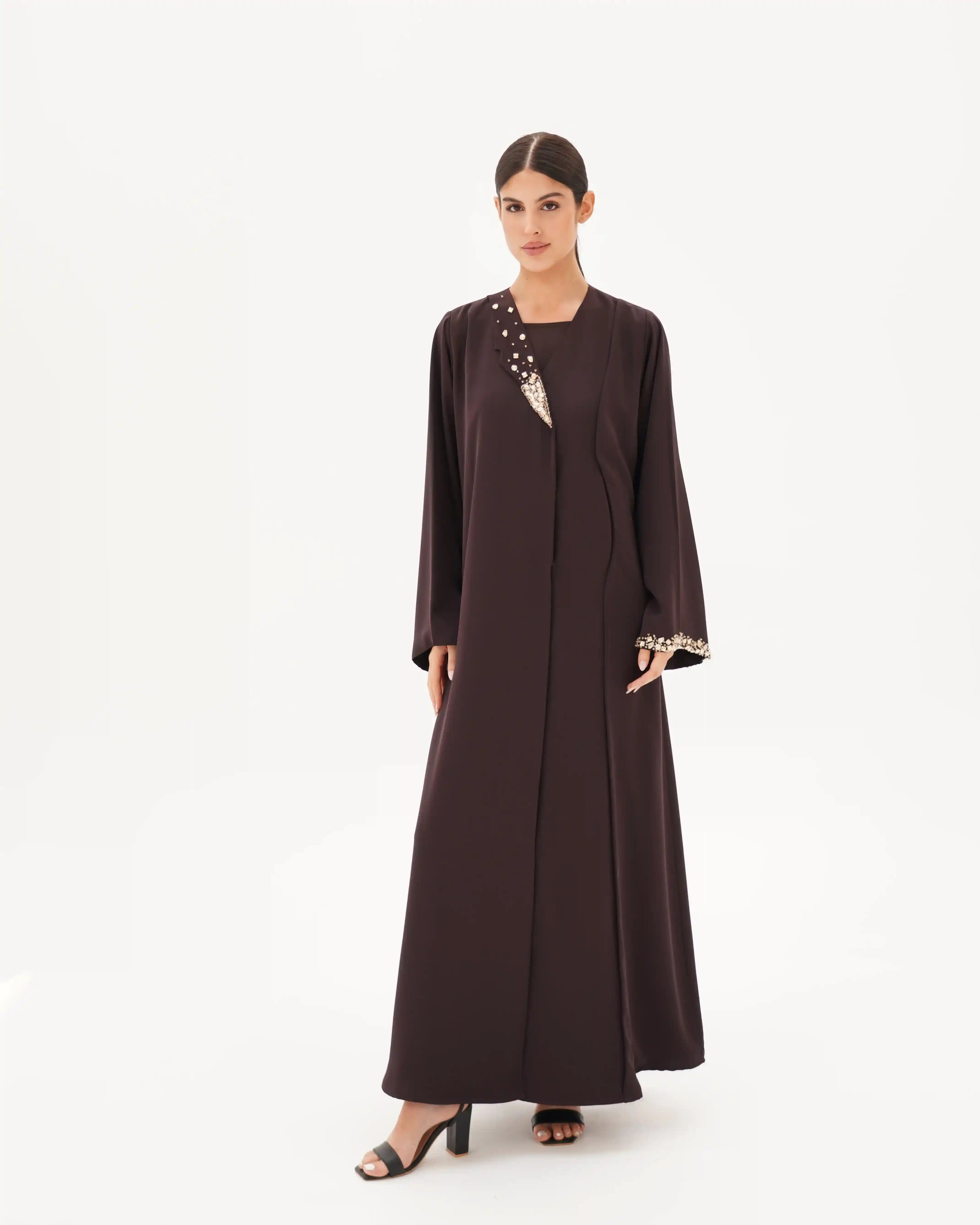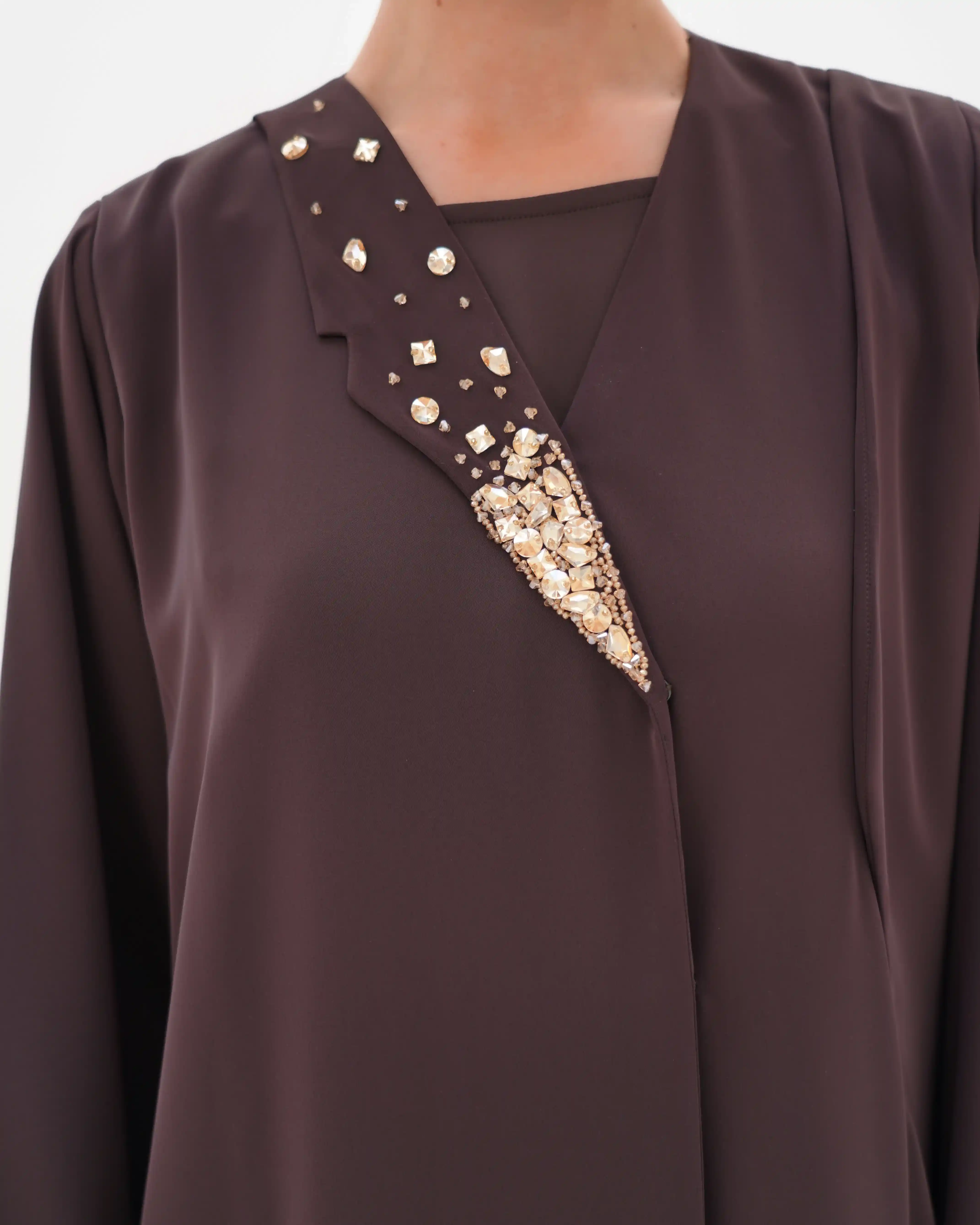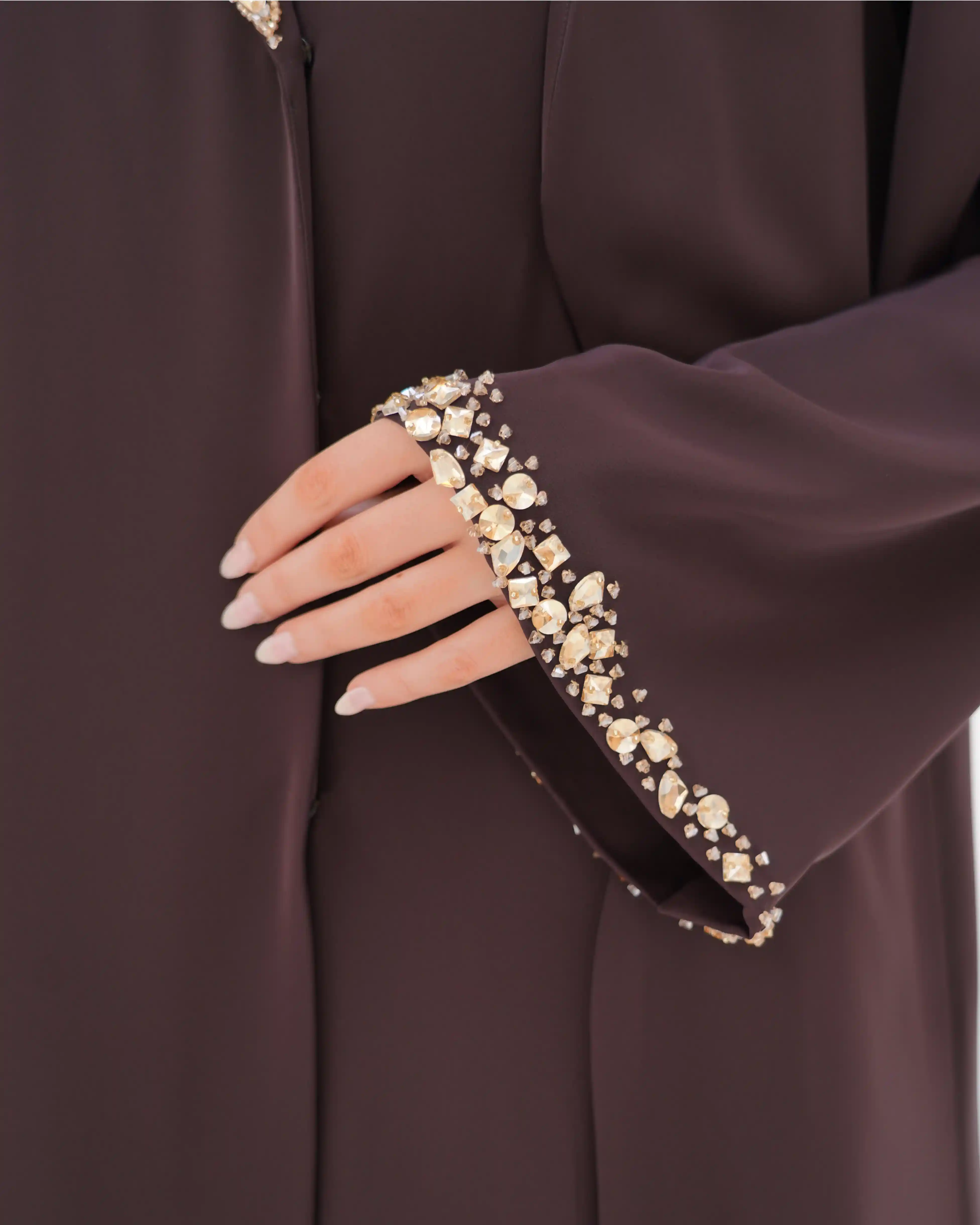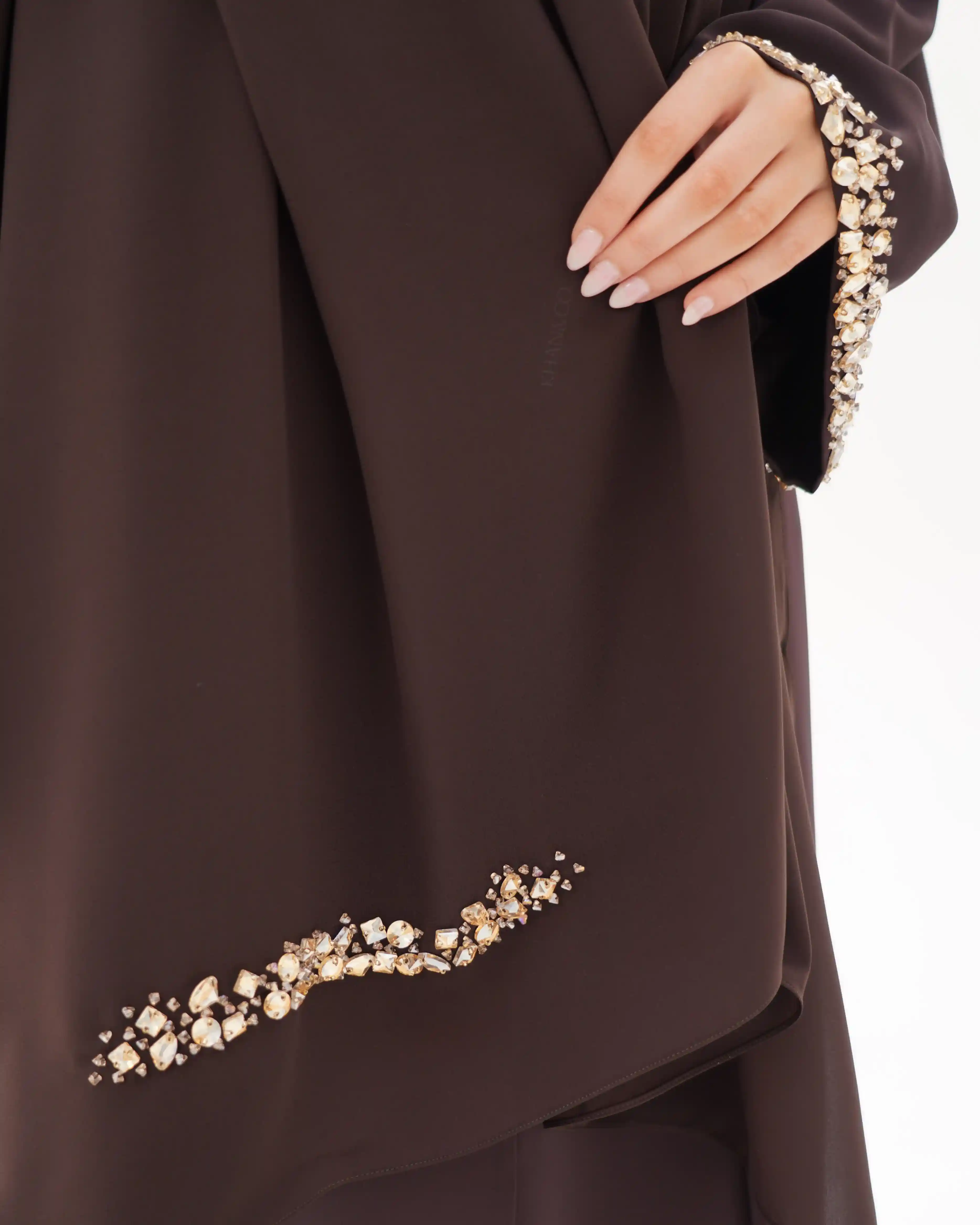 عباية تُجسّد قوة الحضور وأناقة الخط الواحد، بتصميم يرتكز على قصّة مستقيمة تنسدل بانسيابية هادئة من قماش البريميوم كريب بملمس ناعم وانسدال خفيف وهدوء بصري راقٍ, تأتي بياقة بليزر بطرف واحد تمنح القطعة طابعًا معماريًا راقيًا، بينما يبرز الاشتغال اليدوي بالخرز والكريستال كتوقيع فني متوازن على الصدر، وعلى طرف اللياقة، وفي نهاية الكم الأيسر، دون إخلال بنقاء التصميم.