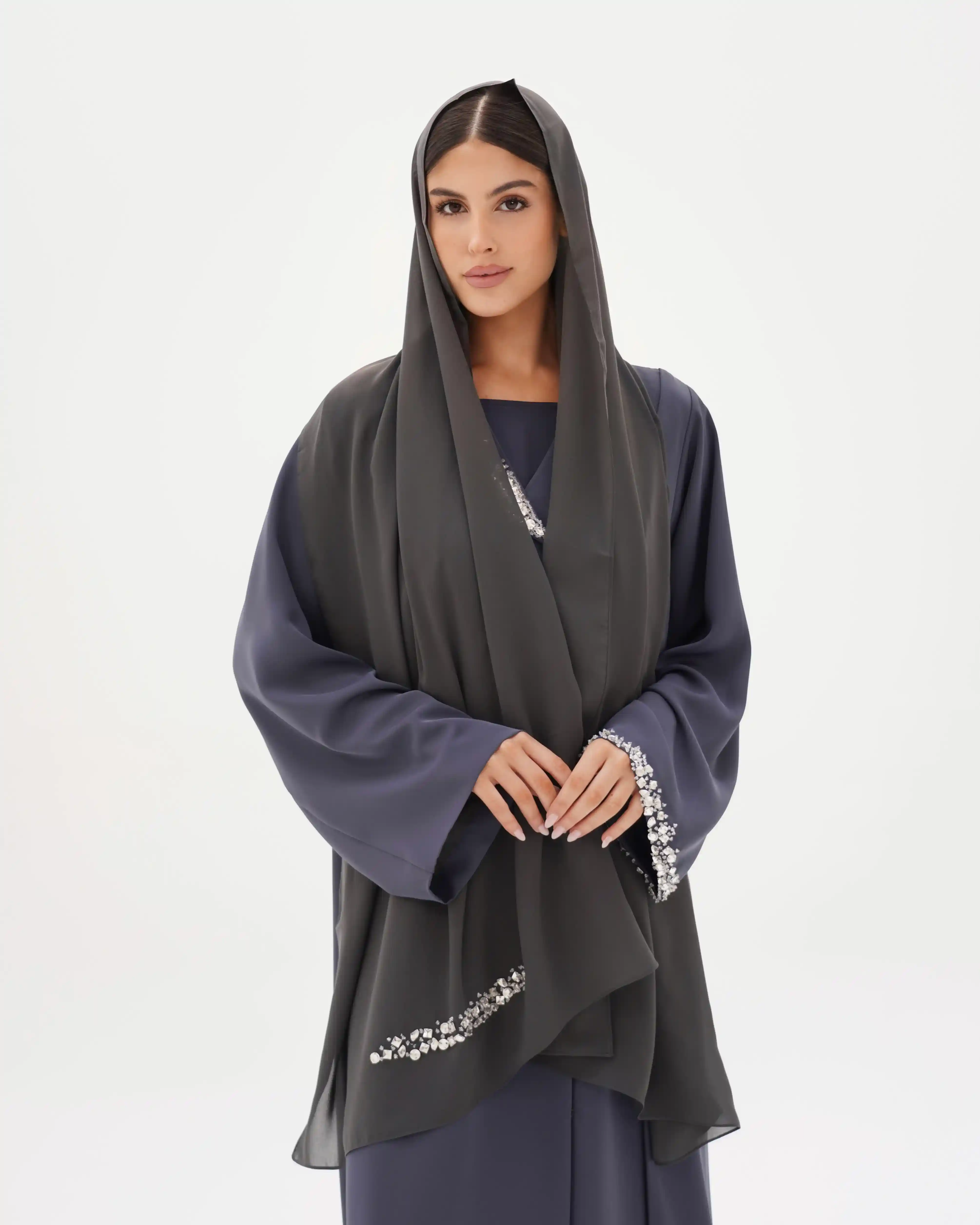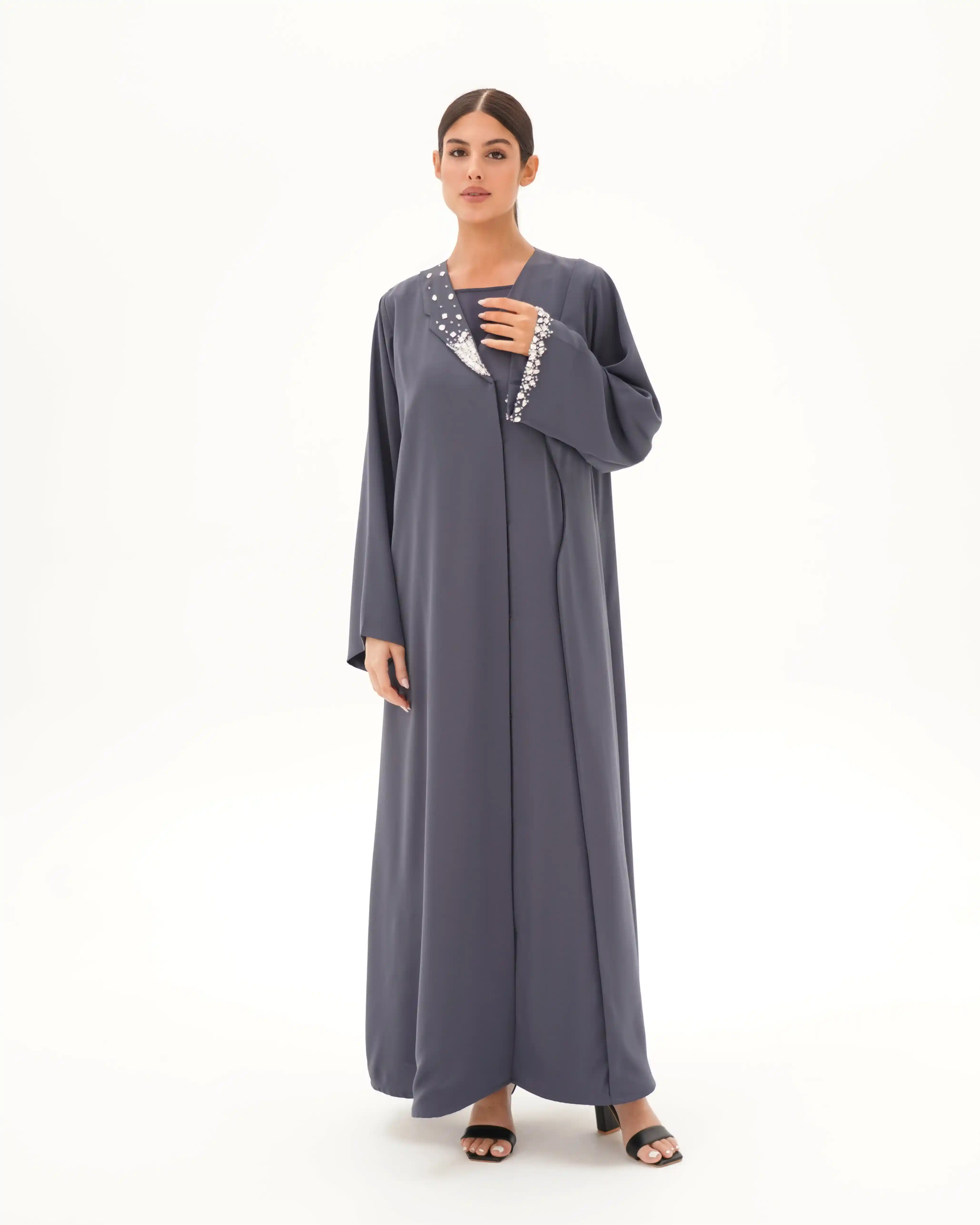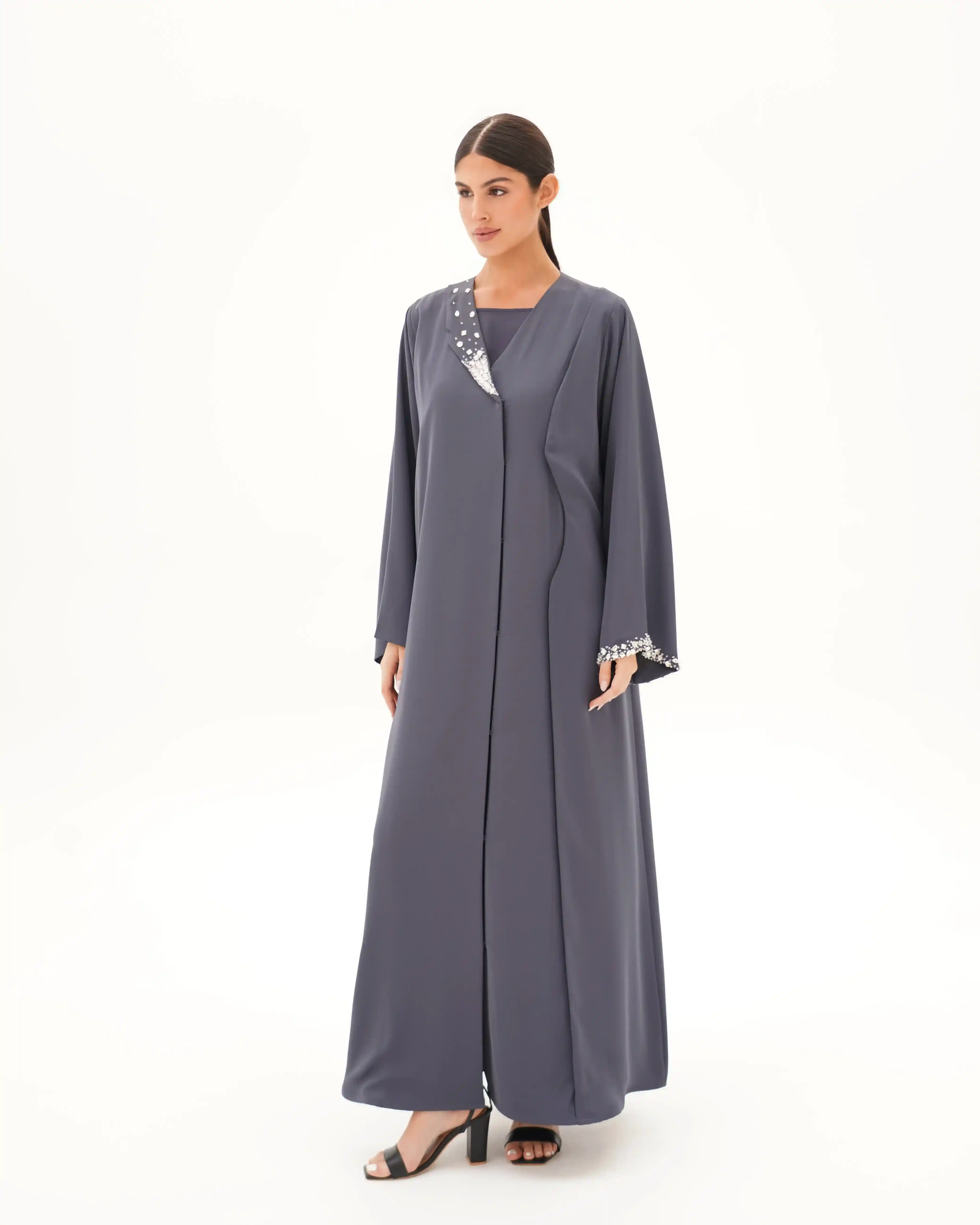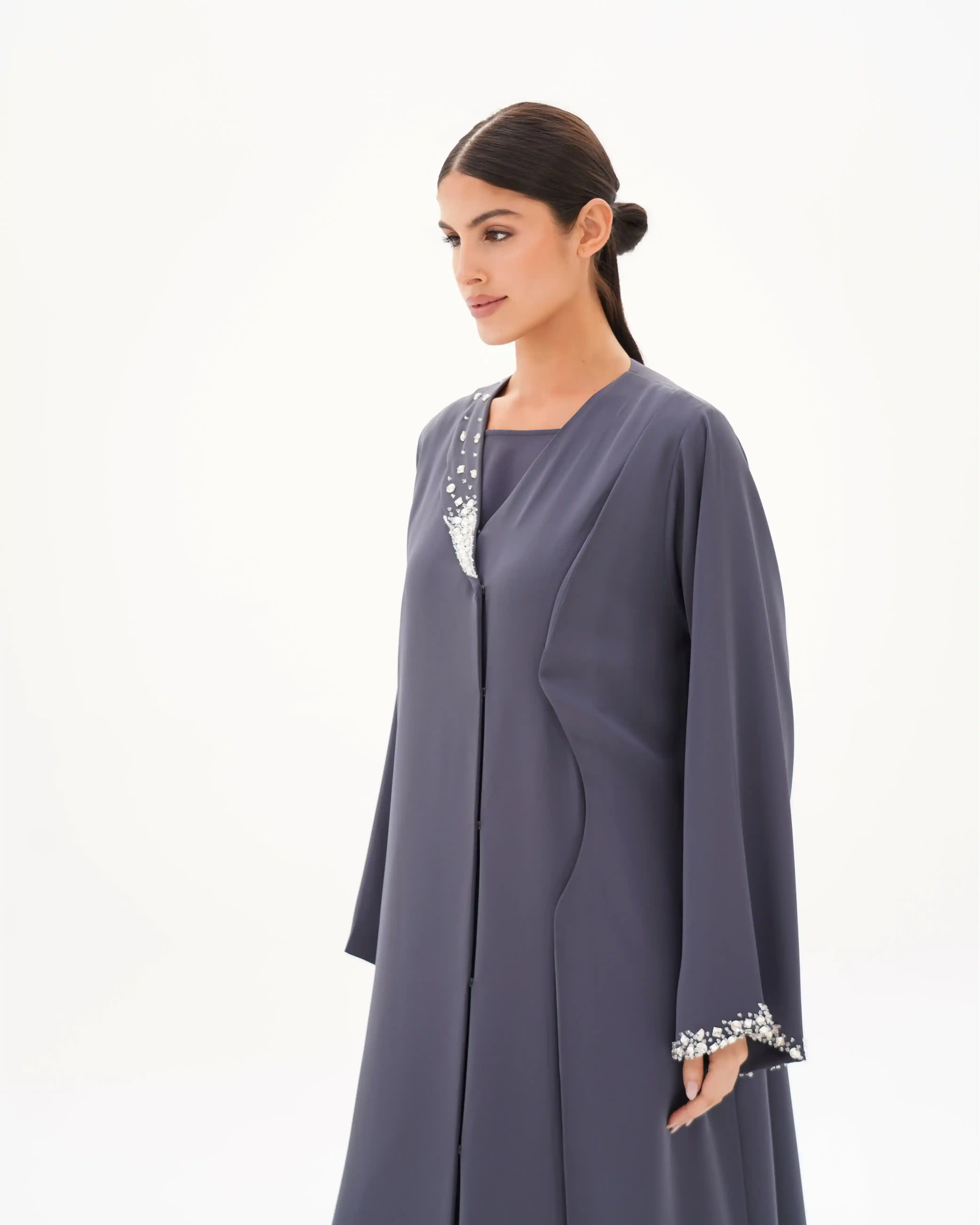 عباية تُجسّد قوة الحضور وأناقة الخط الواحد، بتصميم يرتكز على قصّة مستقيمة تنسدل بانسيابية هادئة من قماش البريميوم كريب بملمس ناعم وانسدال خفيف وهدوء بصري راقٍ, تأتي بياقة بليزر بطرف واحد تمنح القطعة طابعًا معماريًا راقيًا، بينما يبرز الاشتغال اليدوي بالخرز والكريستال كتوقيع فني متوازن على الصدر، وعلى طرف اللياقة، وفي نهاية الكم الأيسر، دون إخلال بنقاء التصميم.