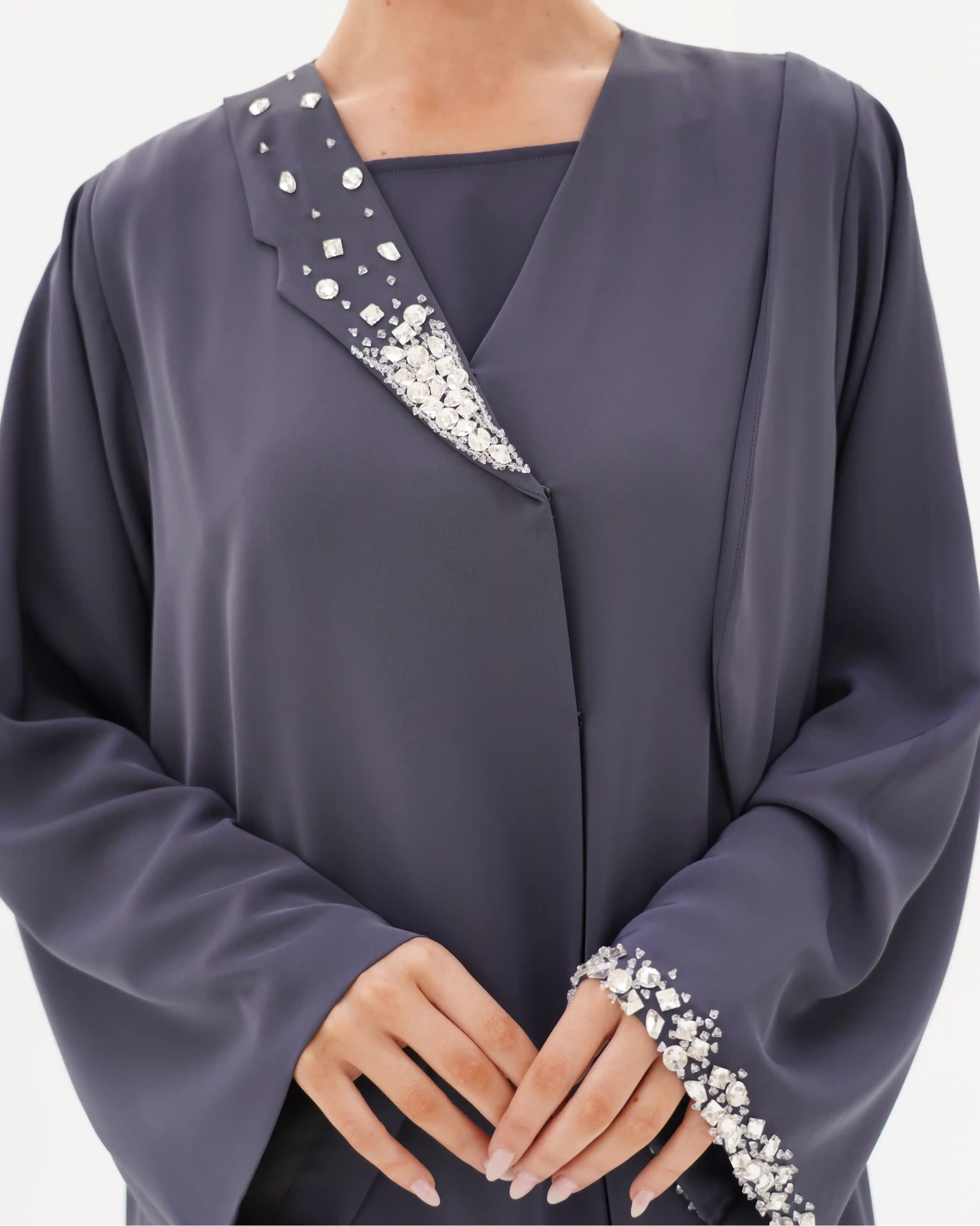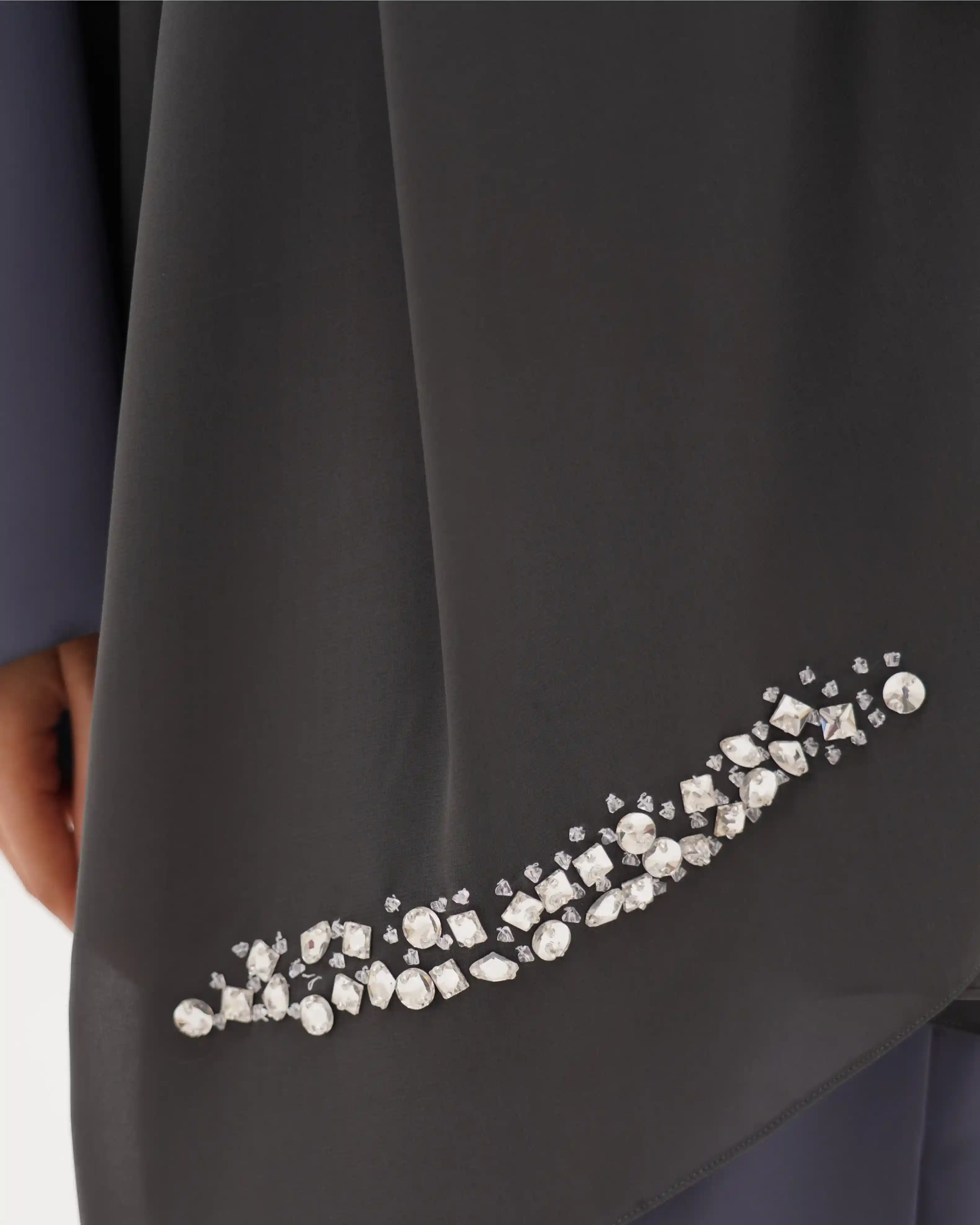 قماش البريميوم كريب بقصّة بليزر مشتغلة يدويًا بالخرز والكريستال