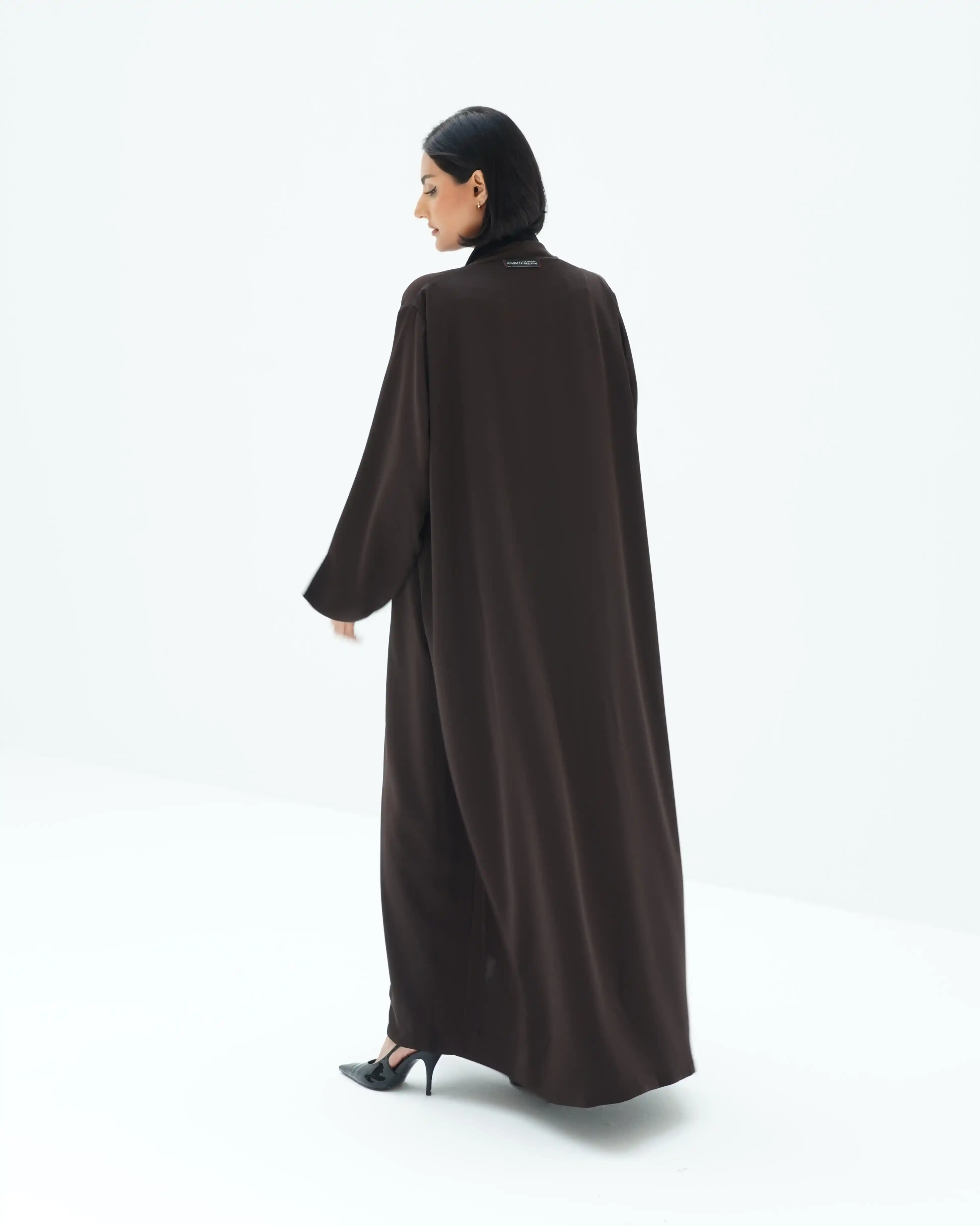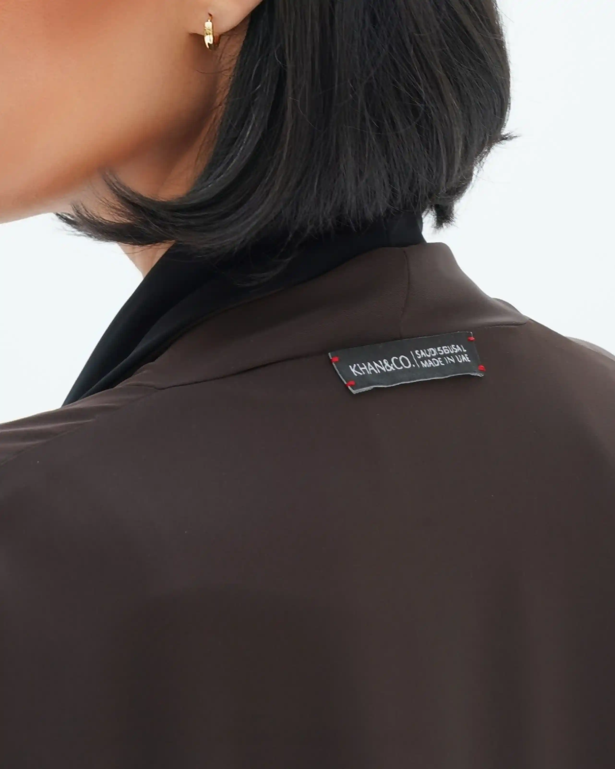 هذه العباية الدافئة والمريحة التي تلتف حول الجسم هي قطعة أساسية من تصميم دار .KHAN&CO وقد صُممت باستخدام تقنية الوجه المزدوج من خامة قماش الكريب الناعم والمنسدل تمزج  وتزدان بخطوط بقصات طولية بخياطة مخفية لإبراز إطلالة أنثوية أنيقة. تضيف شارة المقاس في الظهر خلف الرقبة المدروز يدويا بخيوط حمراء لفتة تفاصيل نهائية تعكس مدى اتقان هذه العباية البسيطة والانيقة في نفس الوقت وتُضيف ياقتها المتصلة بطية في الصدر لمسة متماسكة على تصميمها الواسع.