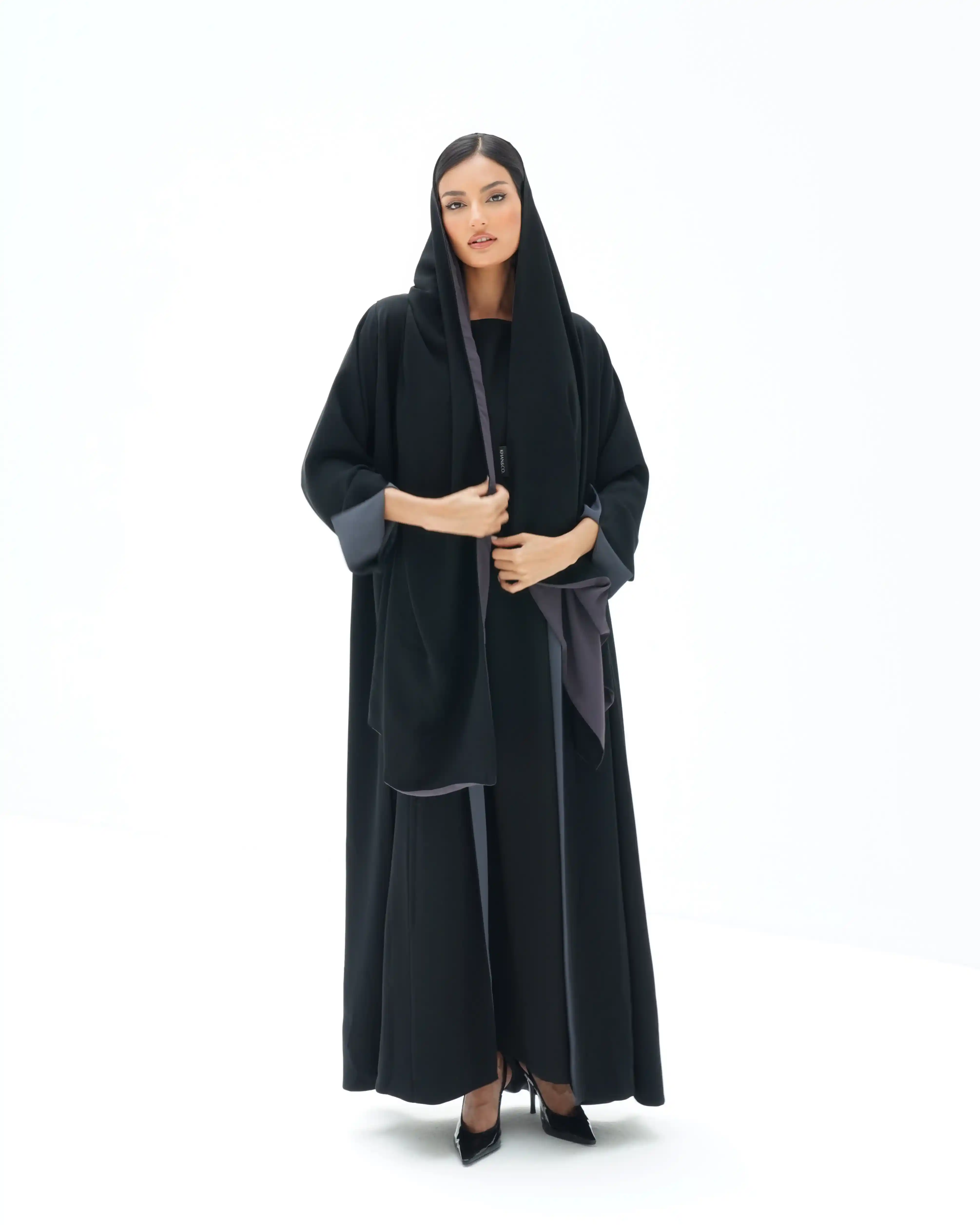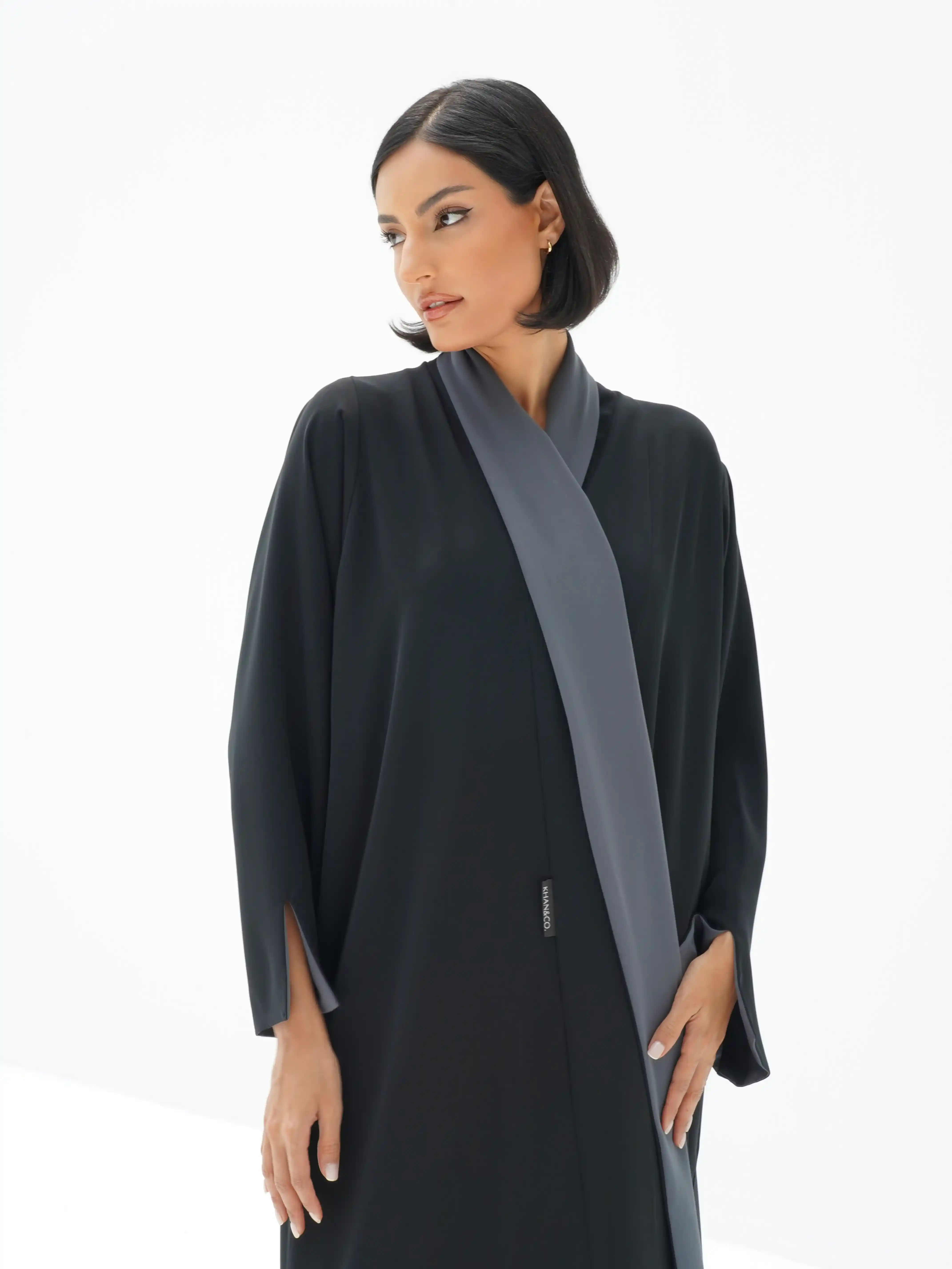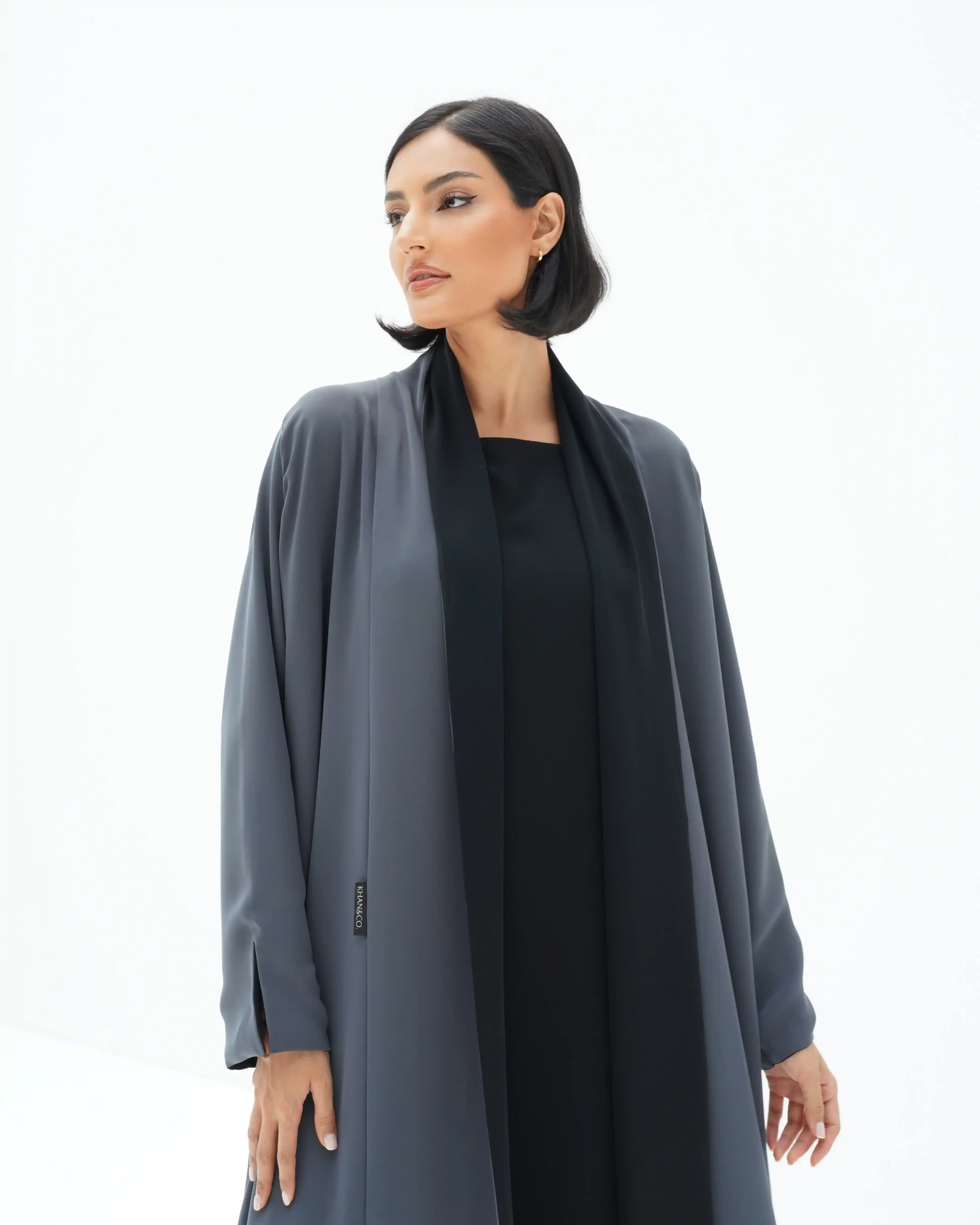 هذه العباية الدافئة والمريحة التي تلتف حول الجسم هي قطعة أساسية من تصميم دار .KHAN&CO وقد صُممت باستخدام تقنية الوجه المزدوج من خامة قماش الكريب الناعم والمنسدل تمزج  وتزدان بخطوط بقصات طولية بخياطة مخفية لإبراز إطلالة أنثوية أنيقة. تضيف شارة المقاس في الظهر خلف الرقبة المدروز يدويا بخيوط حمراء لفتة تفاصيل نهائية تعكس مدى اتقان هذه العباية البسيطة والانيقة في نفس الوقت وتُضيف ياقتها المتصلة بطية في الصدر لمسة متماسكة على تصميمها الواسع.