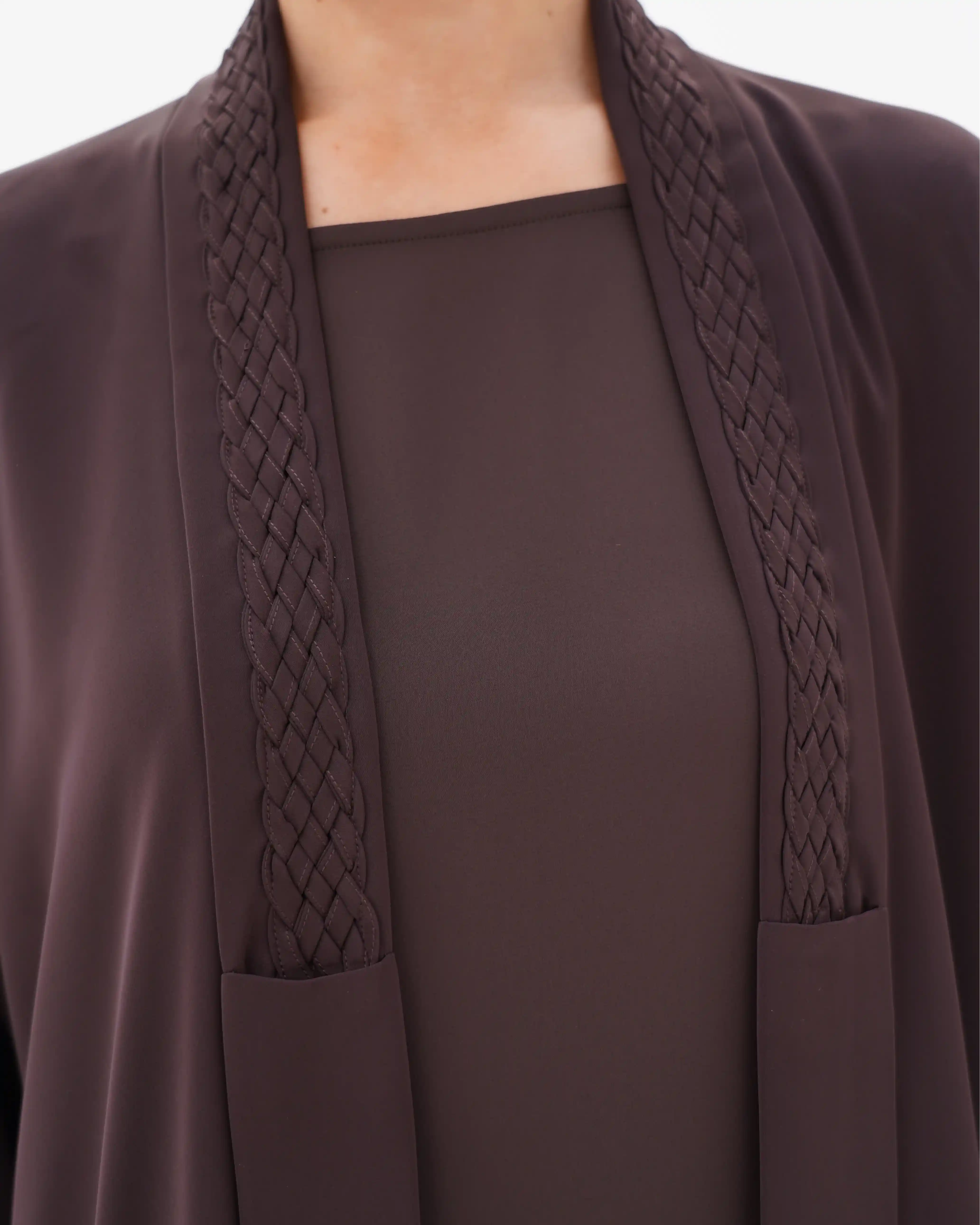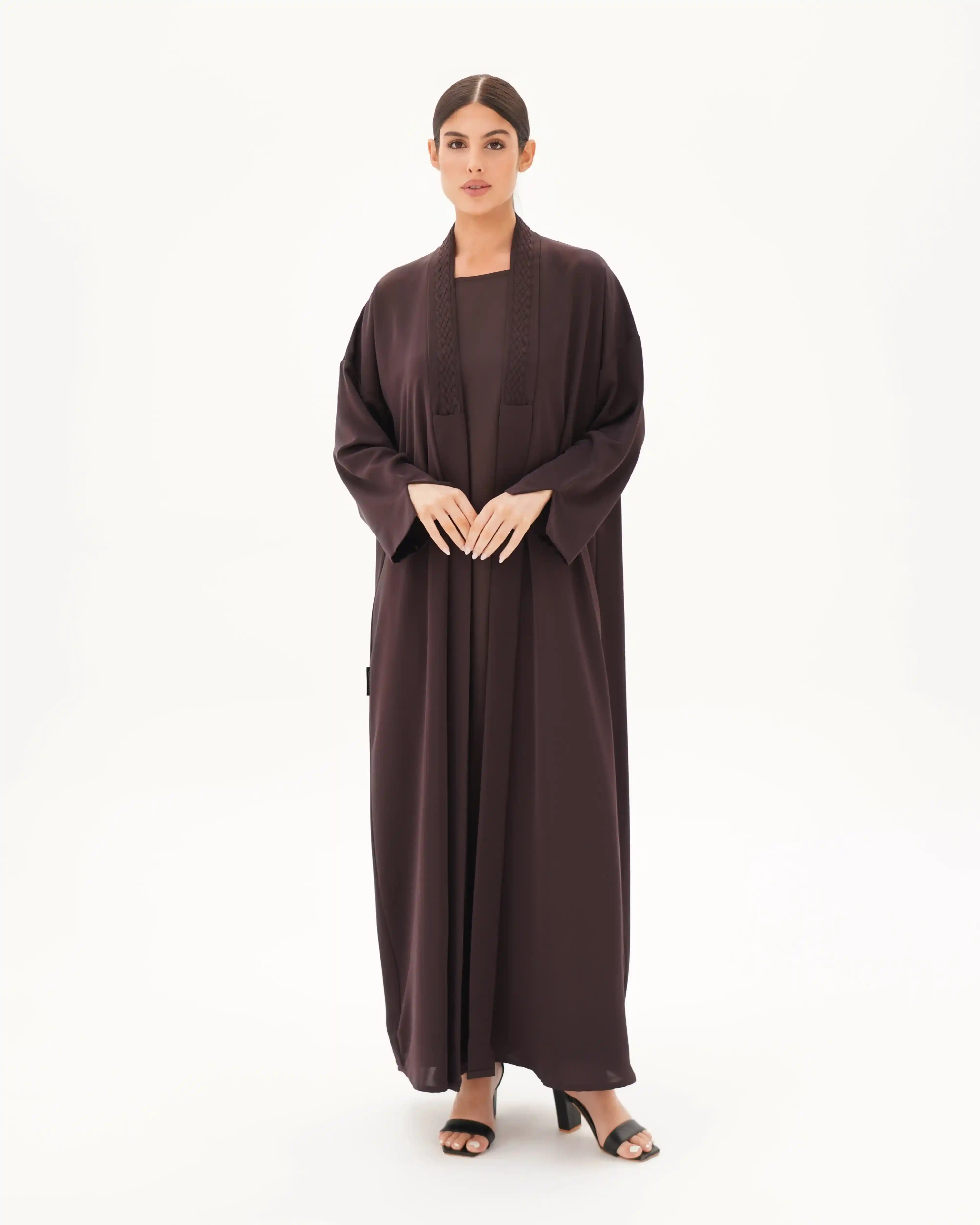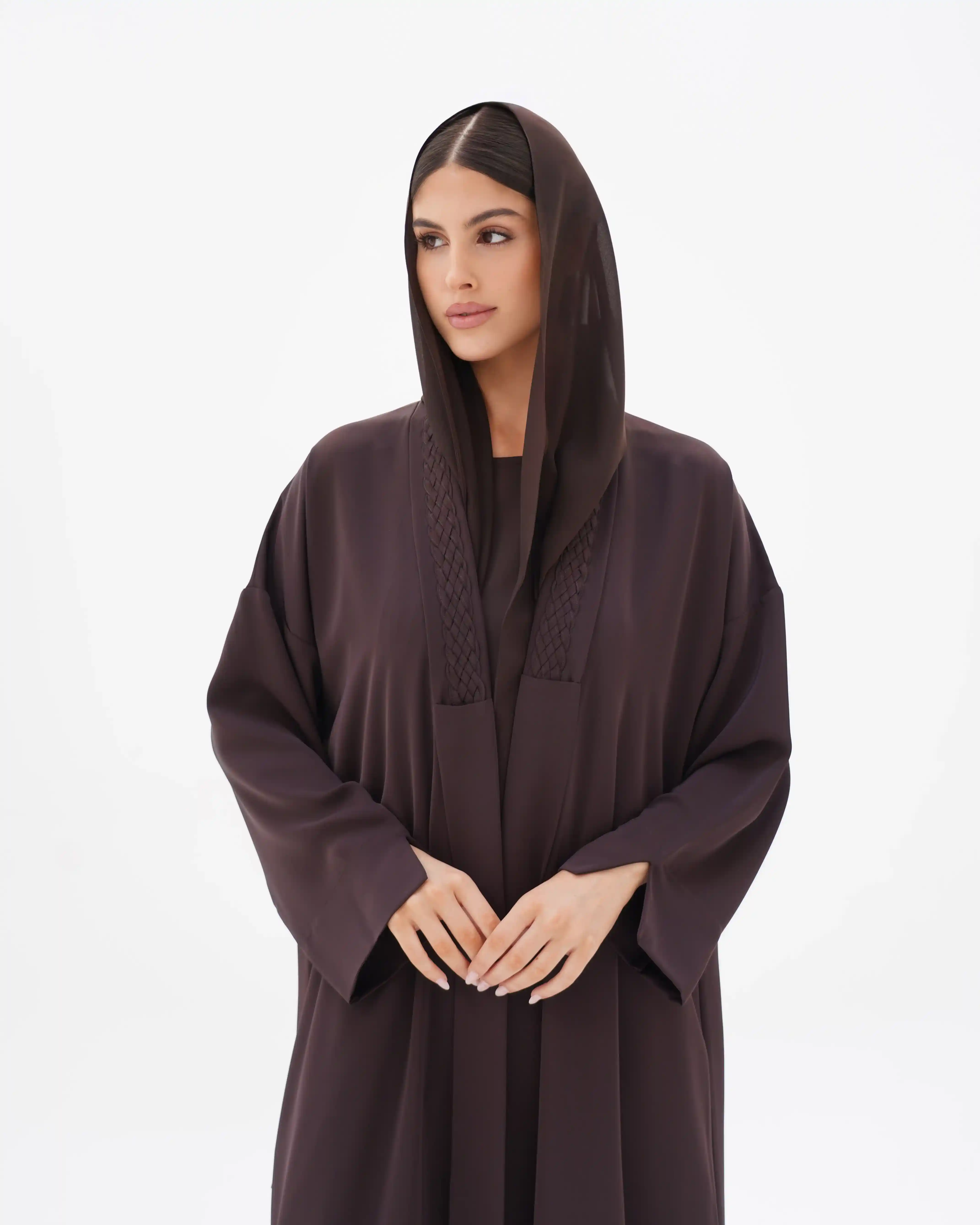 عباية بتصميم هادئ يعكس فخامة التفاصيل الصامتة، تنسدل بقصّة مستقيمة متوازنة تمنح الإطلالة حضورًا أنيقًا دون تكلّف. صُنعت من قماش البريميوم كريب بملمس ناعم وانسدال انسيابي يواكب الحركة برقي. تتميّز بياقة مزدانة بلياقة ذات تشابك متداخل يرسّخ هوية التصميم، مع فتحات ناعمة في بداية الأكمام تعزز خفة التصميم وأناقة الخطوط.