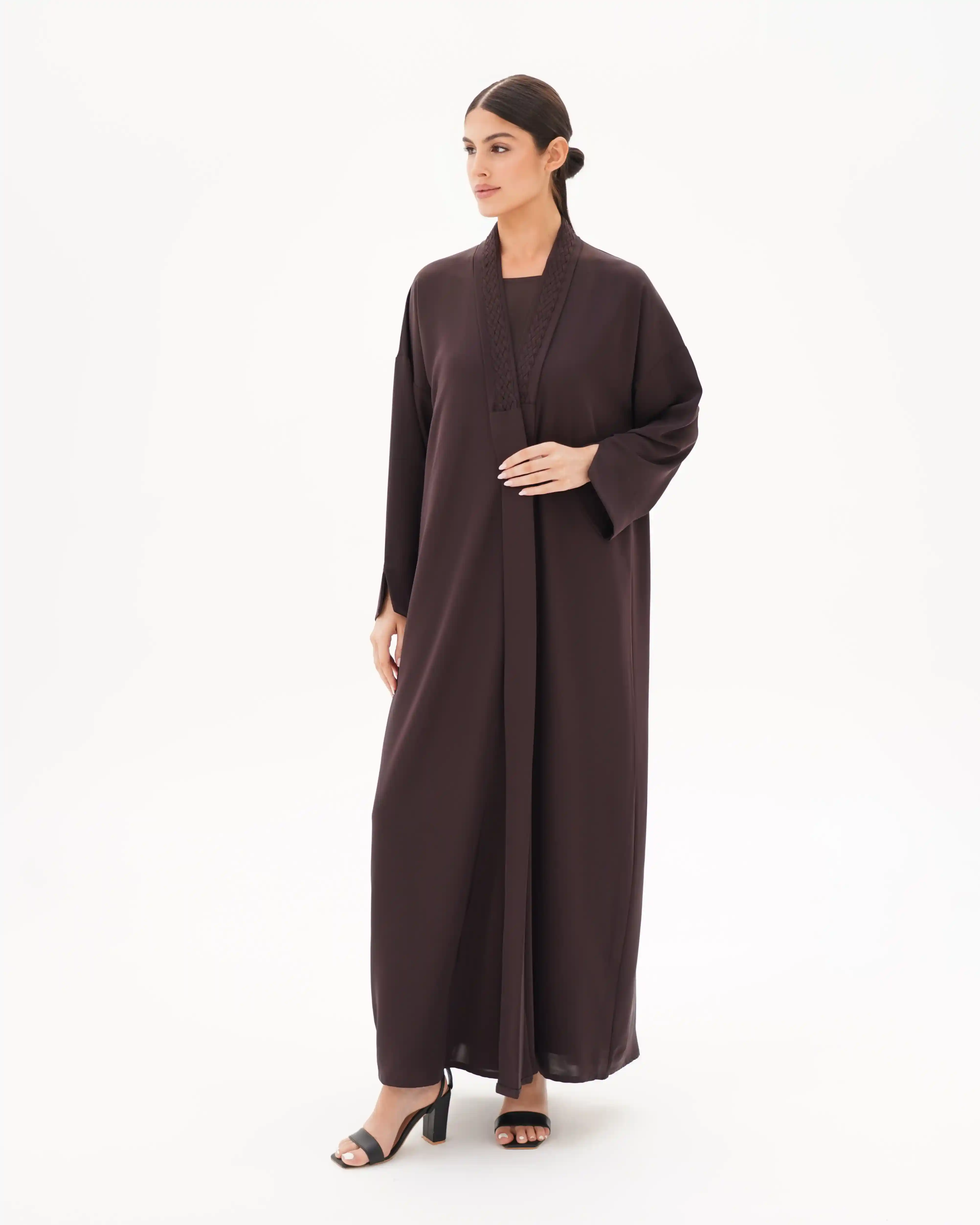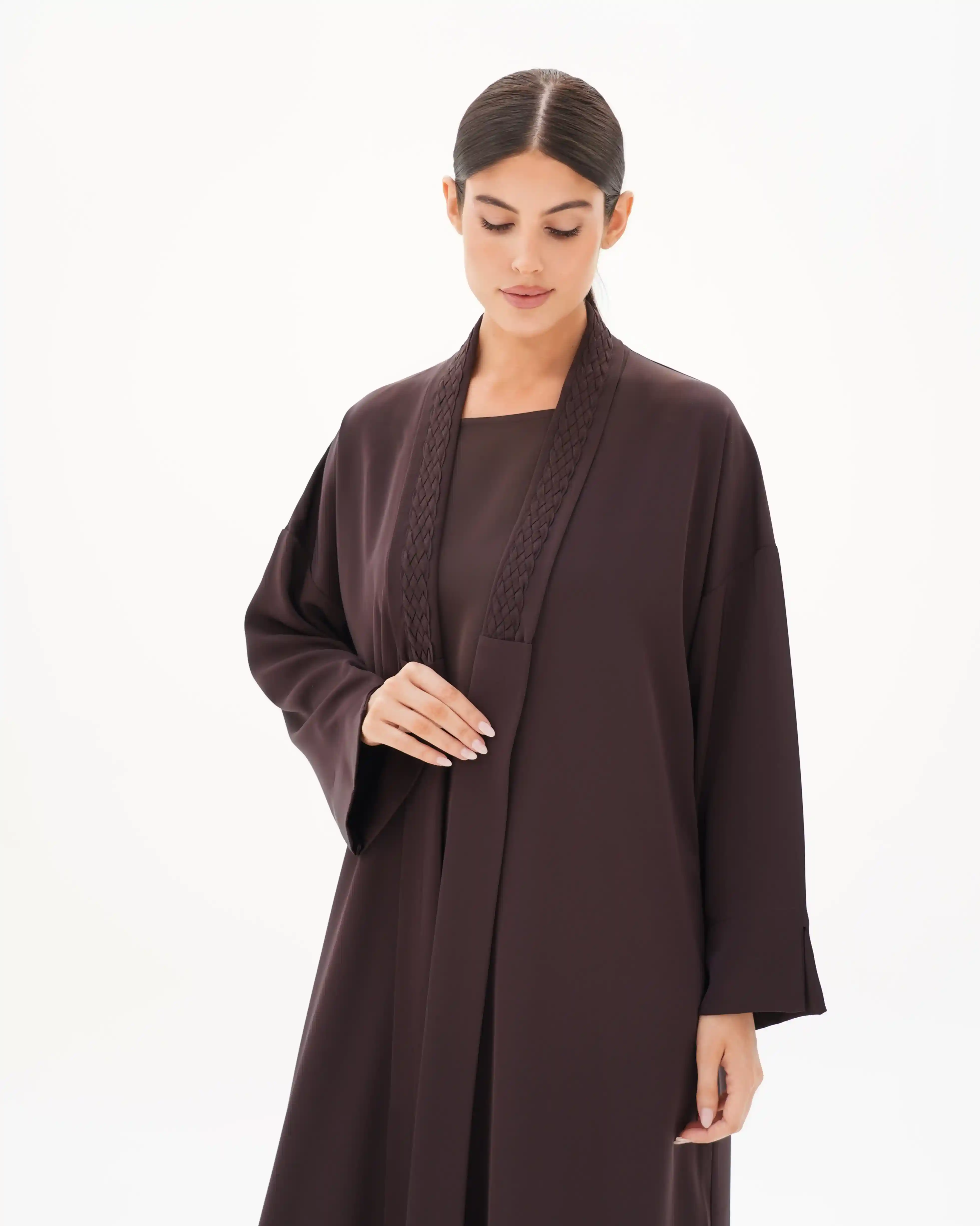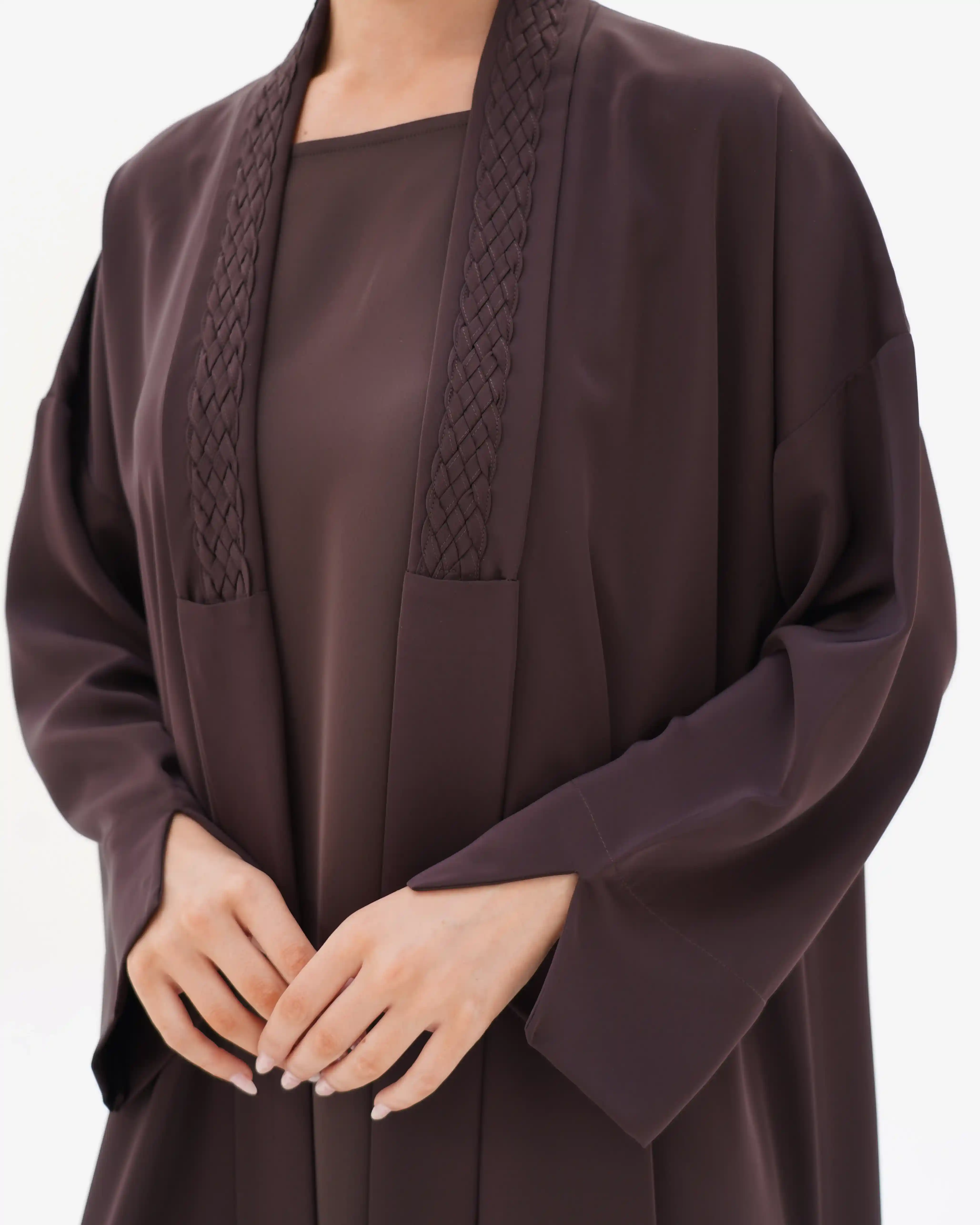 عباية بتصميم هادئ يعكس فخامة التفاصيل الصامتة، تنسدل بقصّة مستقيمة متوازنة تمنح الإطلالة حضورًا أنيقًا دون تكلّف. صُنعت من قماش البريميوم كريب بملمس ناعم وانسدال انسيابي يواكب الحركة برقي. تتميّز بياقة مزدانة بلياقة ذات تشابك متداخل يرسّخ هوية التصميم، مع فتحات ناعمة في بداية الأكمام تعزز خفة التصميم وأناقة الخطوط.