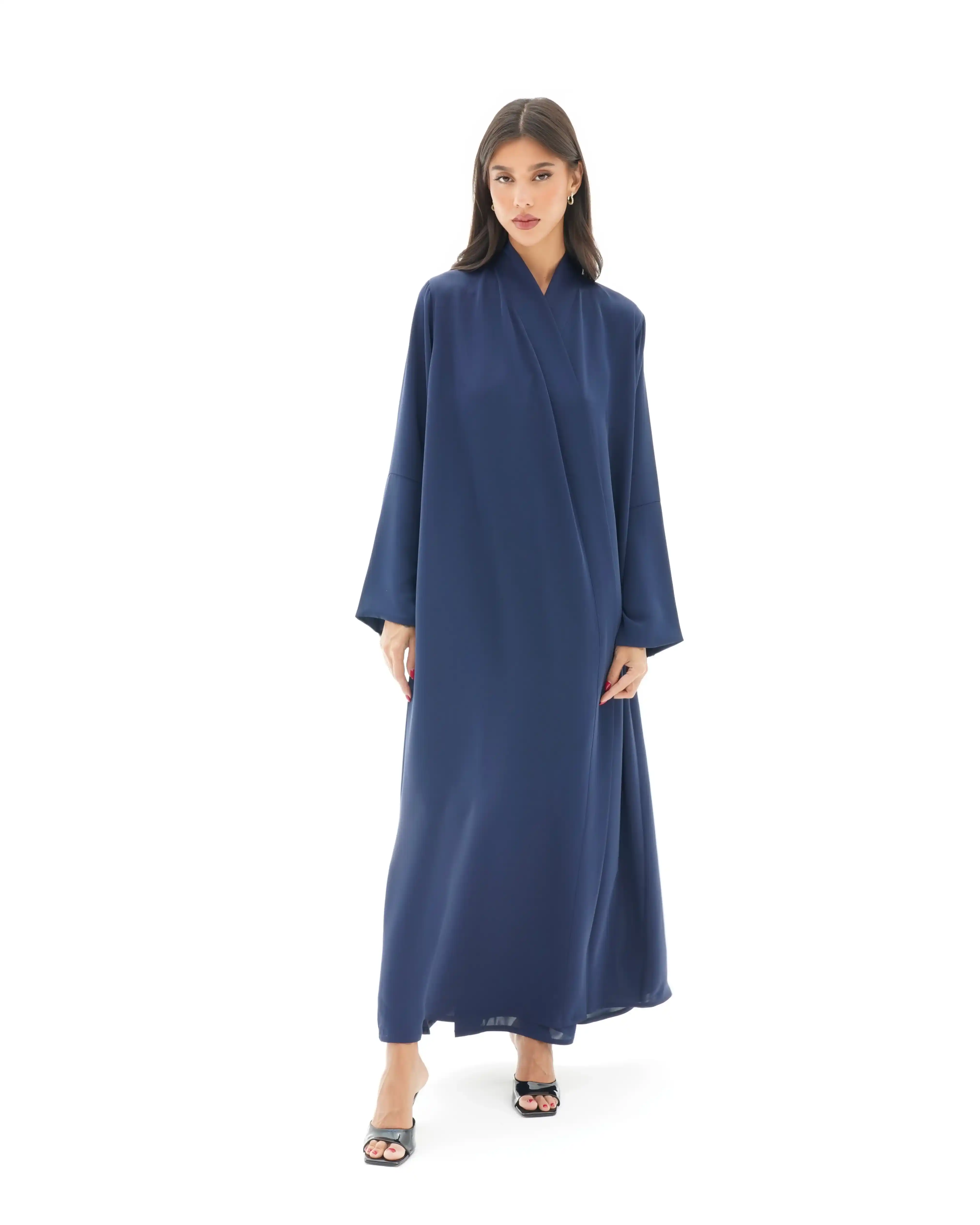 • قصة العباية لف على شكل حرف X (يوجد قطعة فستان داخلي)  على شكل حرف X .
