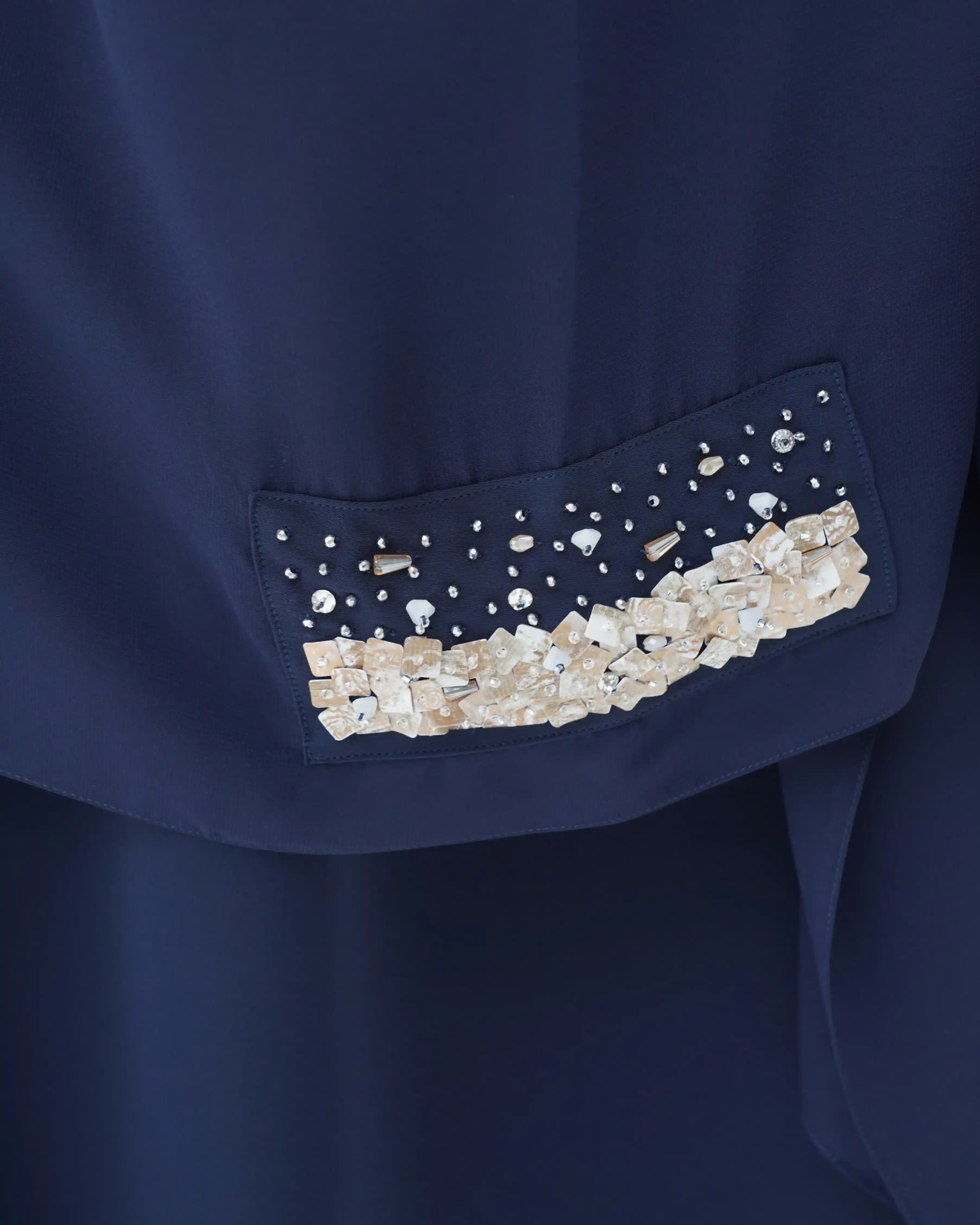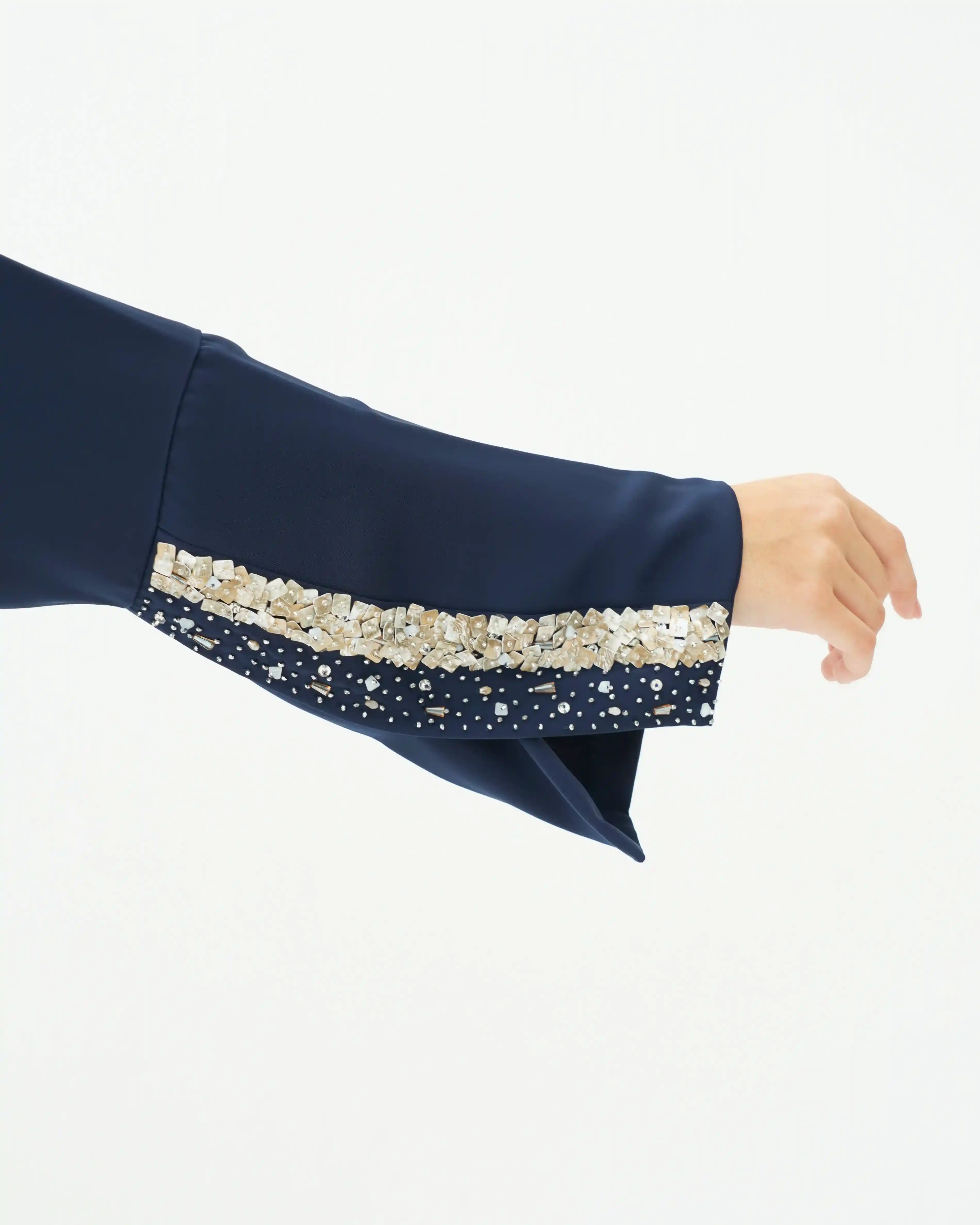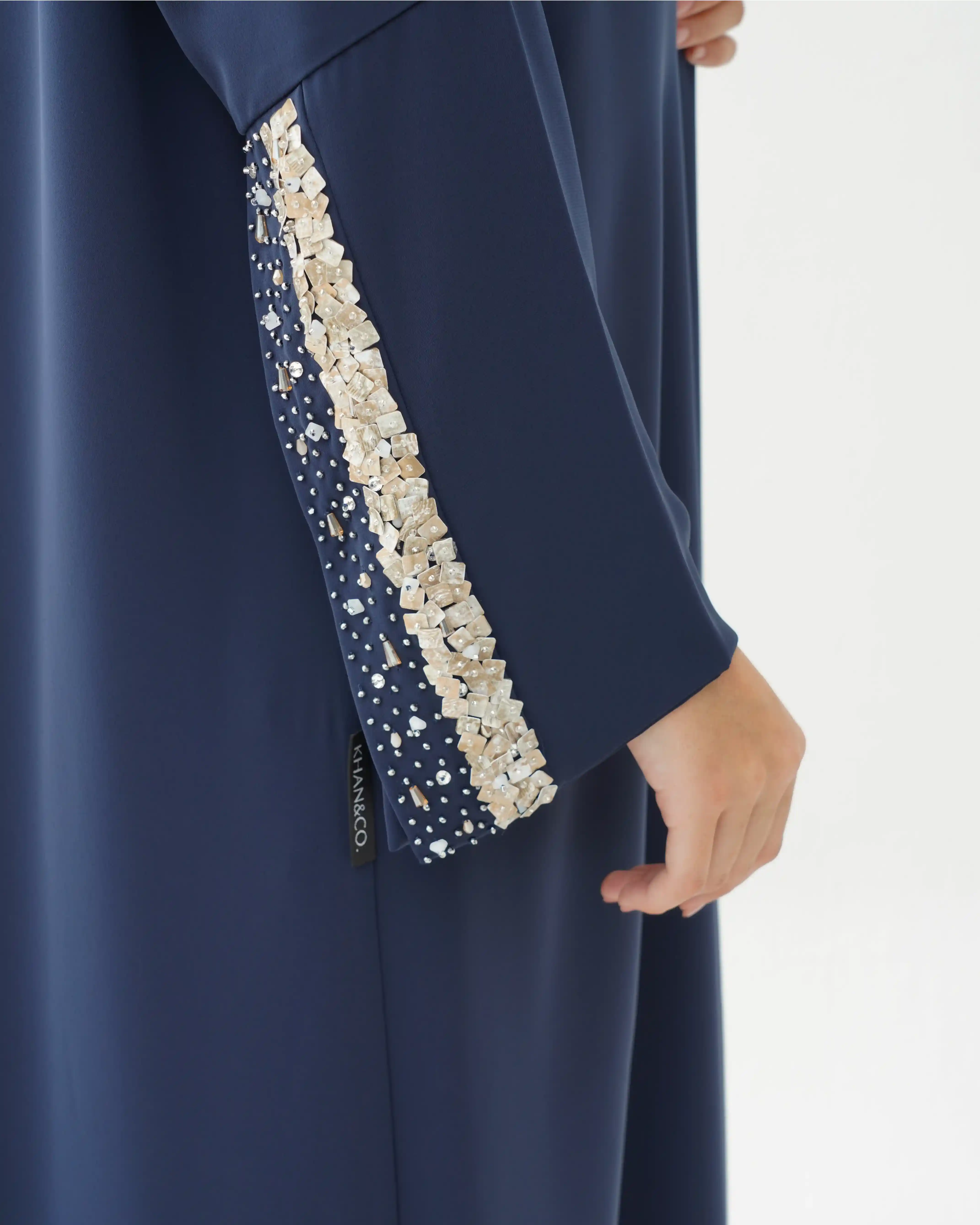 • تطريز بالسكوين بلون الشمبانيا مدموج بالكريستال بشكل يبدأ مصفوف ويتناثر تدريجيا في طرف الكم.