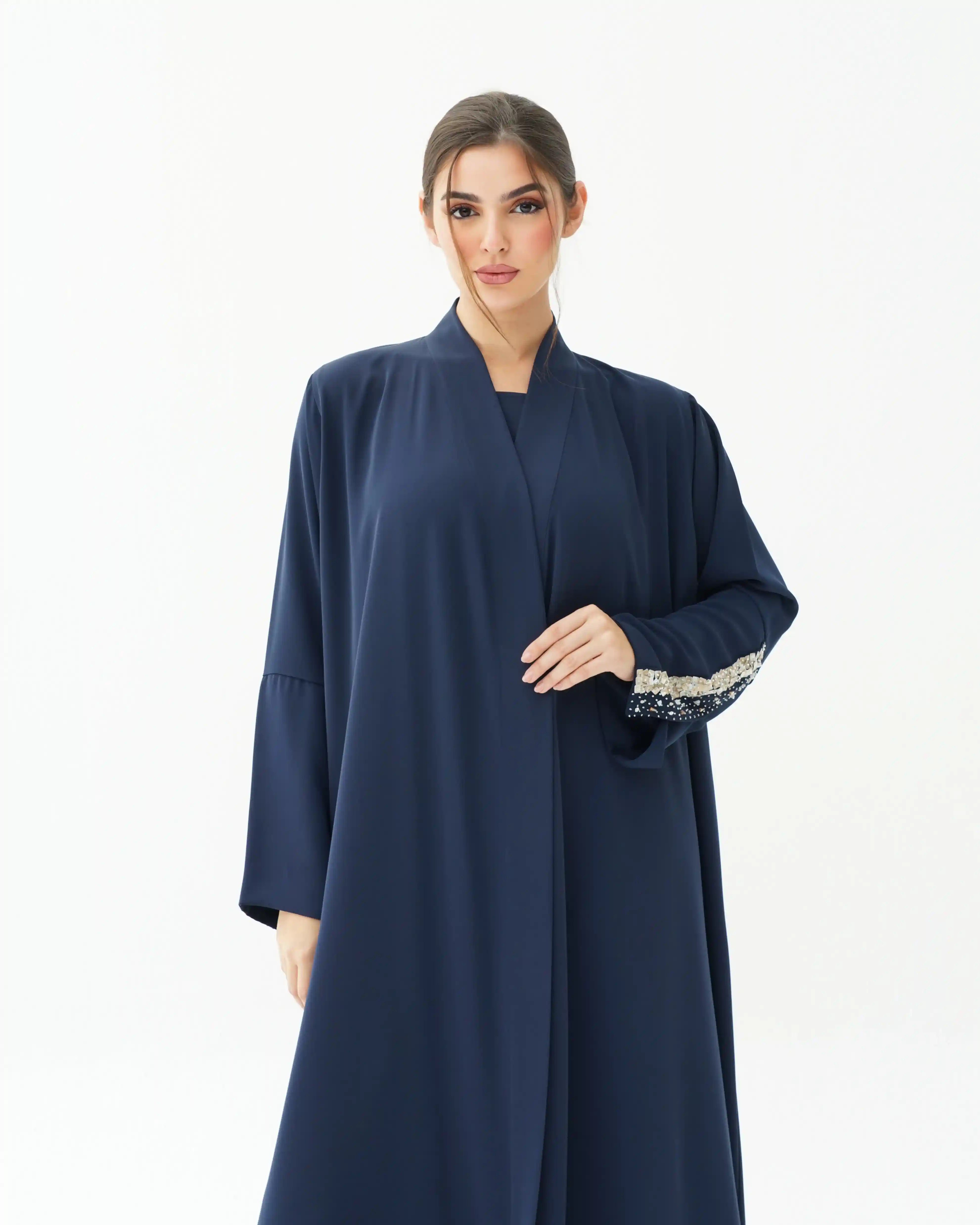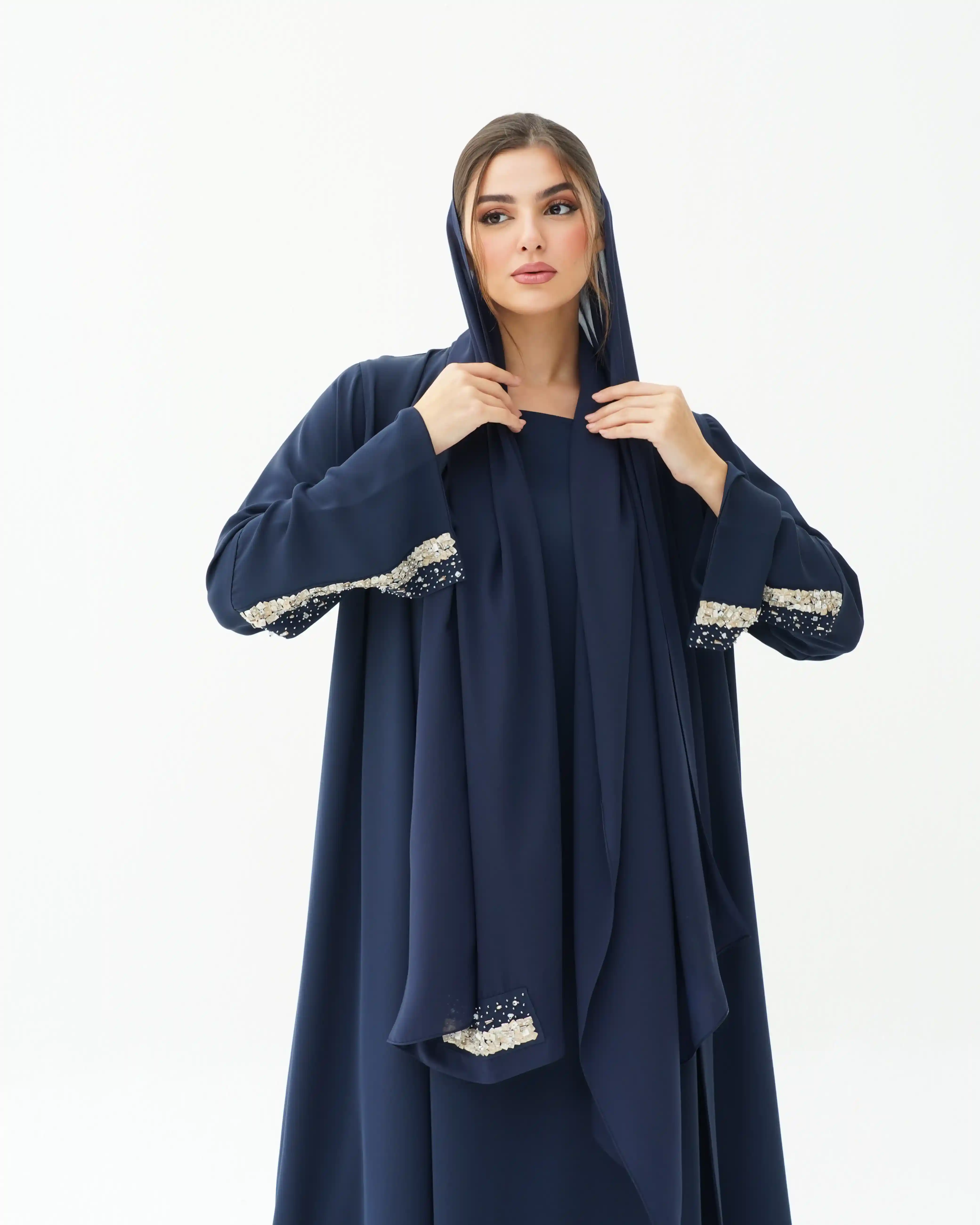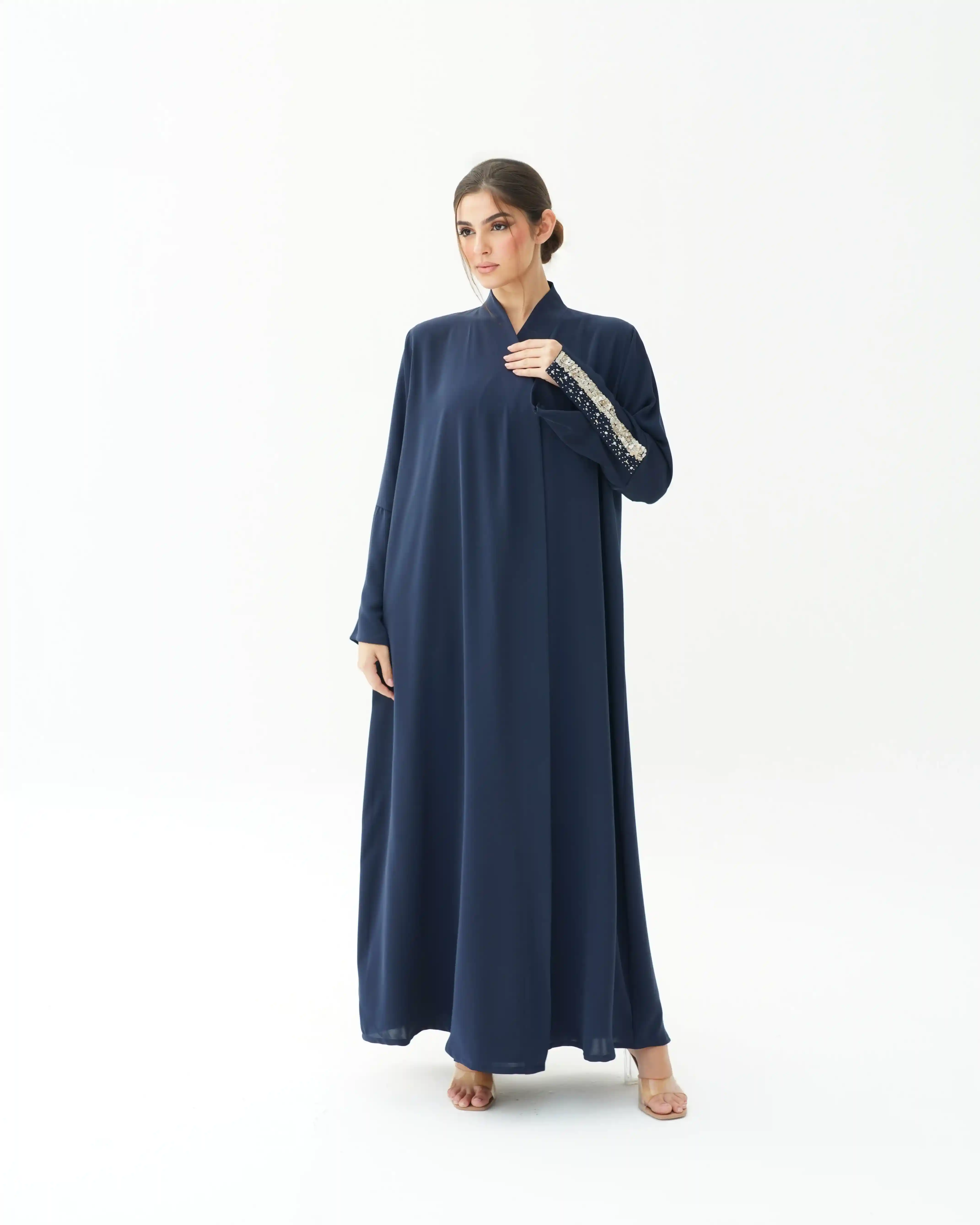 اطلالة انيقة بدون عناء لوجود قطعة فستان داخلي معها، فهذه العباية بالقصة اللف المبتكرة تأتي بنمط متداخل على شكل حرف x تلتف من خلف الرقبة بشريط ياقة الى اخر ذيل العباية وتزدان الاكمام بالسكوين بلون الشمبانيا مشتغلة يدويا ومدموجة مع كريستال وخرز لتضفي لمسة اهتمامنا بالتفاصيل الدقيقة التي من خلالها اكتسبت العلامة شهرتها الواسعة في المملكة العربية السعودية كما تتميز العباية بقماش خفيف الوزن منسدل يضفي الانسيابية المطلوبة للتصميم. ويمكن ارتداؤها مفتوحة مع الفستان الداخلي او بطريقة اللف.