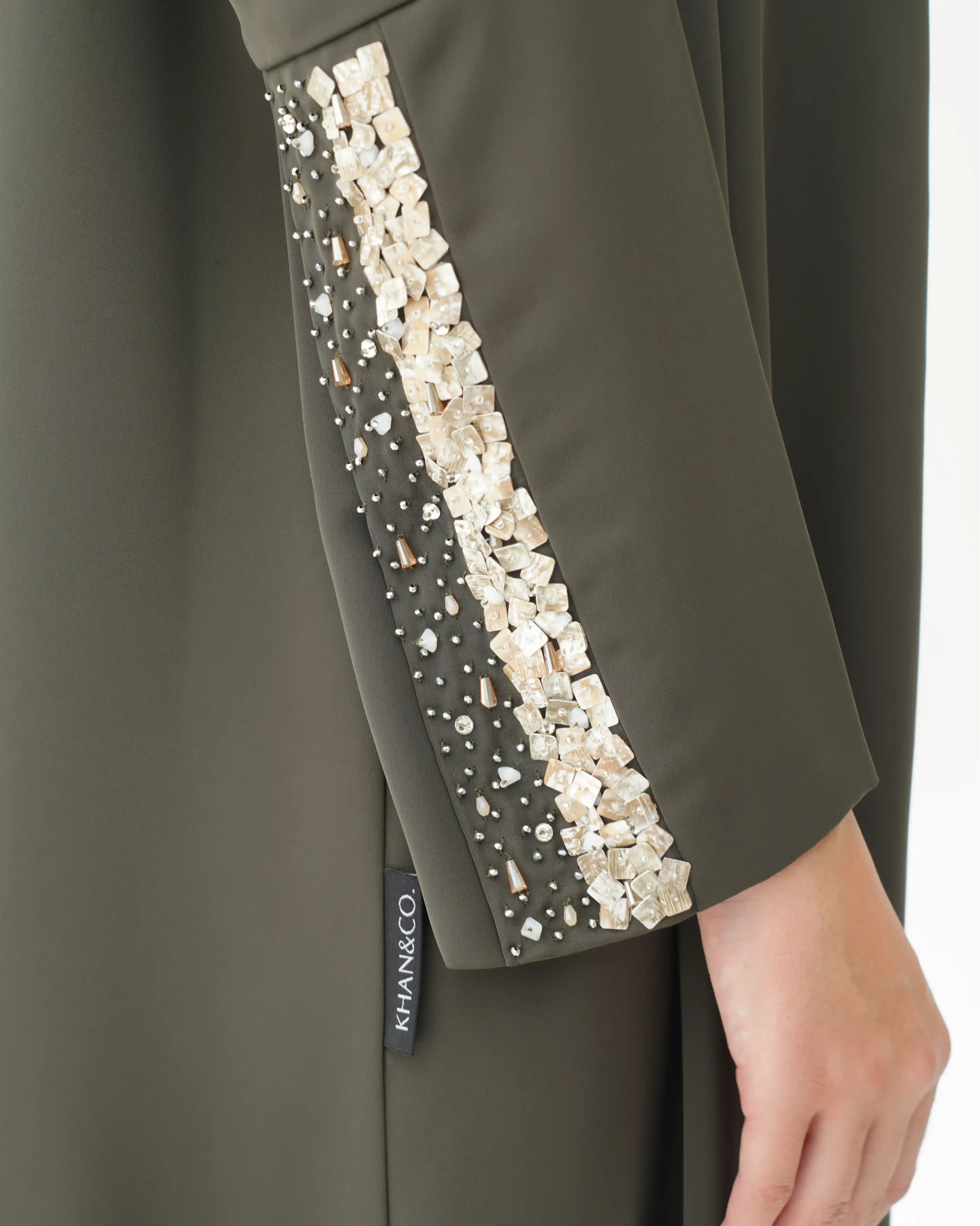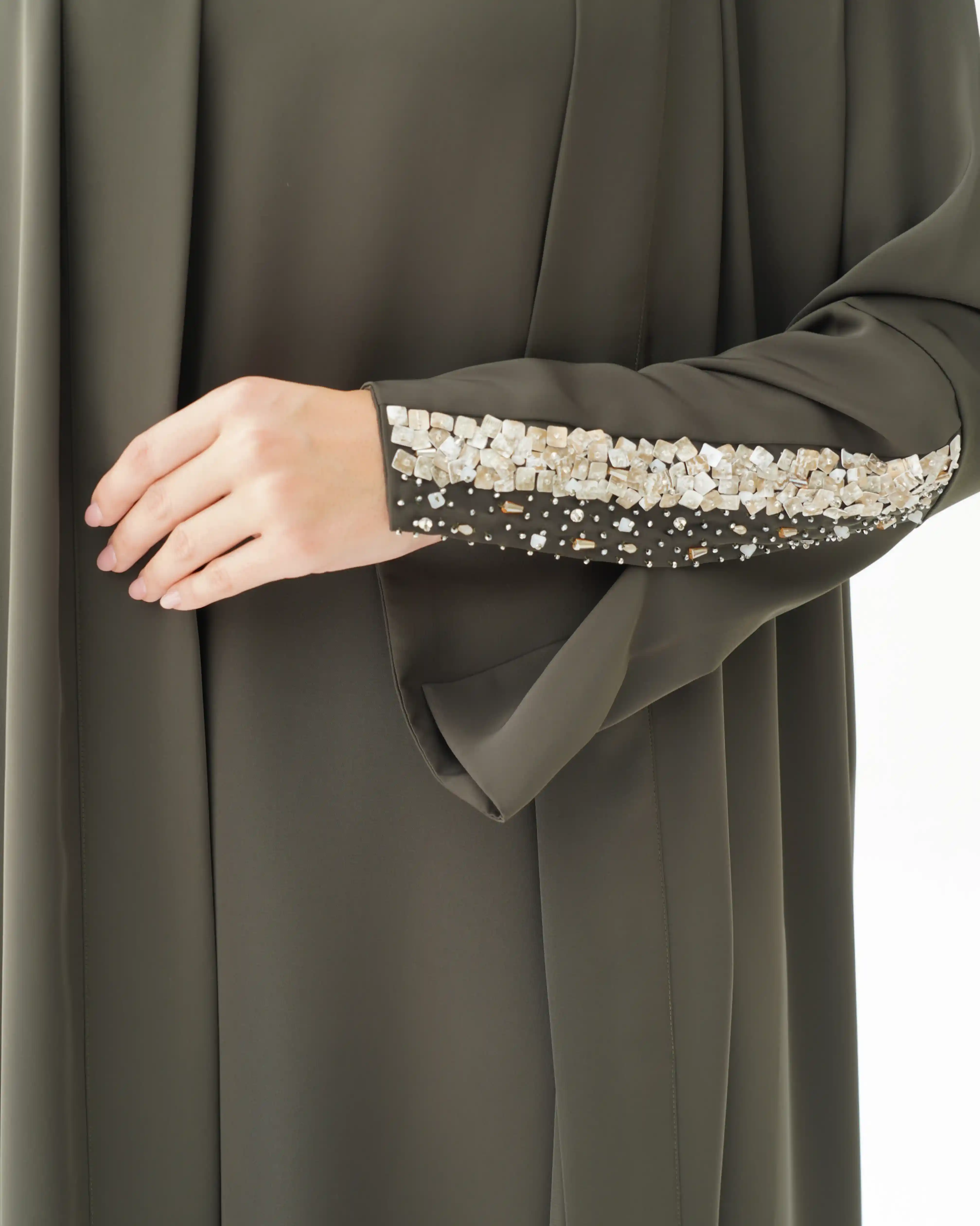 • تطريز بالسكوين بلون الشمبانيا مدموج بالكريستال بشكل يبدأ مصفوف ويتناثر تدريجيا في طرف الكم.