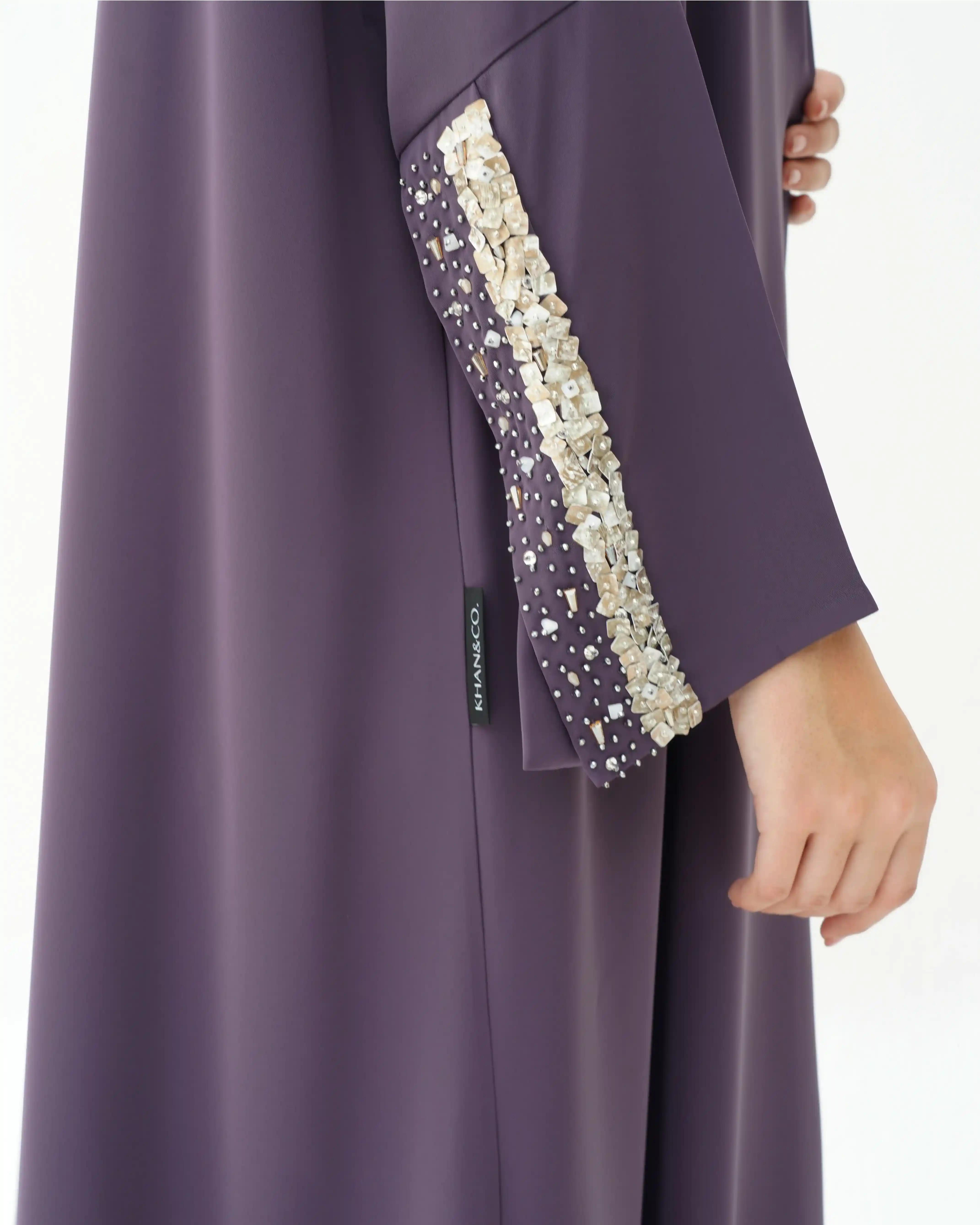 • تطريز بالسكوين بلون الشمبانيا مدموج بالكريستال بشكل يبدأ مصفوف ويتناثر تدريجيا في طرف الكم.