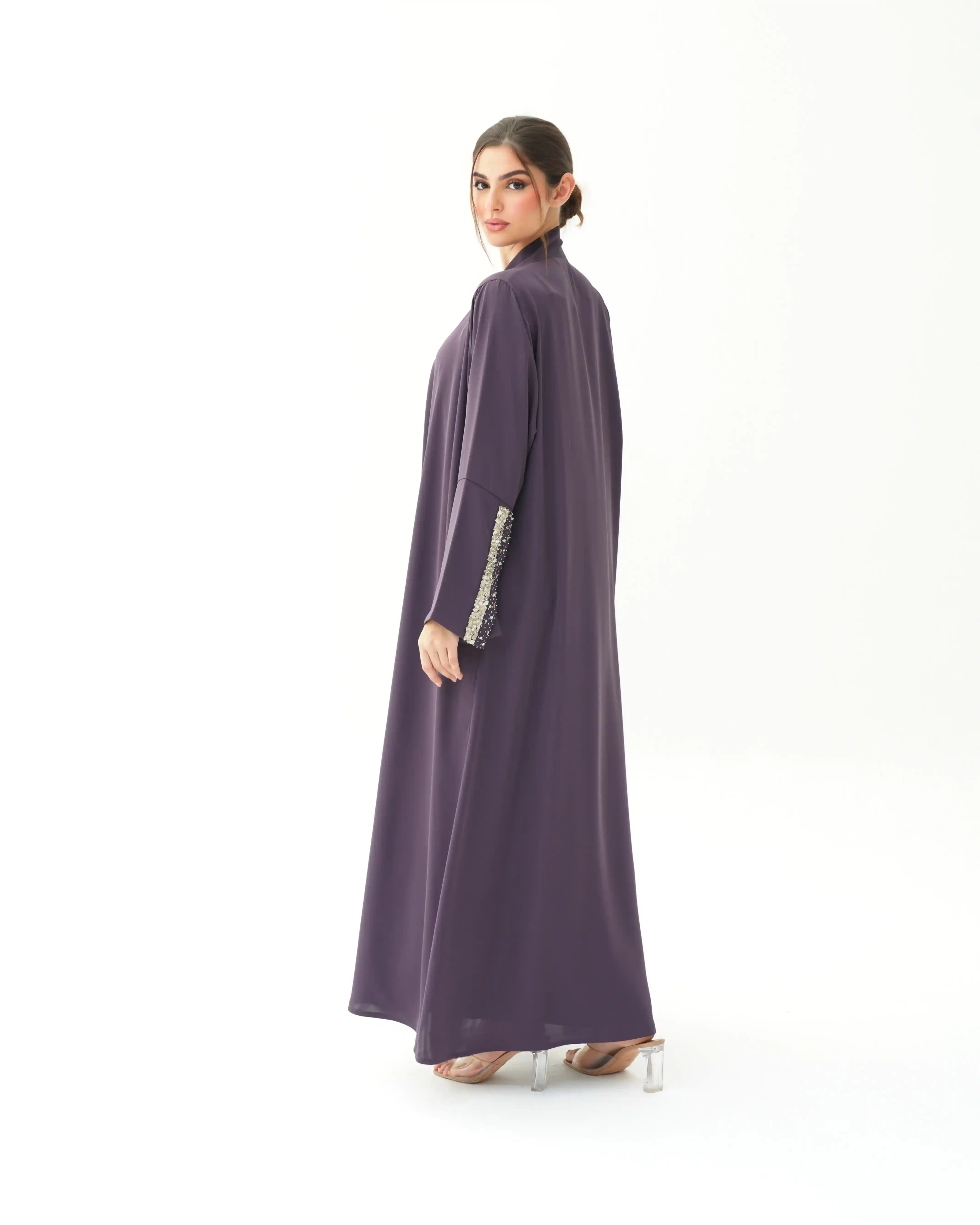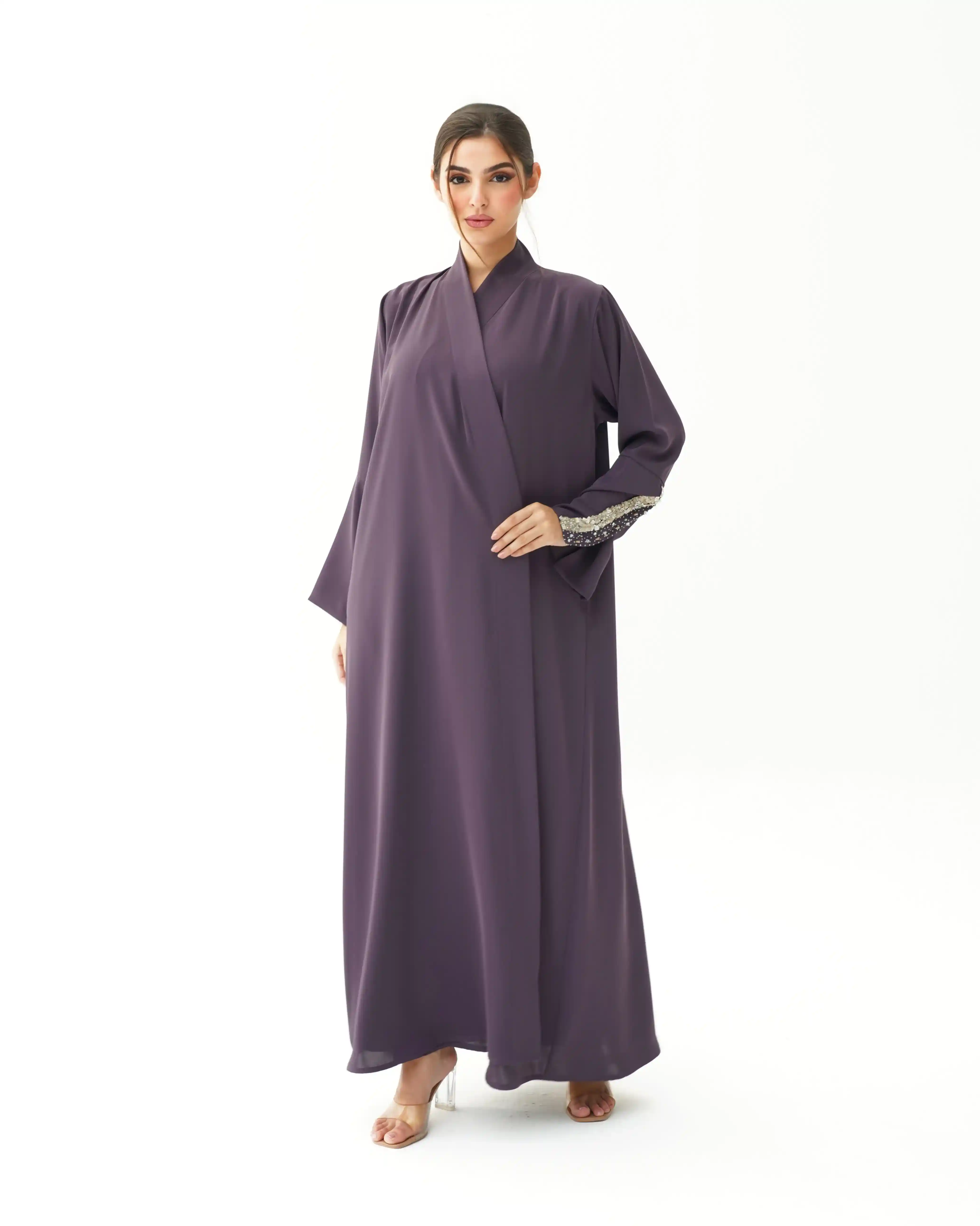 اطلالة انيقة بدون عناء لوجود قطعة فستان داخلي معها، فهذه العباية بالقصة اللف المبتكرة تأتي بنمط متداخل على شكل حرف x تلتف من خلف الرقبة بشريط ياقة الى اخر ذيل العباية وتزدان الاكمام بالسكوين بلون الشمبانيا مشتغلة يدويا ومدموجة مع كريستال وخرز لتضفي لمسة اهتمامنا بالتفاصيل الدقيقة التي من خلالها اكتسبت العلامة شهرتها الواسعة في المملكة العربية السعودية كما تتميز العباية بقماش خفيف الوزن منسدل يضفي الانسيابية المطلوبة للتصميم. ويمكن ارتداؤها مفتوحة مع الفستان الداخلي او بطريقة اللف.