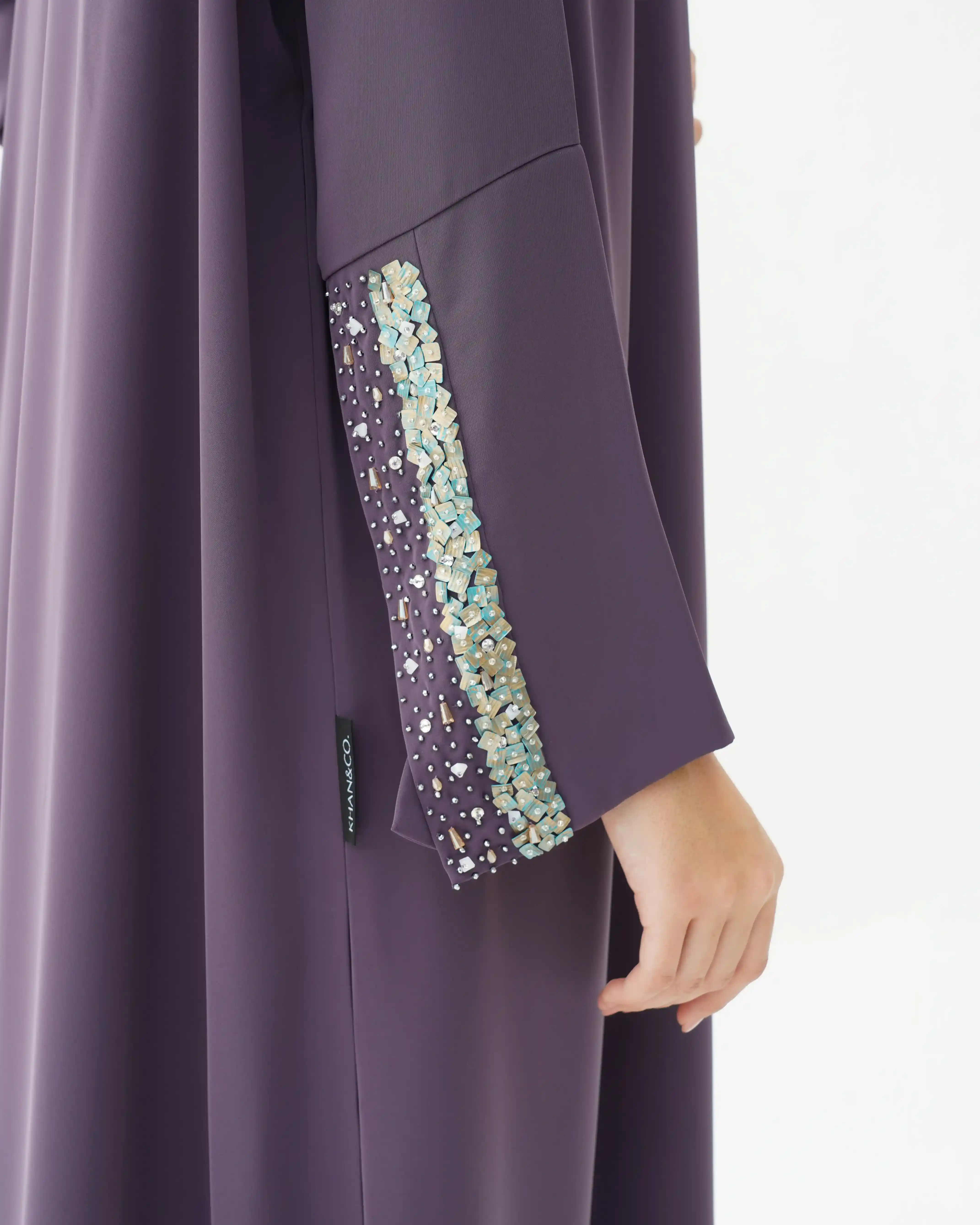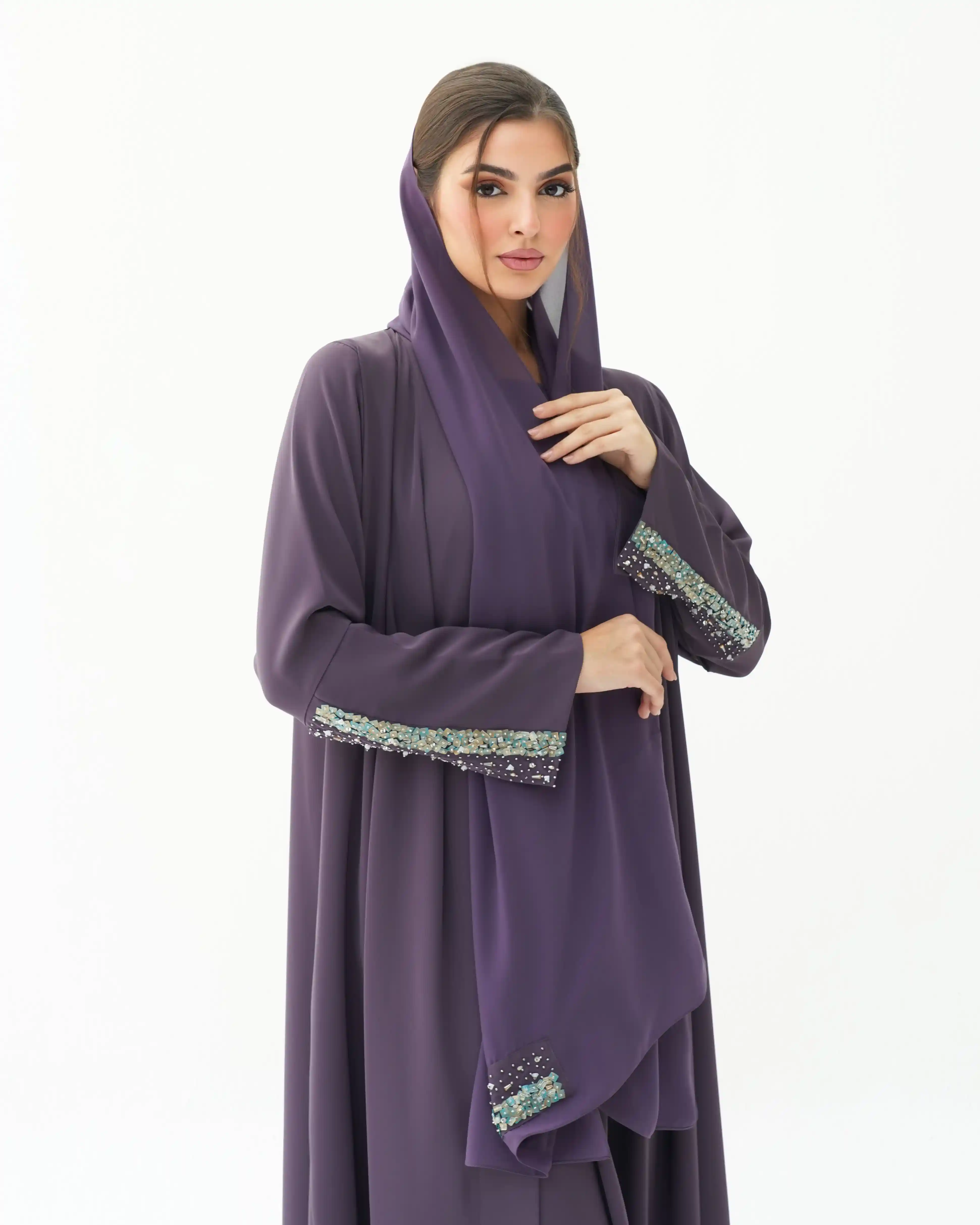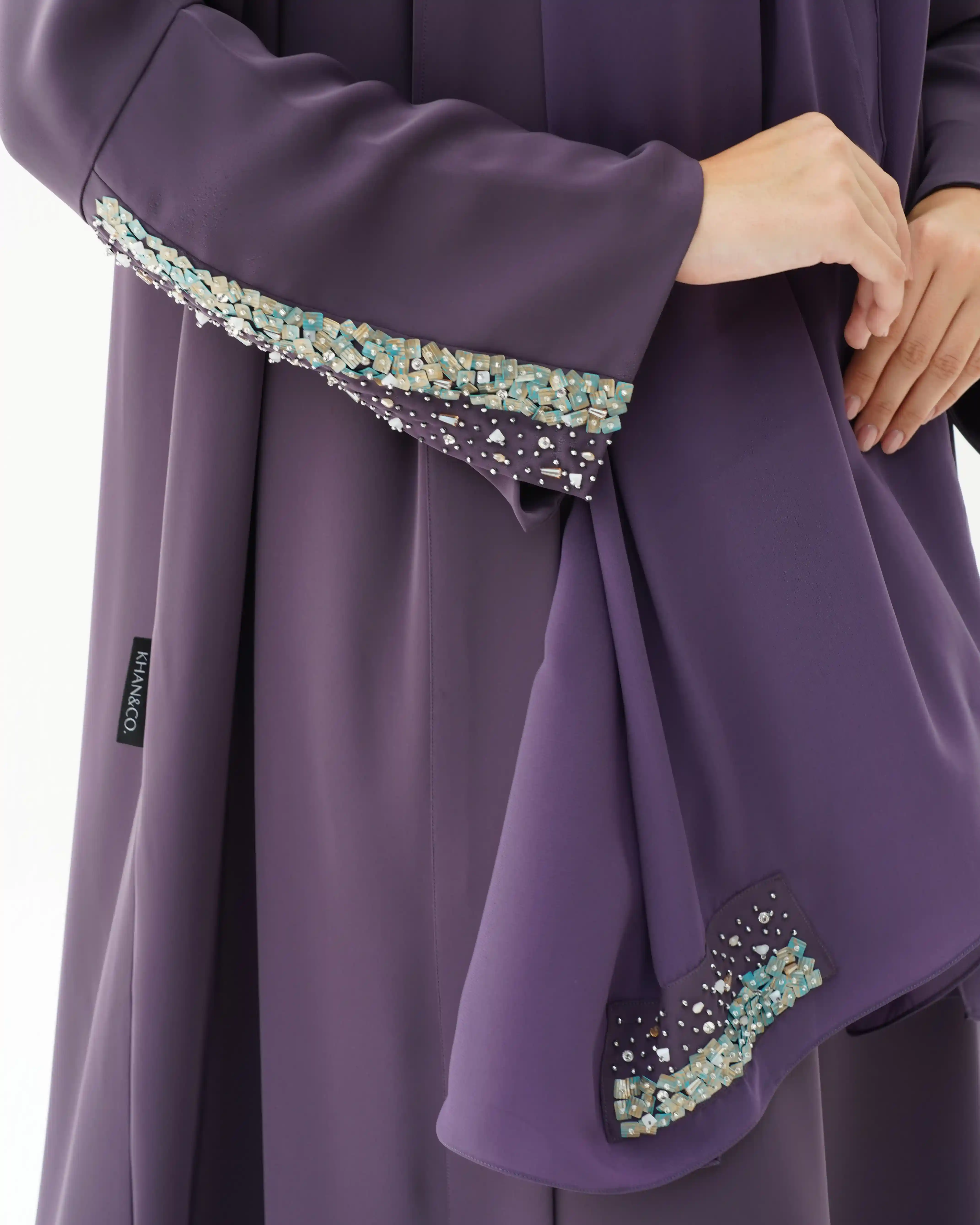 اطلالة انيقة بدون عناء لوجود قطعة فستان داخلي معها، فهذه العباية بالقصة اللف المبتكرة تأتي بنمط متداخل على شكل حرف x تلتف من خلف الرقبة بشريط ياقة الى اخر ذيل العباية وتزدان الاكمام بالسكوين بلون الذهبي اللامع مع درجات لون التيفاني مشتغلة يدويا ومدموجة مع كريستال وخرز لتضفي لمسة اهتمامنا بالتفاصيل الدقيقة التي من خلالها اكتسبت العلامة شهرتها الواسعة في المملكة العربية السعودية كما تتميز العباية بقماش خفيف الوزن منسدل يضفي الانسيابية المطلوبة للتصميم. ويمكن ارتداؤها مفتوحة مع الفستان الداخلي او بطريقة اللف.