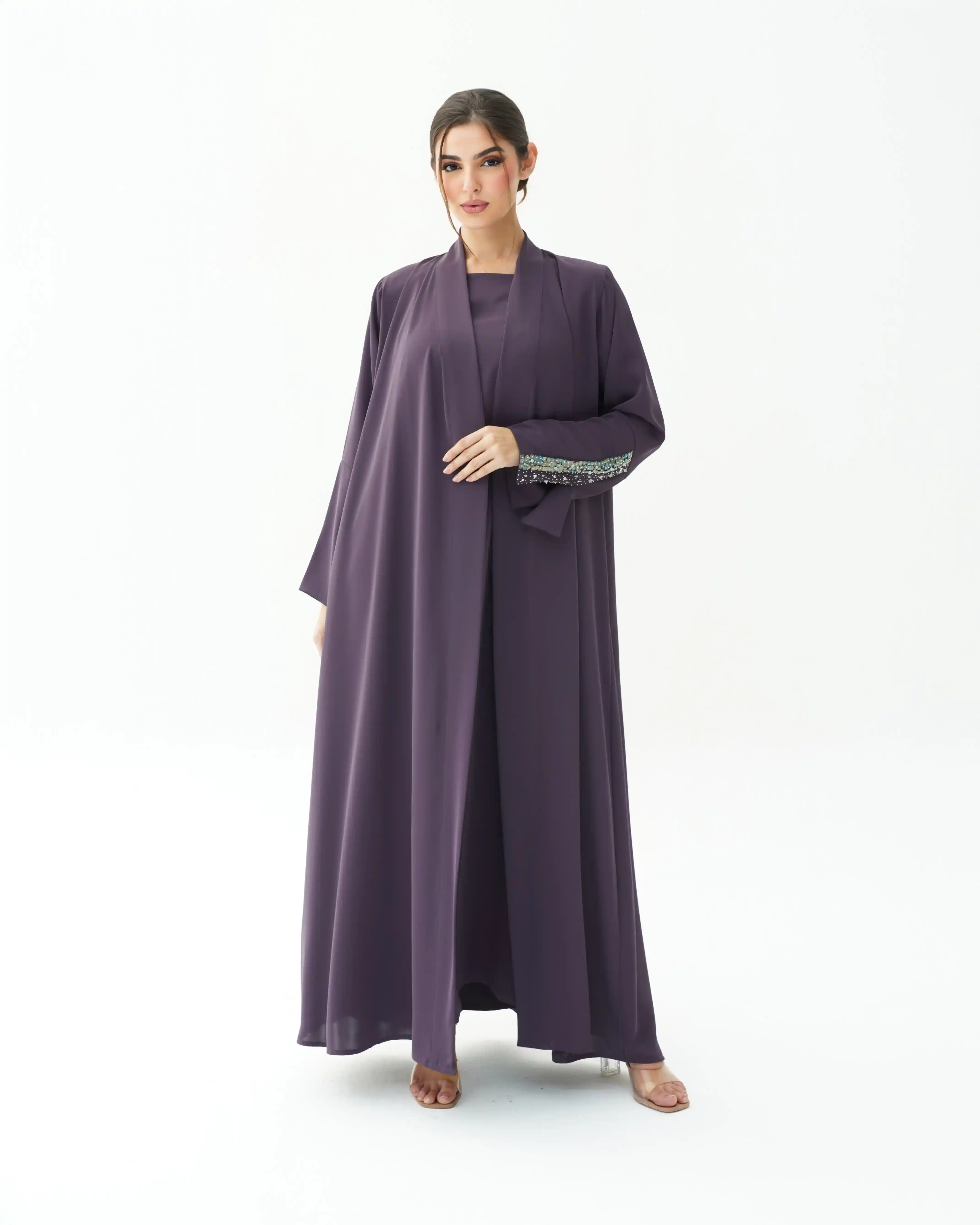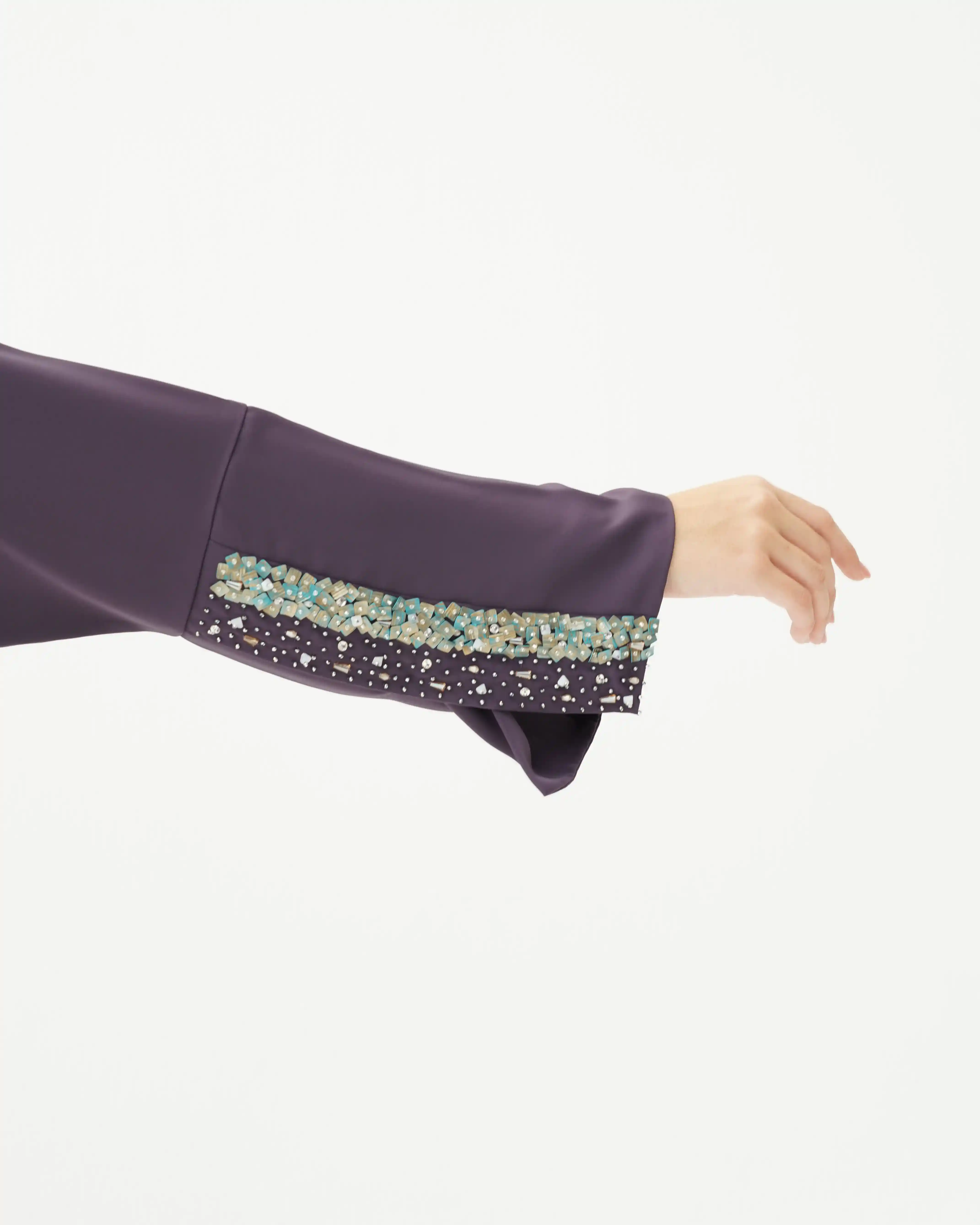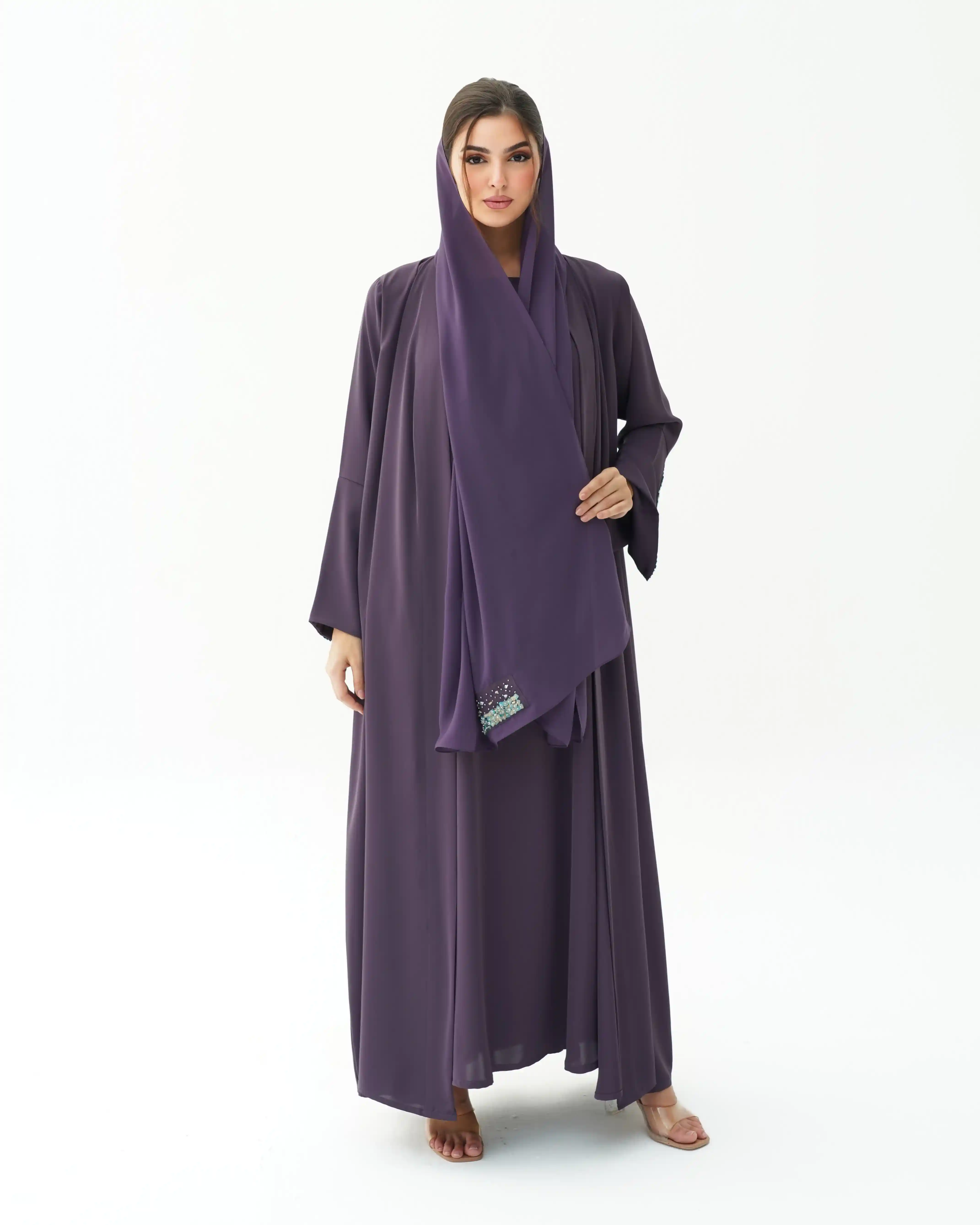 اطلالة انيقة بدون عناء لوجود قطعة فستان داخلي معها، فهذه العباية بالقصة اللف المبتكرة تأتي بنمط متداخل على شكل حرف x تلتف من خلف الرقبة بشريط ياقة الى اخر ذيل العباية وتزدان الاكمام بالسكوين بلون الذهبي اللامع مع درجات لون التيفاني مشتغلة يدويا ومدموجة مع كريستال وخرز لتضفي لمسة اهتمامنا بالتفاصيل الدقيقة التي من خلالها اكتسبت العلامة شهرتها الواسعة في المملكة العربية السعودية كما تتميز العباية بقماش خفيف الوزن منسدل يضفي الانسيابية المطلوبة للتصميم. ويمكن ارتداؤها مفتوحة مع الفستان الداخلي او بطريقة اللف.