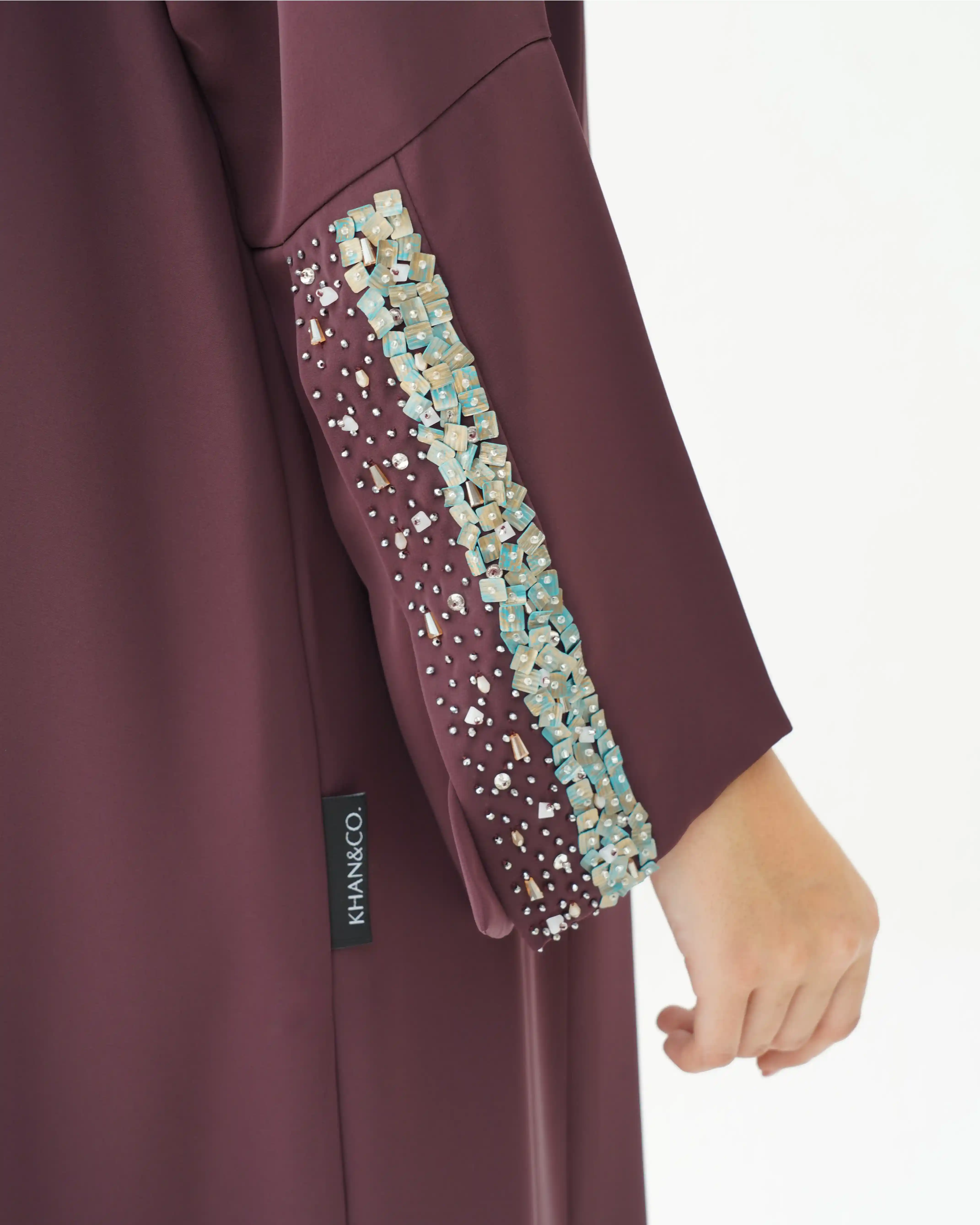 • تطريز بالسكوين بلون الذهبي اللامع مع درجات لون التيفاني مدموج بالكريستال بشكل يبدأ مصفوف ويتناثر تدريجيا في طرف الكم.