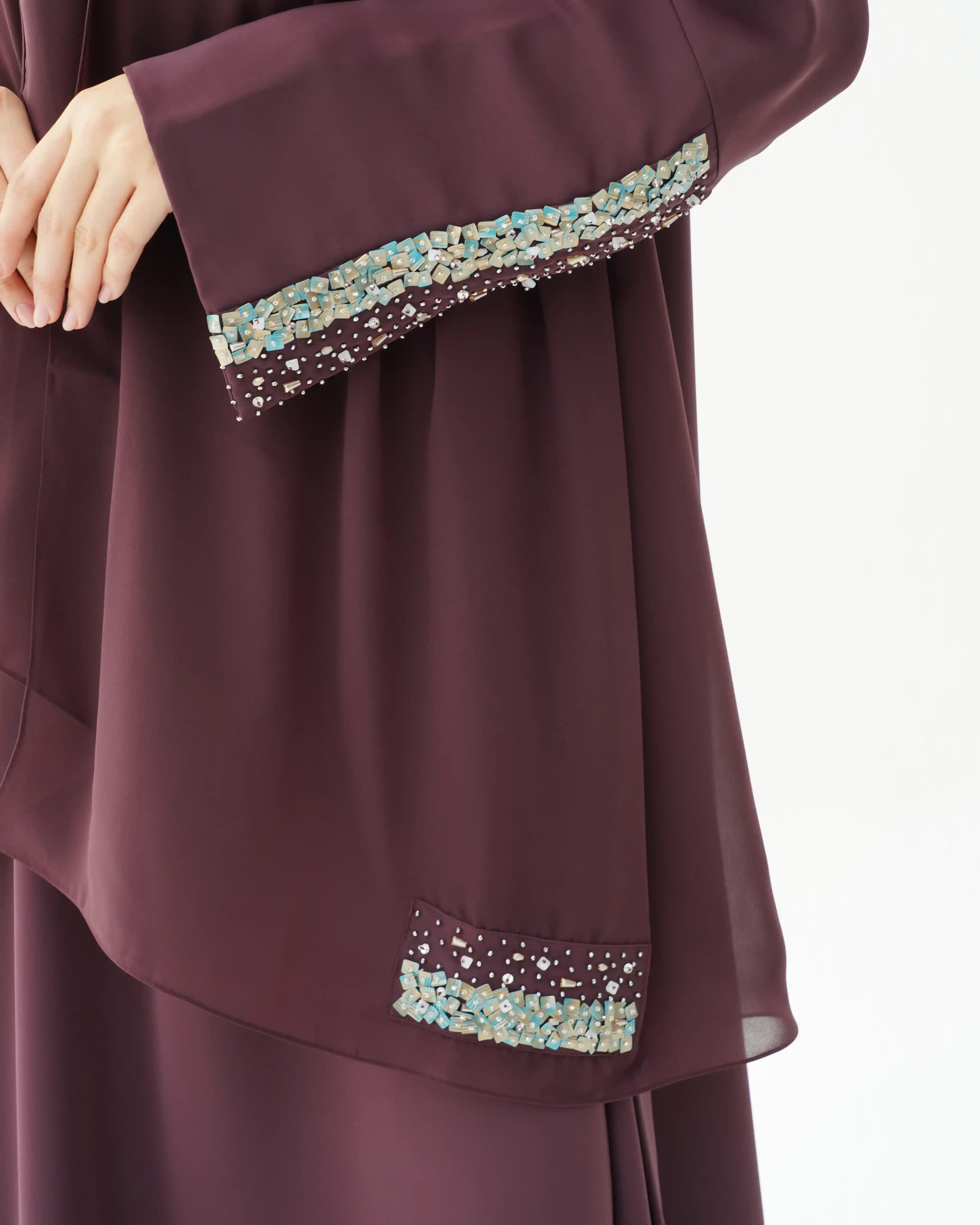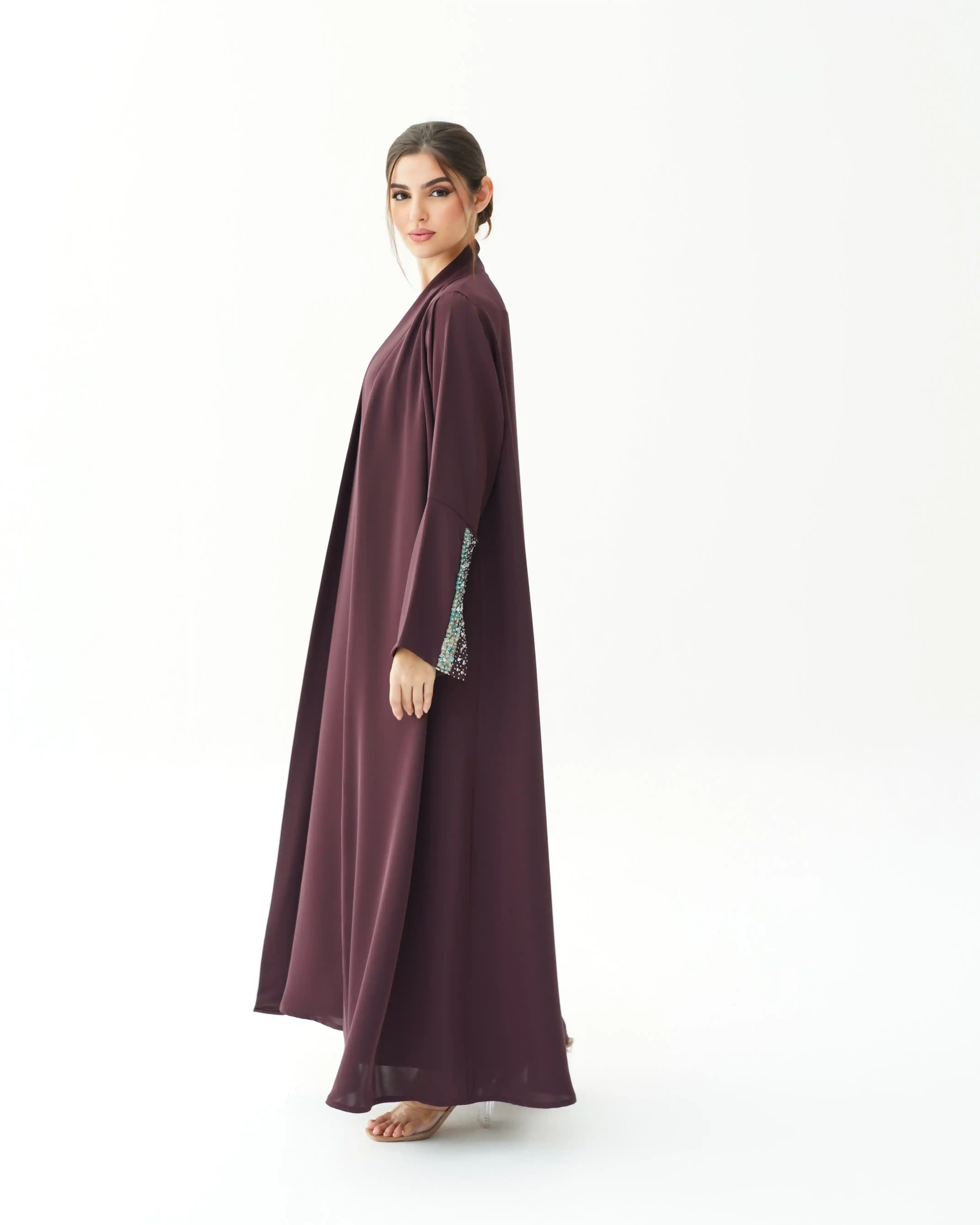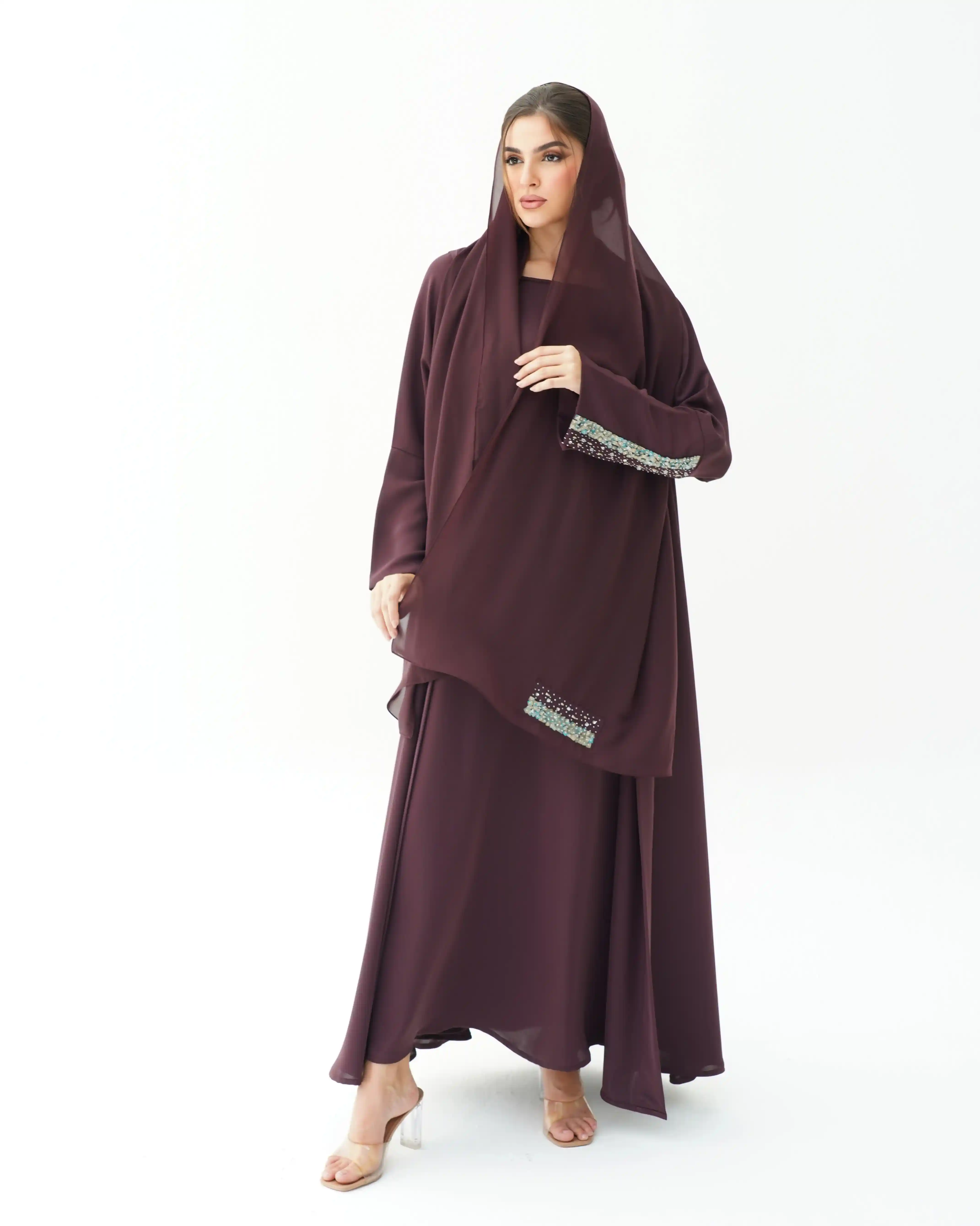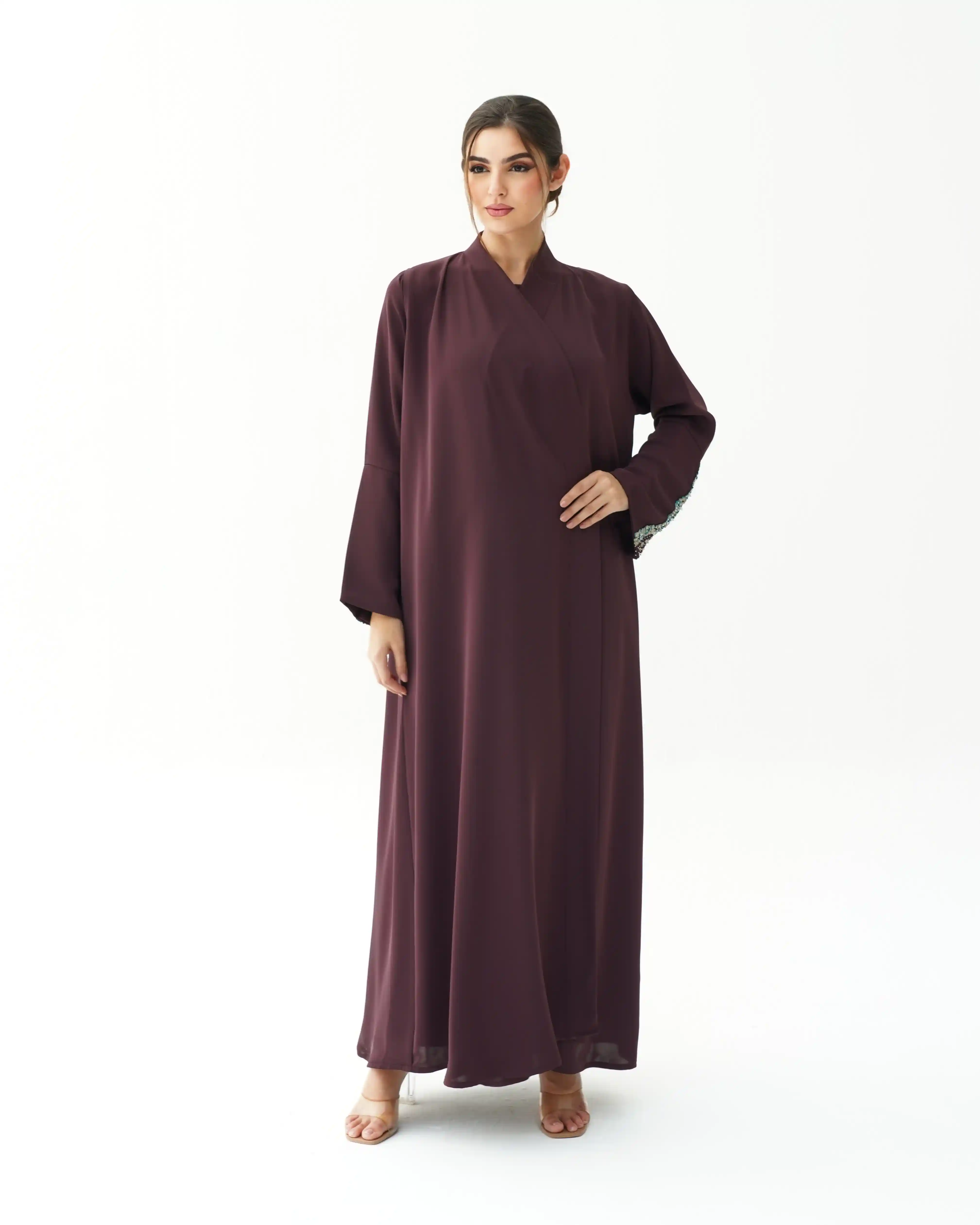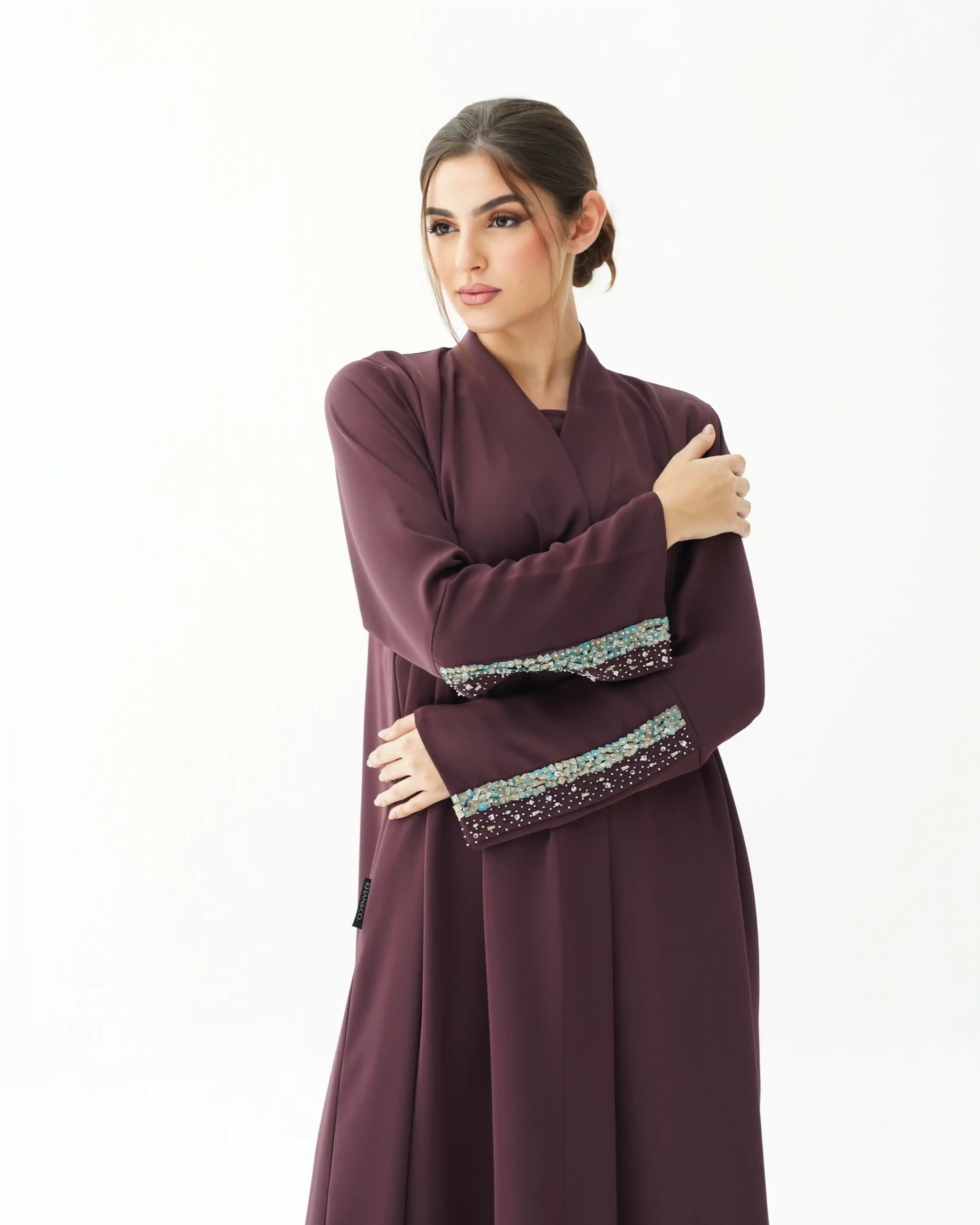 اطلالة انيقة بدون عناء لوجود قطعة فستان داخلي معها، فهذه العباية بالقصة اللف المبتكرة تأتي بنمط متداخل على شكل حرف x تلتف من خلف الرقبة بشريط ياقة الى اخر ذيل العباية وتزدان الاكمام بالسكوين بلون الذهبي اللامع مع درجات لون التيفاني مشتغلة يدويا ومدموجة مع كريستال وخرز لتضفي لمسة اهتمامنا بالتفاصيل الدقيقة التي من خلالها اكتسبت العلامة شهرتها الواسعة في المملكة العربية السعودية كما تتميز العباية بقماش خفيف الوزن منسدل يضفي الانسيابية المطلوبة للتصميم. ويمكن ارتداؤها مفتوحة مع الفستان الداخلي او بطريقة اللف.