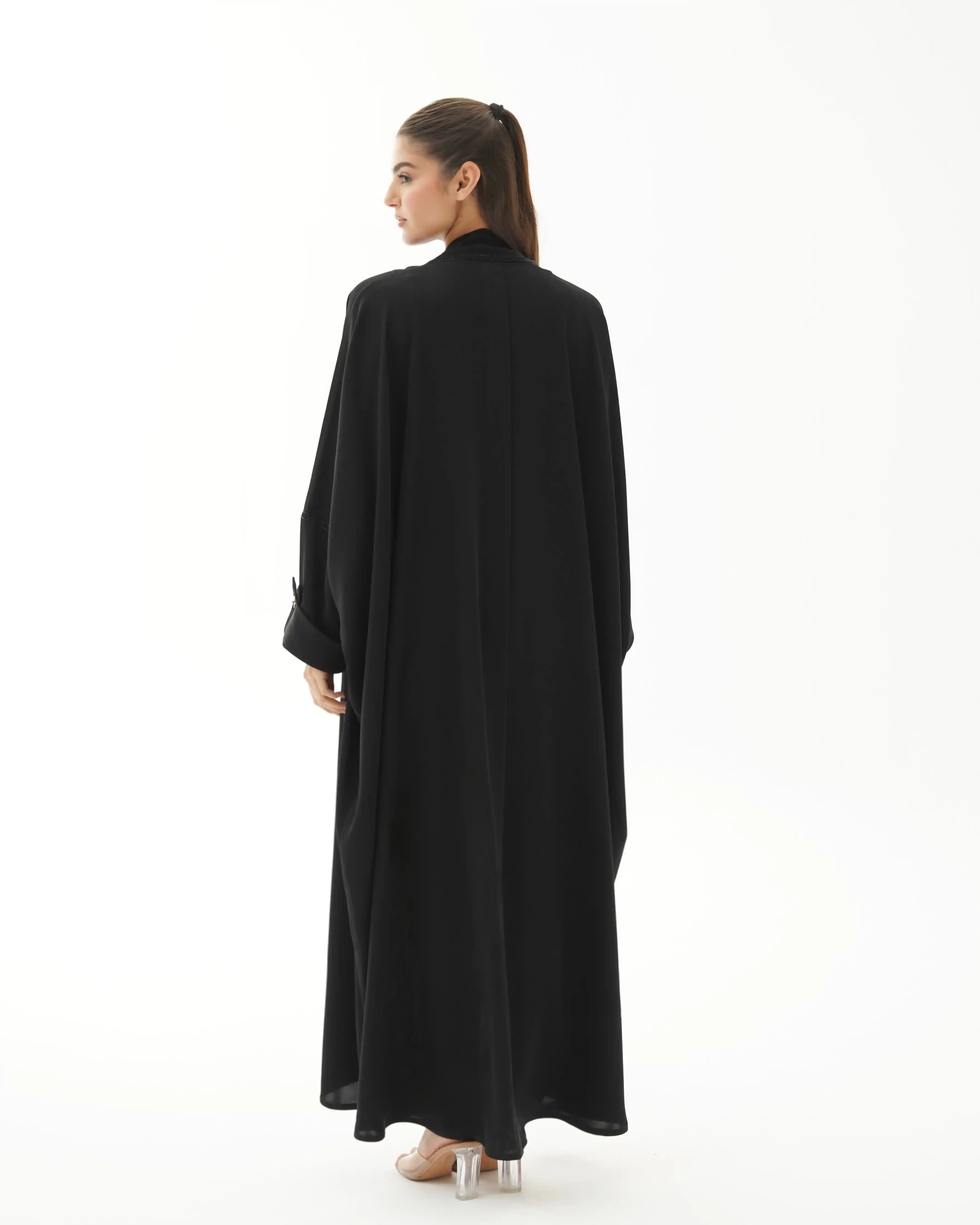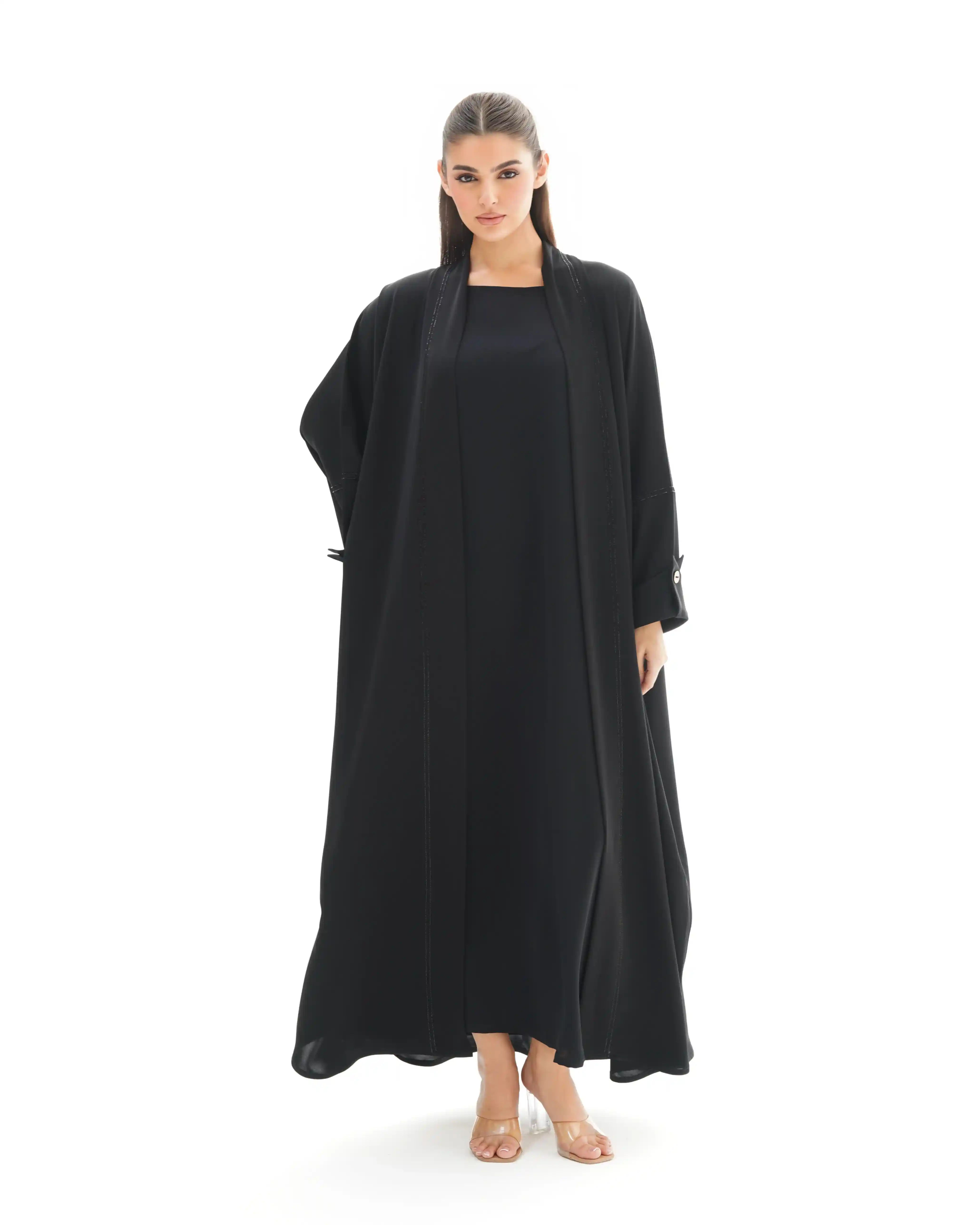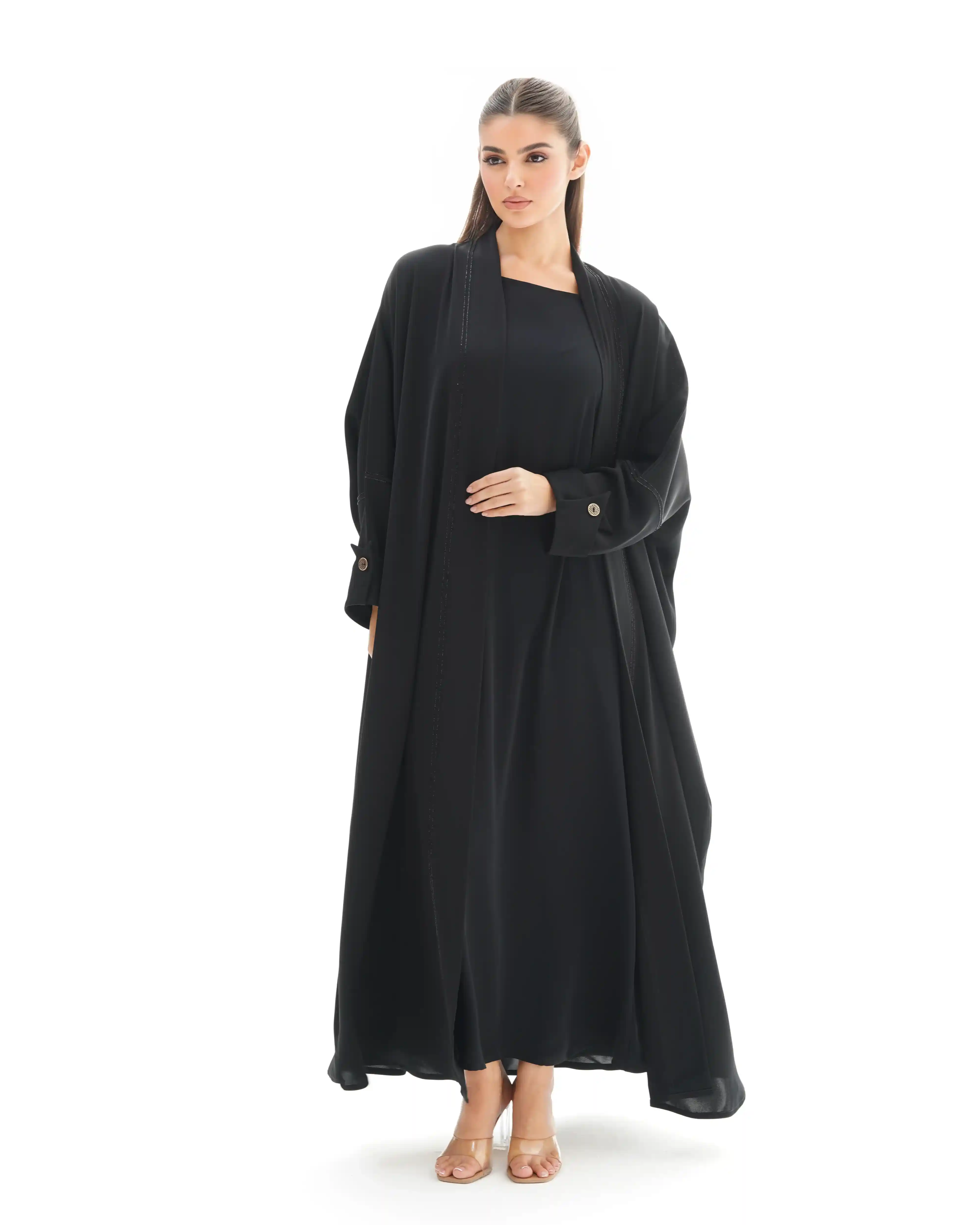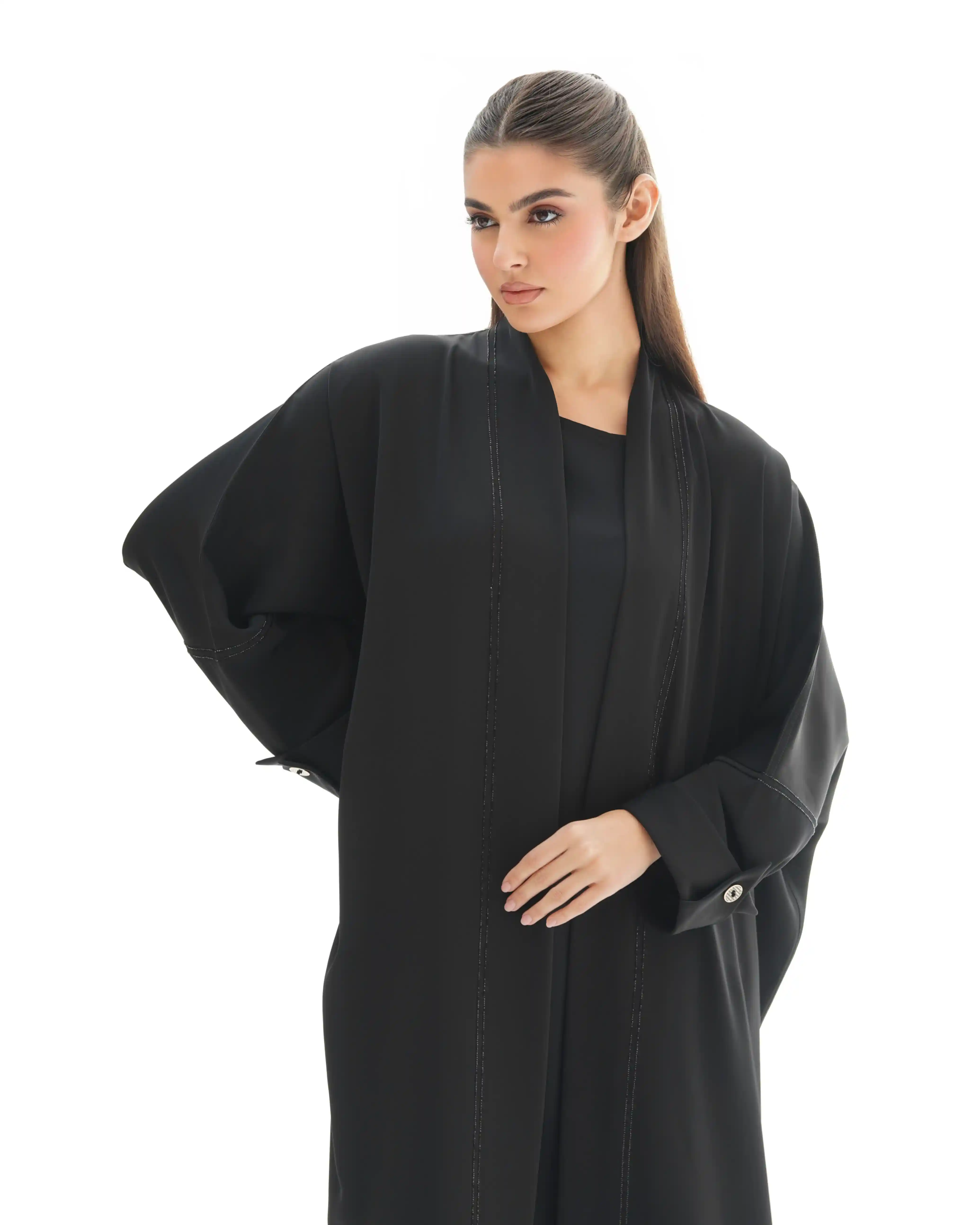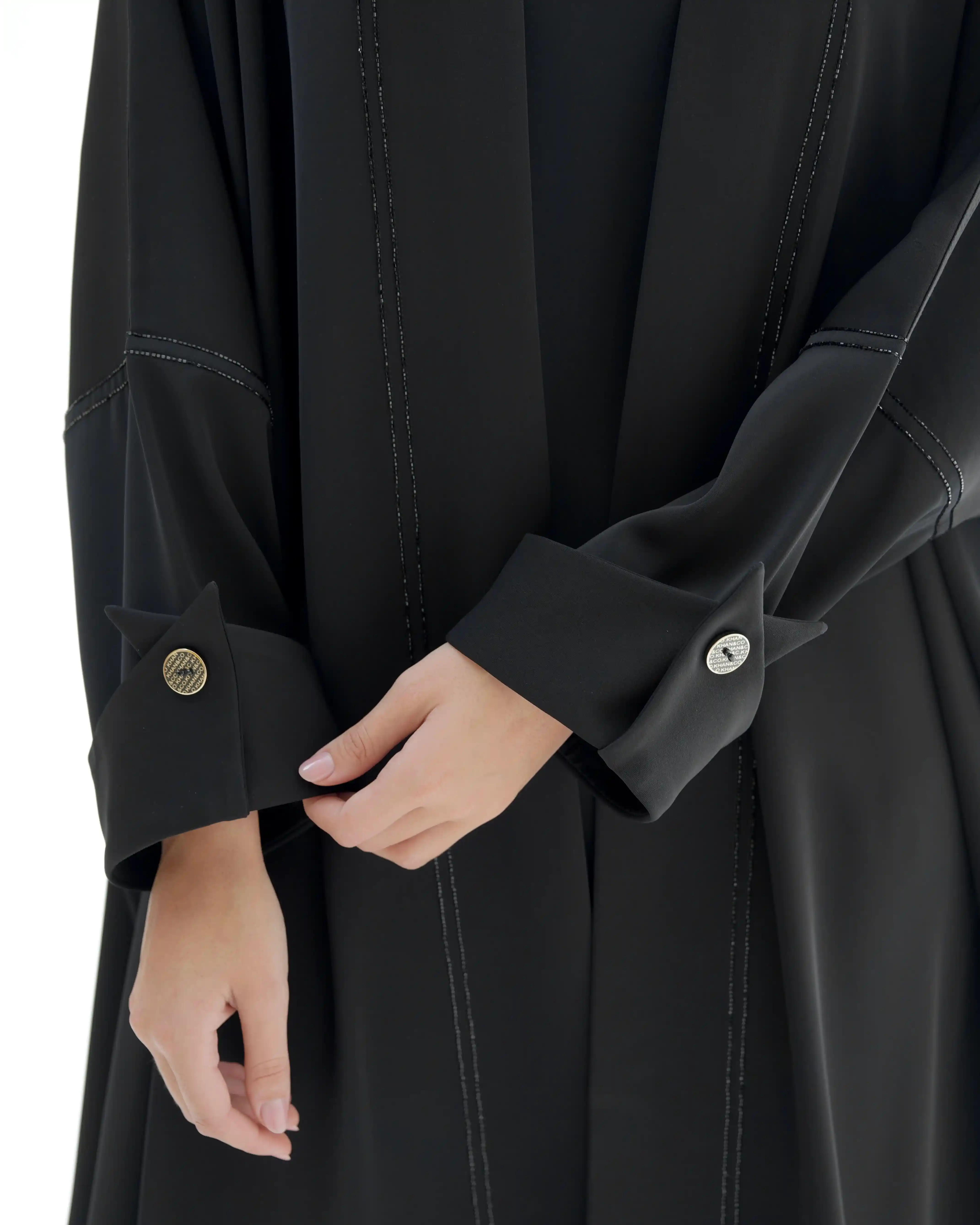 تضيف التفاصيل الأنيقة لمسة عصرية جذابة إلى هذه العباية المصنوعة من قماش الكريب الخفيف والمنسدل مما يمنحها إطلالة مفضلة كلاسيكية ،اكتملت بخطوط دقيقة وناعمة من الخرز الاسود اللامع تبدأ من خلف شريط الرقبة إلى اسفل ذيل العباية وتزدان الأكمام بقلبة قماش وقصة مستوحاة من كلاسيكيات الازياء الفرنسية وبإزرار بعلامة .KHAN&CO الايقونية مثبته بحبات من الخرز الاسود.