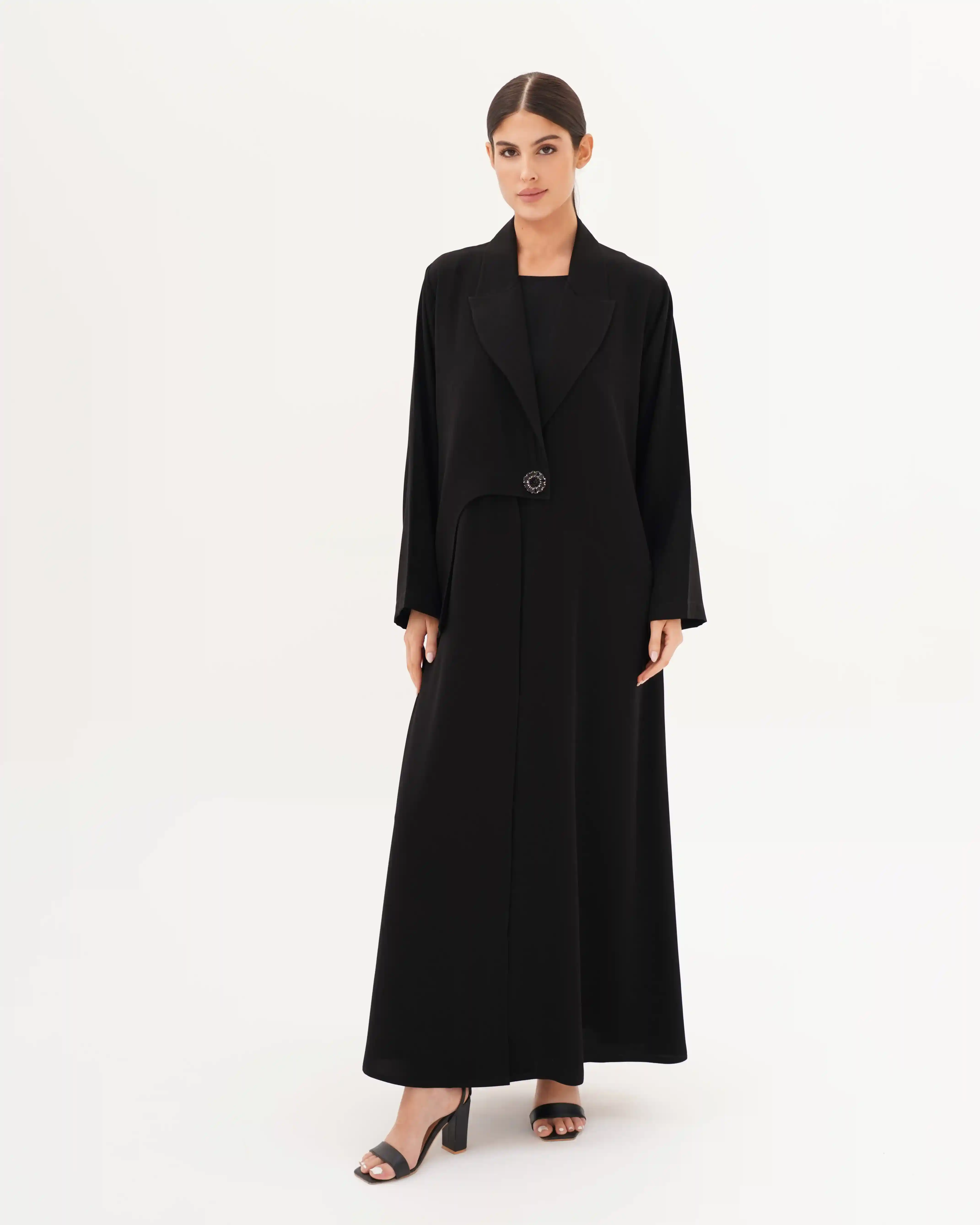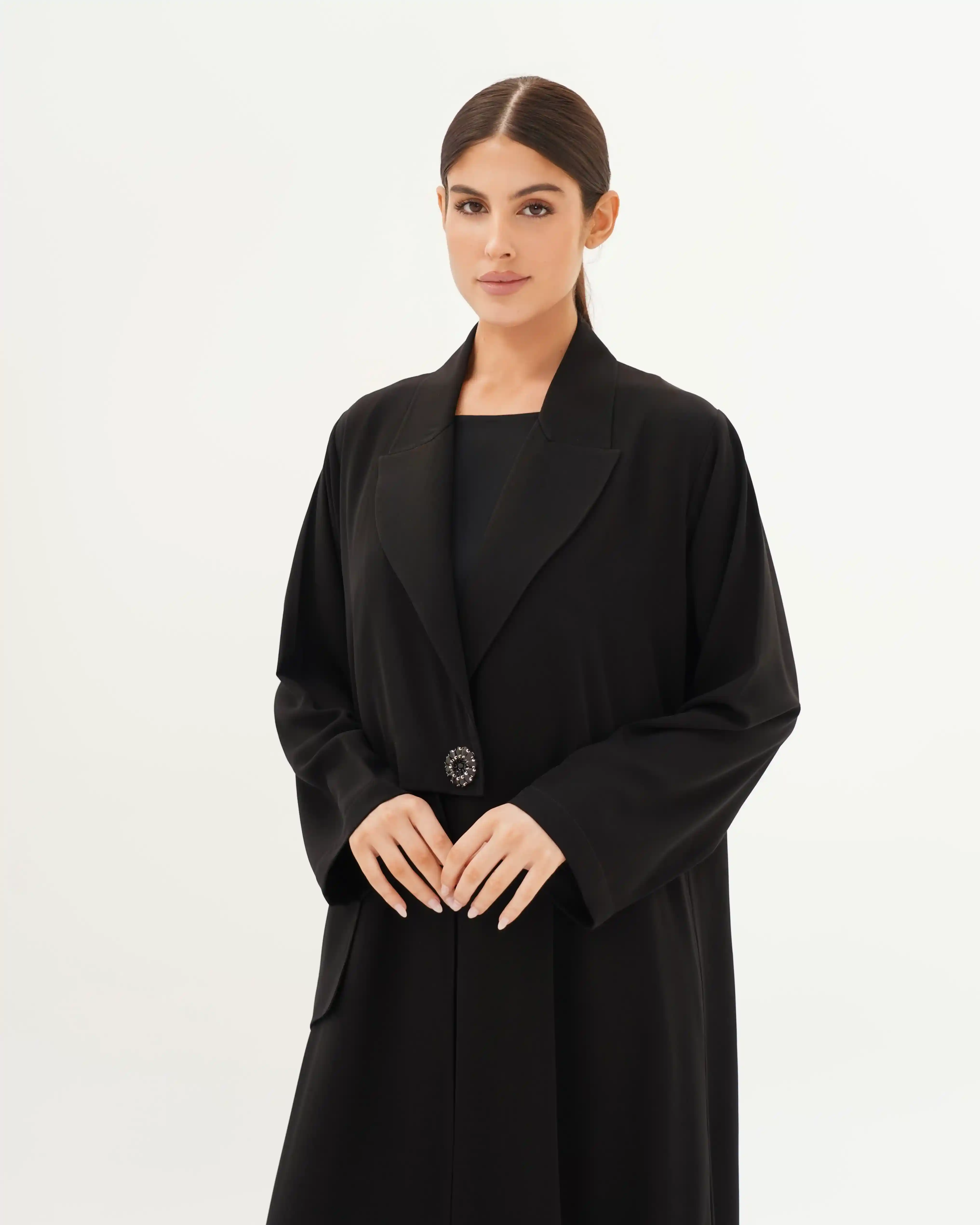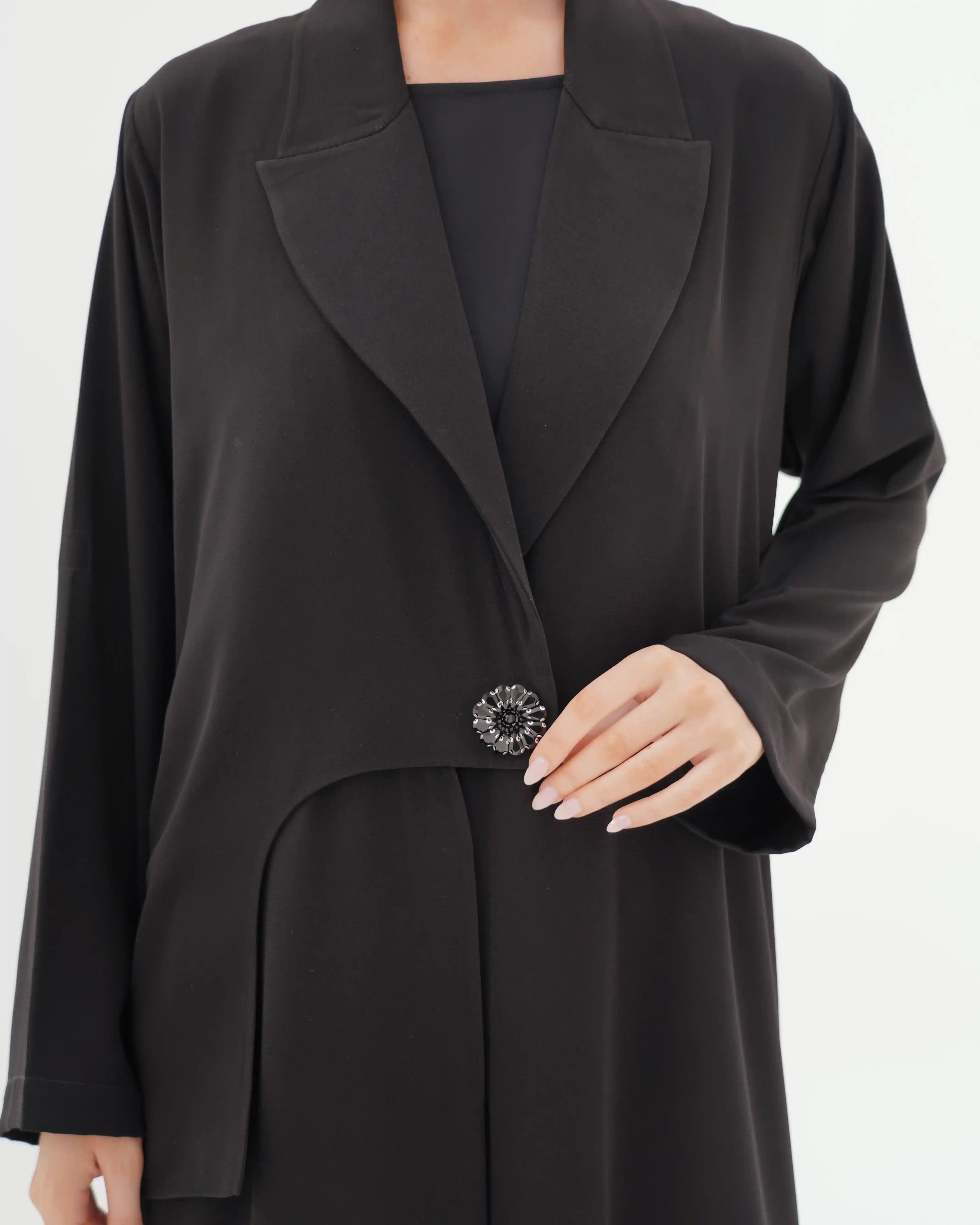 عباية بتصميم أنيق يقوم على نقاء الخطوط وفخامة التفاصيل الهادئة، تنسدل بقصّة مستقيمة بانسيابية متوازنة. صُنعت من قماش سلكتف كريب بملمس ناعم وانسدال خفيف يعزّز رقي الإطلالة. يتميّز التصميم بعنصر كريستالي دائري منفرد على الصدر، مستوحى من شكل زهرة دقيقة بلمعة معدنية راقية، يمنح العباية توقيعًا بصريًا واضحًا دون مبالغة. تأتي بياقة بليزر ناعمة بخطوط مستقيمة مفتوحة مع إغلاق مخفي، تحافظ على بساطة التصميم وتبرز جمال التفاصيل بدقة وأناقة.