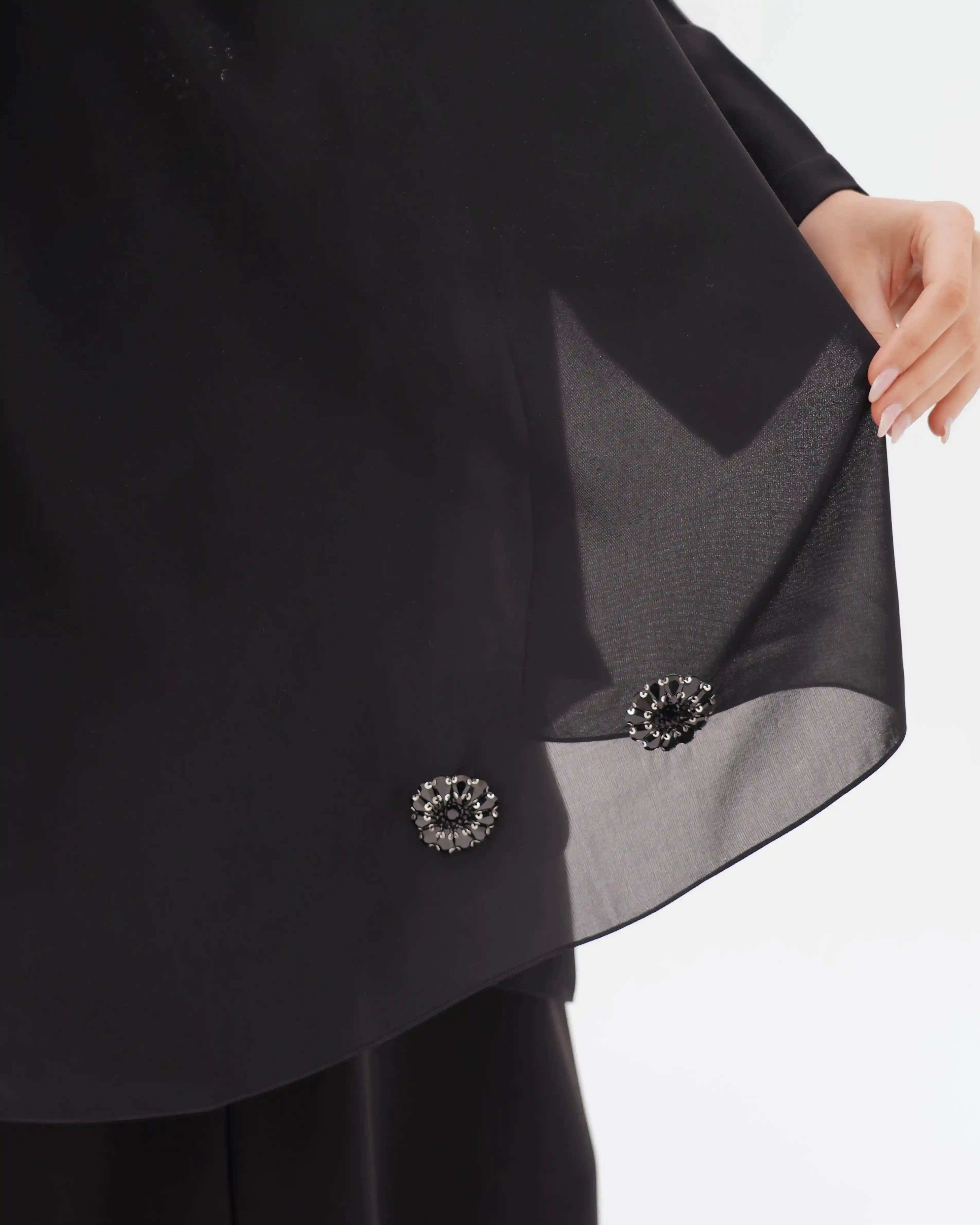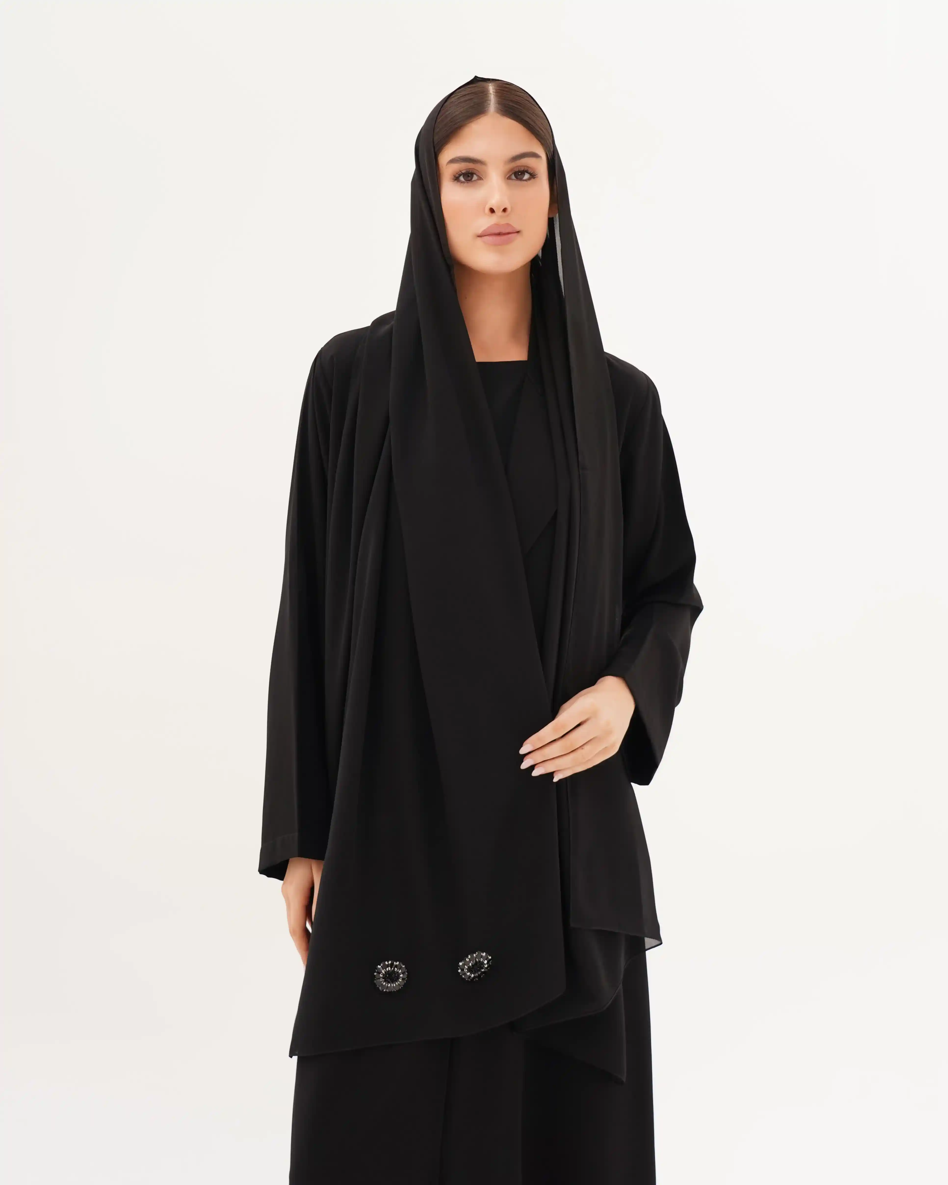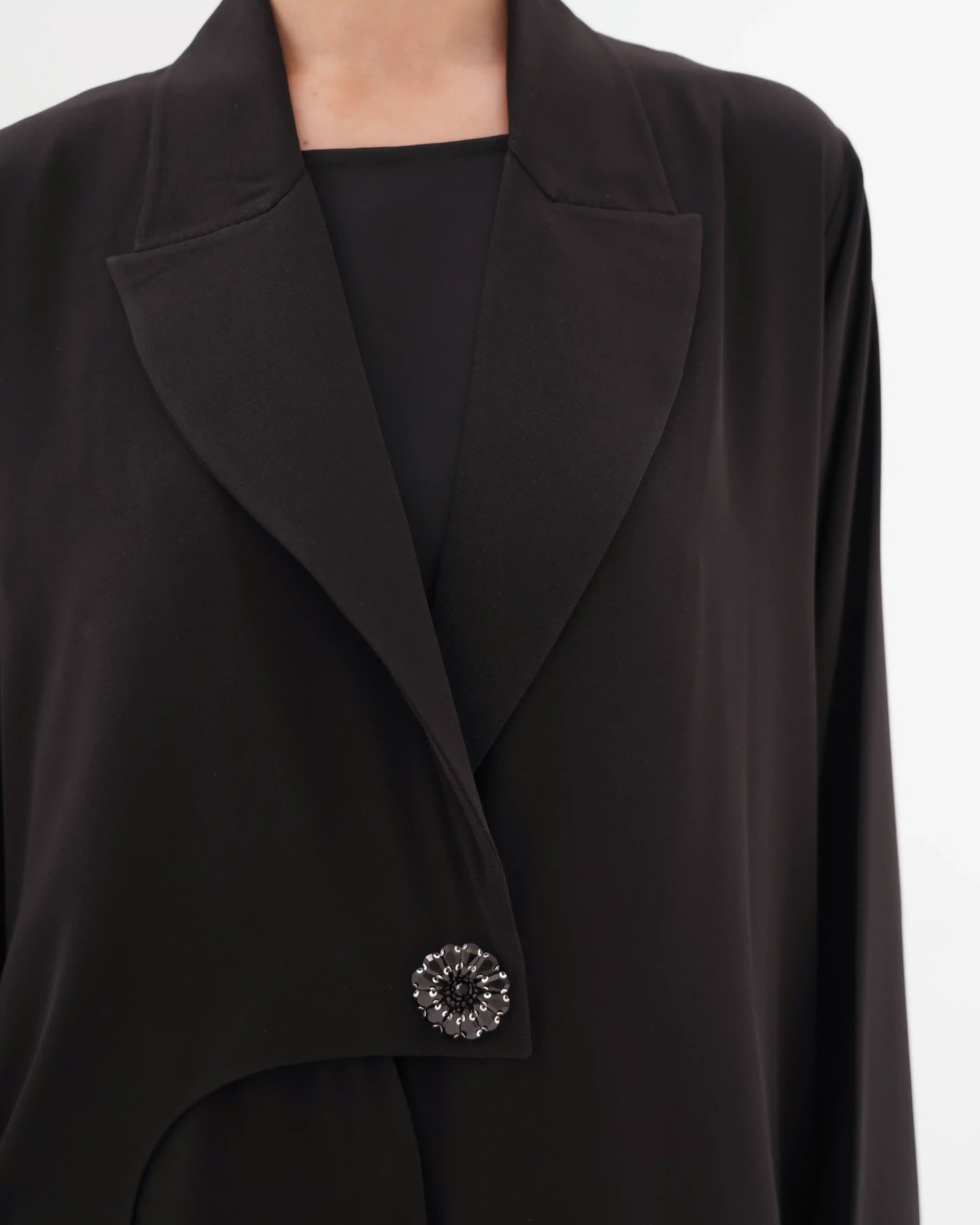 عباية بتصميم أنيق يقوم على نقاء الخطوط وفخامة التفاصيل الهادئة، تنسدل بقصّة مستقيمة بانسيابية متوازنة. صُنعت من قماش سلكتف كريب بملمس ناعم وانسدال خفيف يعزّز رقي الإطلالة. يتميّز التصميم بعنصر كريستالي دائري منفرد على الصدر، مستوحى من شكل زهرة دقيقة بلمعة معدنية راقية، يمنح العباية توقيعًا بصريًا واضحًا دون مبالغة. تأتي بياقة بليزر ناعمة بخطوط مستقيمة مفتوحة مع إغلاق مخفي، تحافظ على بساطة التصميم وتبرز جمال التفاصيل بدقة وأناقة.
